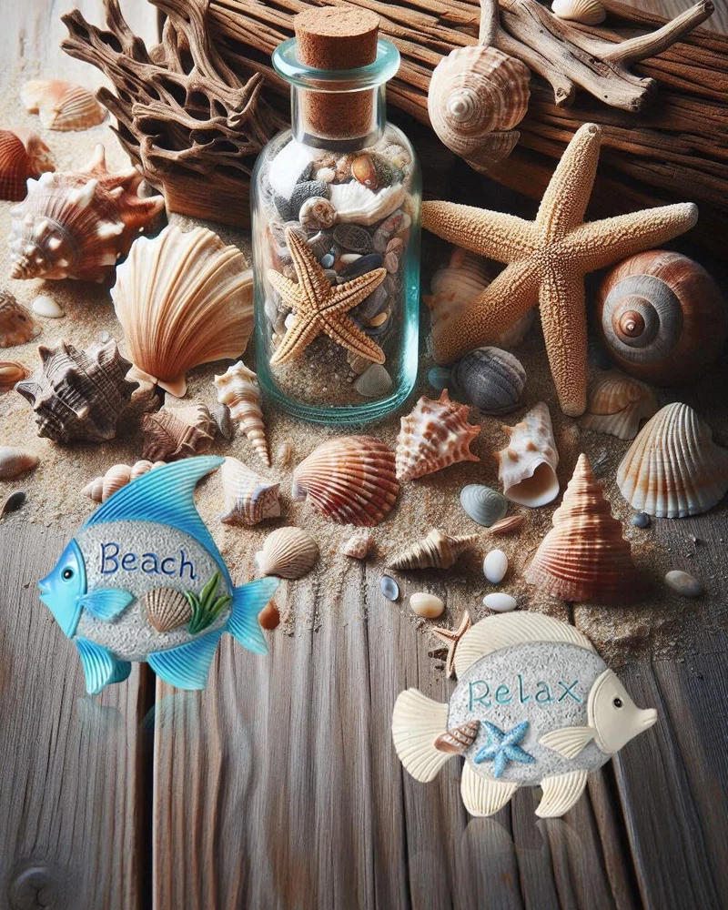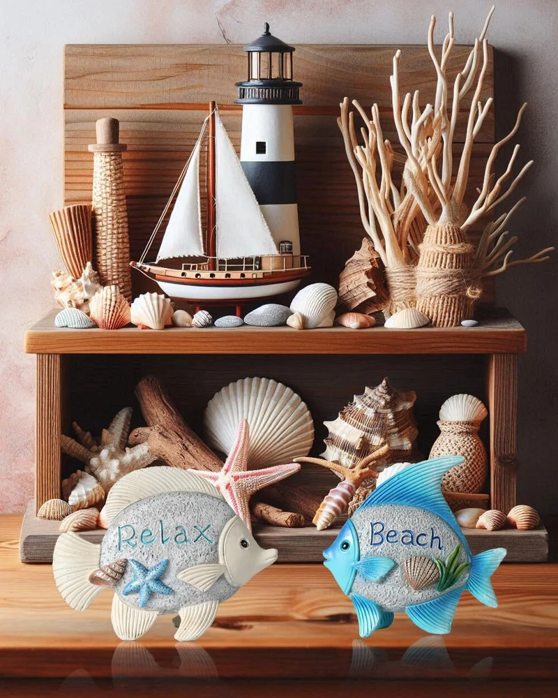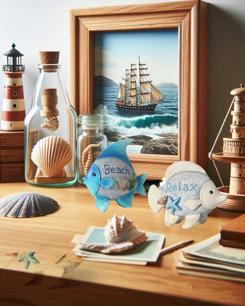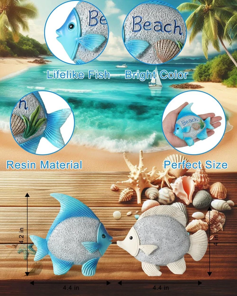 Premium Quality Material: Crafted from durable resin, ensuring a long-lasting decorative piece that withstands the test of time. Charming Design: Features fish figurines with intricate detailing, adorned with the word “Beach” and the other with “Relax,” adding a serene touch to your space. Versatile Decor: Ideal for enhancing a coastal-themed room, beach house, bathroom, or as part of a nautical collection display. Thoughtful Gift Idea: A delightful present for friends and family who appreciate seaside aesthetics or are looking to add to their nautical decor. Easy to Display: These lightweight resin fish can be placed on shelves, mantels, or desks without needing additional support or installation. Unique Textural Elements: Embellished with realistic textures and adorned with seashell and starfish accents for an authentic oceanic feel. Perfect Dimensions: Each figurine measures at an ideal size of 4.4 inches in length and 4.2 inches in height, suitable for various display settings.