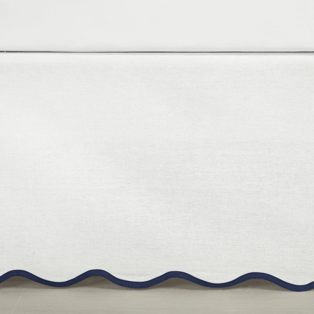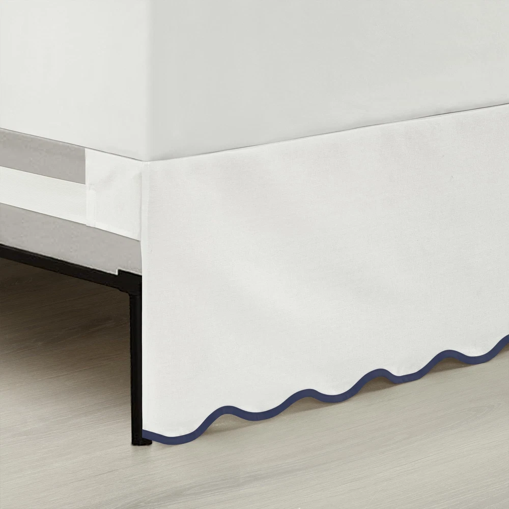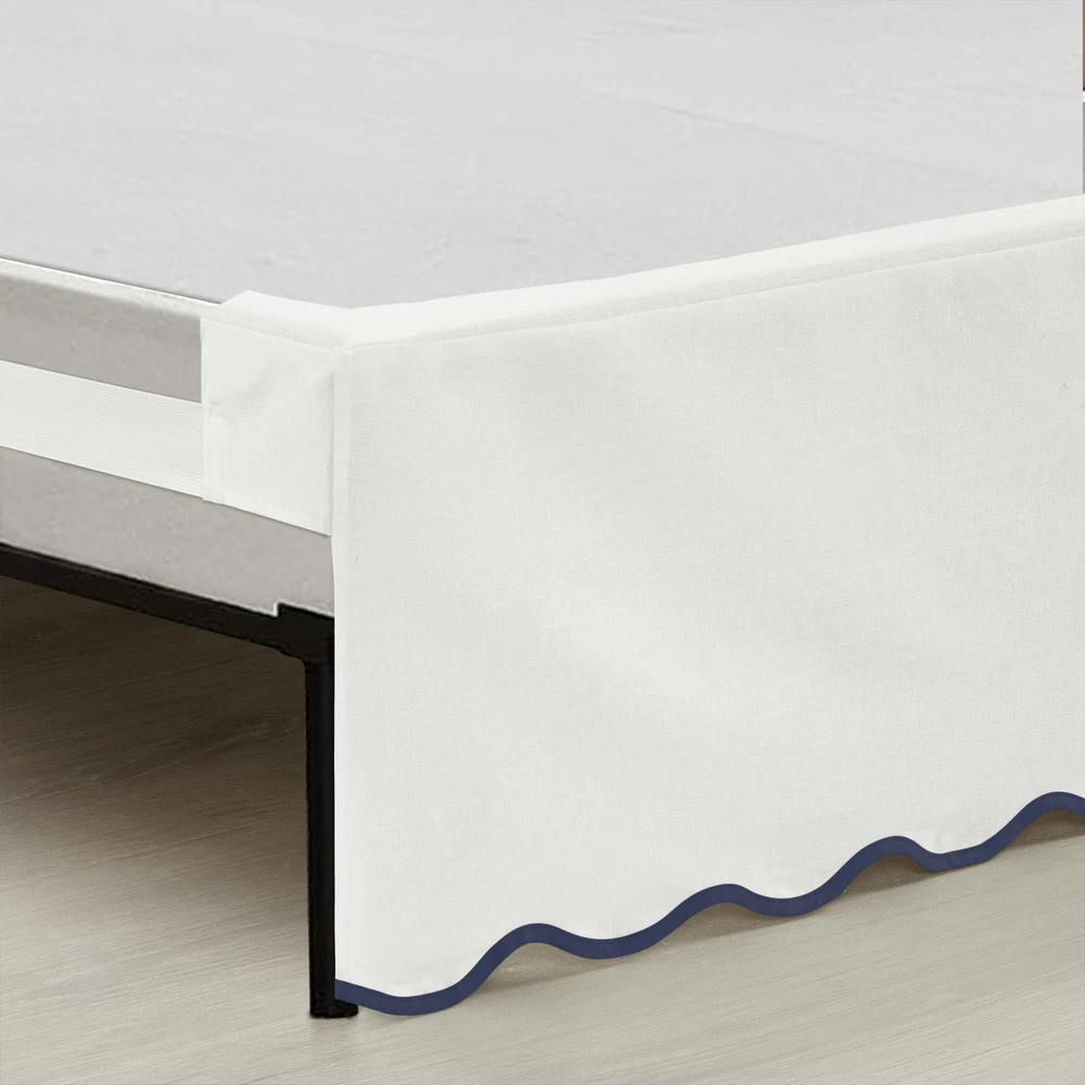 Elevate your bedroom with our Coastal Chic Scallop Edge Bed Skirt which brings a touch of breezy seaside charm to your decor. The distinctive scalloped edge design evokes the gentle curves of waves along the shore, infusing your bedroom with a tranquil coastal ambiance no matter where you live. Crafted with high-quality materials, it conceals under-bed storage while adding a clean, finished look. Available in a crisp white with an edge binding in soothing seaside colors, it complements your decor effortlessly. Create a serene, resort-like feel with this elegant and practical bed skirt, perfect for refreshing your bedroom's ambiance and concealing clutter. The elastic band allows for simple styling. This chic bed skirt is the perfect addition to your coastal, minimalist, or transitional styled bedroom. This bed skirt is STANDARD 100 by OEKO-TEX® certified, which means the fabric, dyes and all components have been tested in an independent laboratory and certified against a list of more than 350 harmful substances. For your convenience, this bed skirt is safe to machine wash on the gentle cycle and tumble dry on a low setting. Use an iron on low heat to release wrinkles. Please refer to label for full care instructions. Bed Decor: Our Coastal Chic Scallop Edge Bed Skirt conceals under-bed storage while adding a clean, finished look. The scalloped edge design evokes the gentle curves of waves along the shore, infusing your bedroom with a tranquil coastal ambiance. Coastal Charm: This bed skirt features a solid white color with a navy binding on the scallop edge. Create a serene, resort-like feel with this elegant and practical bed skirt, perfect for refreshing your bedroom's ambiance and concealing clutter. Chic Bed Skirt: This queen size bed skirt measures 78"W x 80"L + 14.5" drop and includes 3" pocket corners on each side. The elastic band allows for easy styling. This bed skirt is a great addition to your coastal, minimalist, or transitional styled home. This product is STANDARD 100 by OEKO-TEX certified, which means the fabric, dyes and all components have been tested in an independent laboratory and certified against a list of more than 350 harmful substances. Easy Care: This bed skirt is easy to maintain. Simply machine wash separately in cold water on the gentle cycle. Use only non-chlorine bleach if needed. Tumble dry low. Use an iron on low heat to release wrinkles if needed.