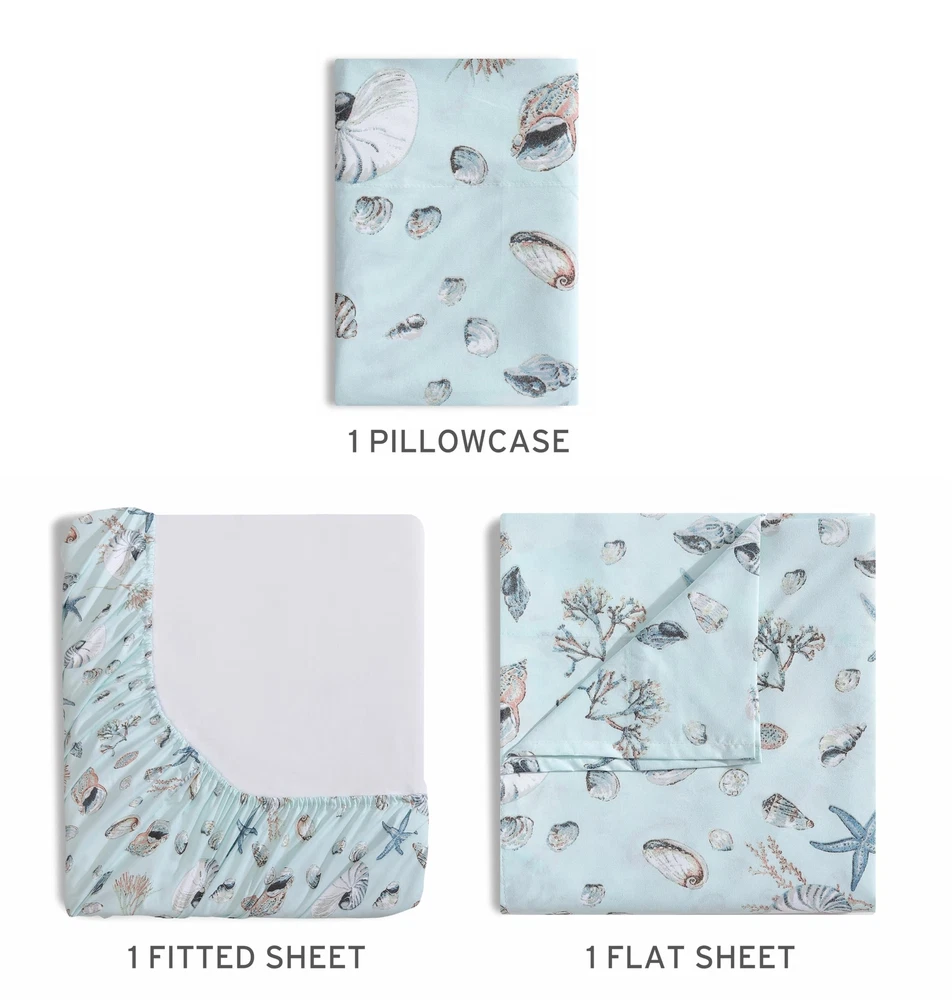 This comfortable microfiber sheet set is 100% soft-touch polyester featuring a coastal beach print pattern. The set includes 1 flat sheet (66"W x 96"L), 1 fitted sheet (39"W x 75"L x 12"D), and 1 standard size pillowcase (20"W x 30"L). This extra cozy sheet set is fully elastic and can fit up to a 12" deep mattress. Perfect the for ocean and nautical lover in the bedroom, master suite, guest room, airbnb, beach house, cottage, boat, or RV. Makes a great gift. Machine wash cold, gentle cycle and tumble dry low. No ironing necessary. 3-piece twin sheet set made from 100% microfiber polyester includes 1 flat sheet 66"W x 96"L, 1 fitted sheet 39"W x 75"L x 12"D, and 1 standard size pillowcase 20"W x 30"L Soft, comfortable 100% polyester microfiber for a restful night slumber Easy to put on fitted sheet is fully elastic with 12" Deep Pockets Coastal theme any décor, great at the shore, lake, cottage, beach or guest house Machine wash cold, gentle cycle. Use non chlorine bleach only. Tumble dry low, remove promptly. Iron on medium heat when needed.