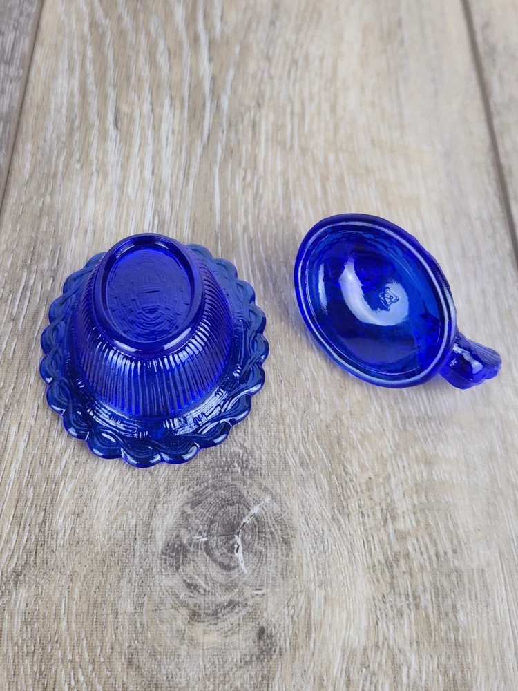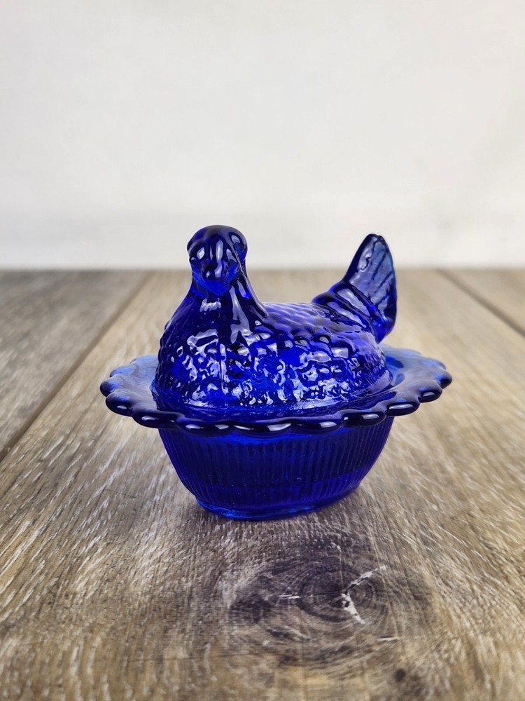 This Cobalt Blue Glass Hen on Nest salt cellar is a stunning example of cobalt blue glassware, featuring a ruffled edge base and a beautifully detailed hen lid. Ideal for use as a salt cellar, trinket box, or decorative accent, this piece combines both functionality and beauty. The vibrant cobalt blue hue shimmers in the light, making it a striking addition to any glass collection or farmhouse kitchen decor. Whether displayed as a centerpiece or used to store salt, spices, or small keepsakes, this glass hen on nest will be a cherished addition to your collection. *There may be imperfections from the creation process.