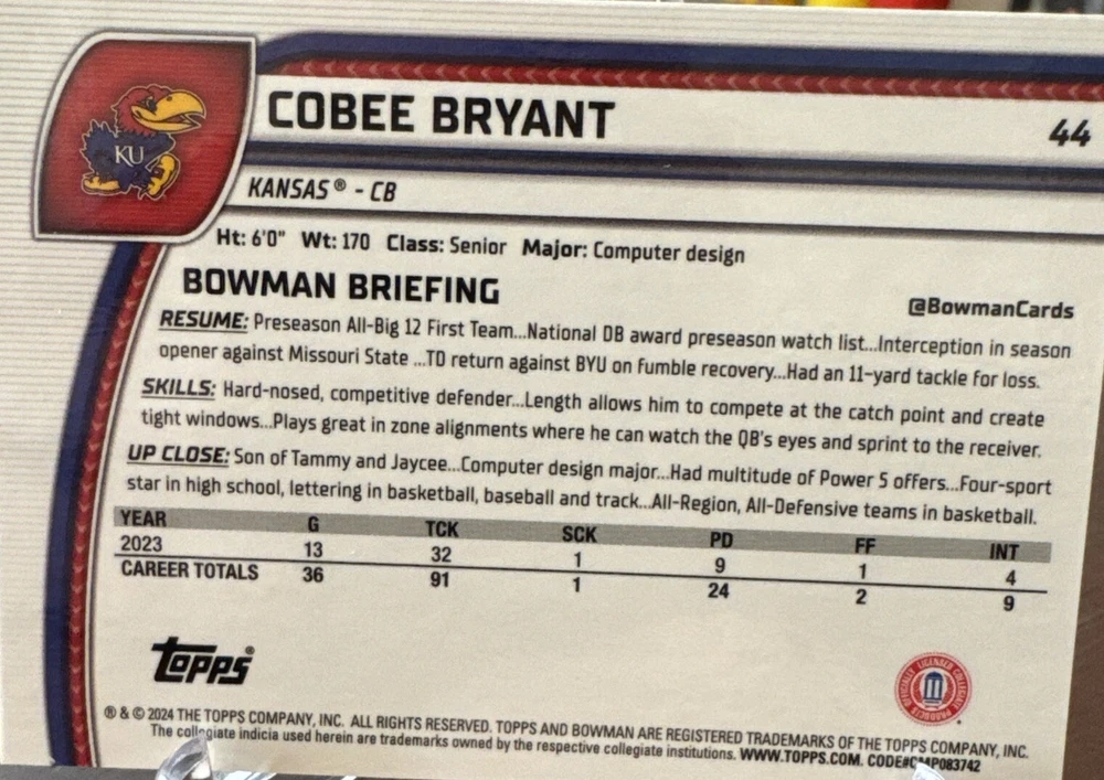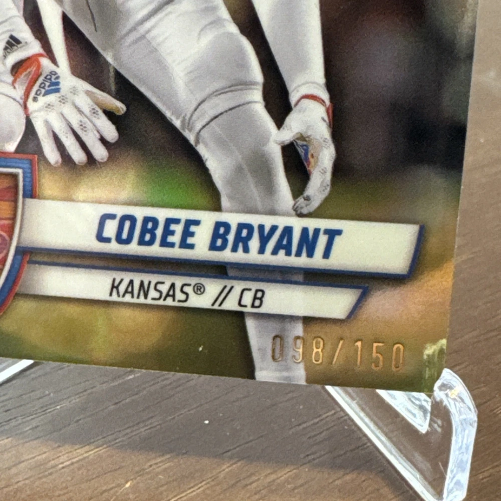 The item is a 2024 Bowman sports trading card featuring Cobee Bryant of the Kansas Jayhawks football team. This card is a Chrome 1st Fuchsia parallel with a limited print run of 98 out of 150, making it a short print variation.