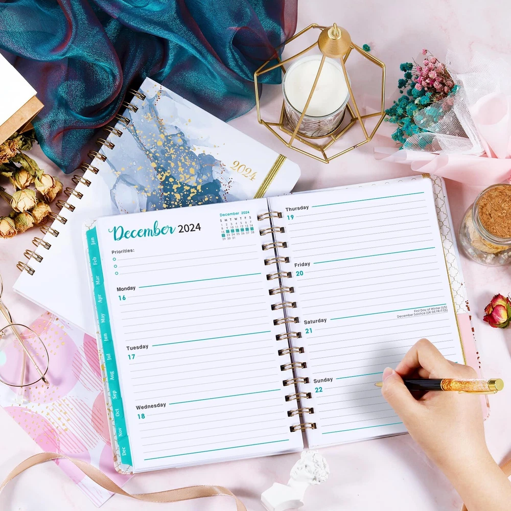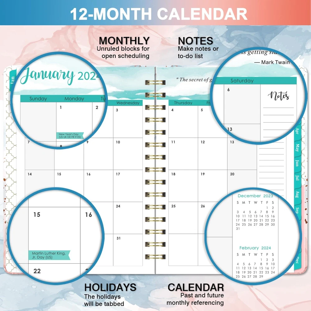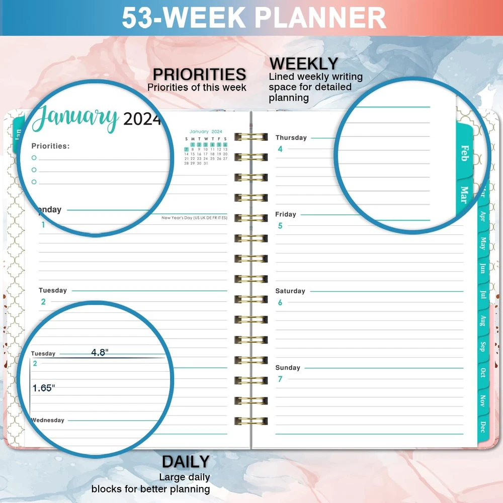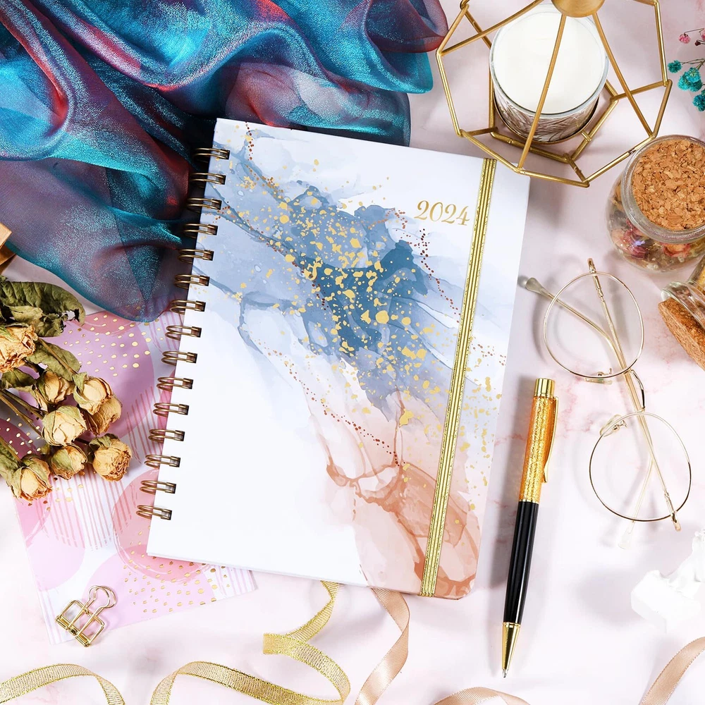 PLANNER 2024 - This 2024 planner covers 12 months, 2024 weekly planner/calendar spiral bound is from January 2024 - December 2024. The size of this planner is 8.5"X6.4", which is suitable for putting into your backpack. WEEKLY PAGES - 2024 planner of weekly view pages contain enough writing place for your detailed daily schedule, appointments, ideas and more. Each weekly page offers ample lined writing space for planning your schedules. In addition, there are checkboxes to help you track all days clearly every day. MONTHLY PAGES- Each monthly page of this planner 2024 includes 2 blank pages and has holidays reminders for special holidays and notes section for writing down important appointments. At the same time, each monthly page contains a monthly overview with blank daily blocks in 1.2" x 1.25", previous, present and next month reference calendar for long-term planning. STURDY & DURABLE - 2024 planner with high quality white paper, the paper of this academic planner is ink-proof and wear-resistant. Durable hardcover, the classical design on the cover makes the 2024 calendar planner more individualized. Sturdy golden twin-wire binding allows turning pages smoothly and laying flat. FUNCTION PLANNER - The function page on the first few pages of this 2024 planner, which are Personal Information and What To Do This Year, Yearly Overview of 2024-2025, Holidays of 2024-2026, Quick Reference Information and Contact. The multiple functions of this planner can help you solve a lot of trouble and save a lot of time.