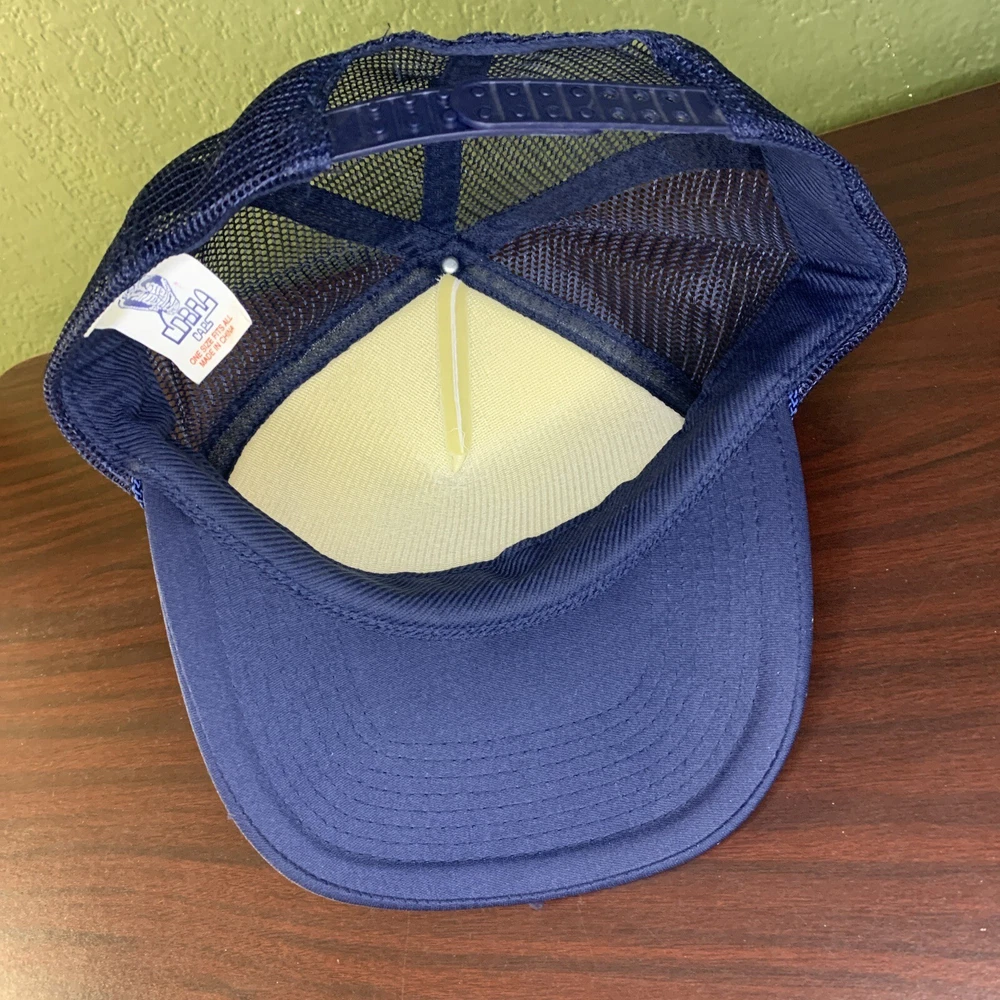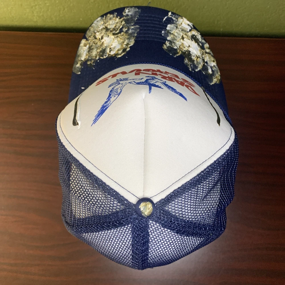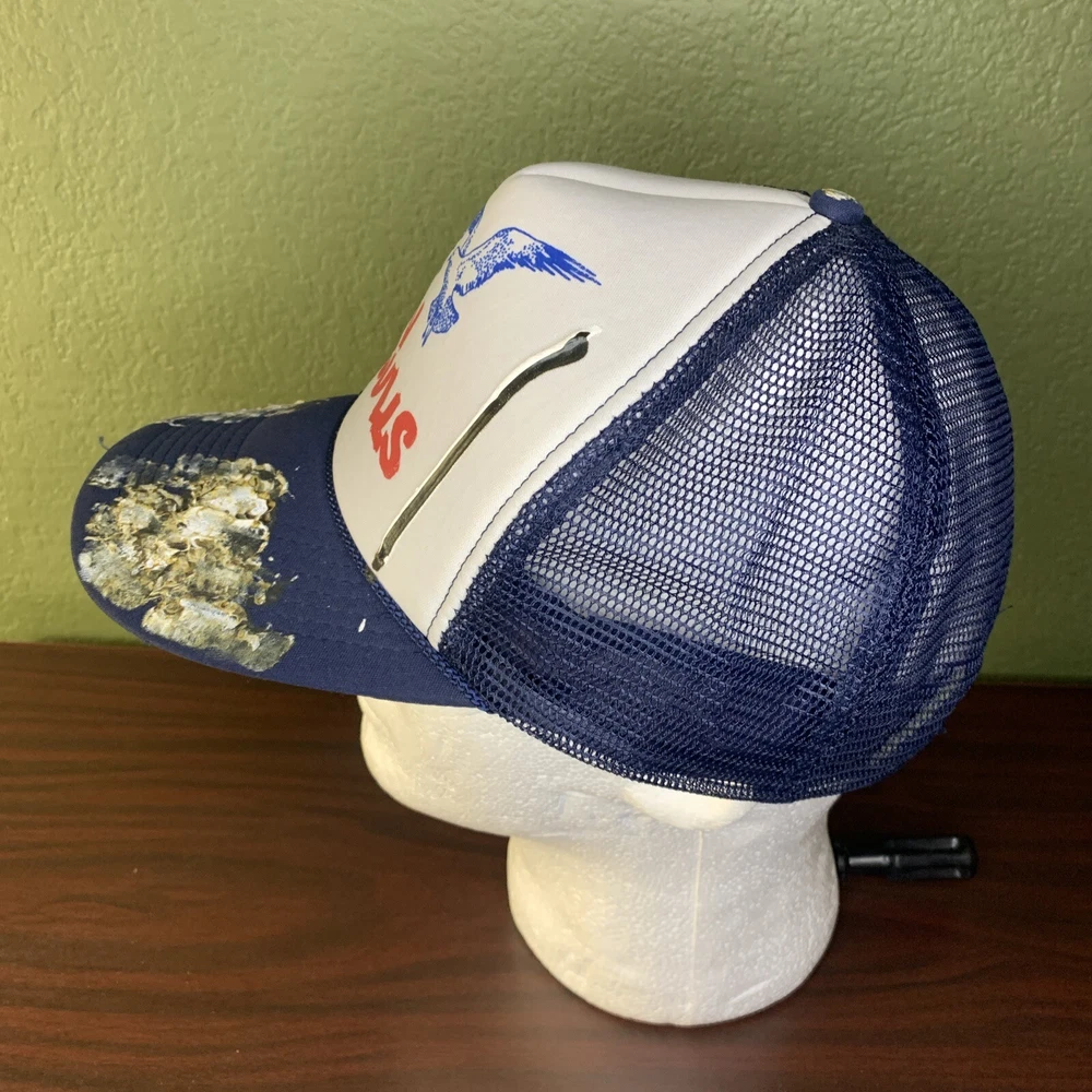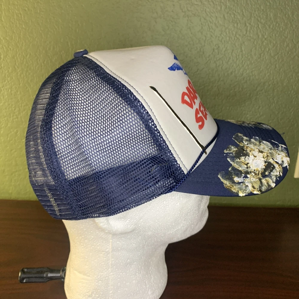 Cobra Caps Darn Seagulls double snapback adjustable mesh back trucker hat All the seagull droppings for these hats are done by hand, so technically each is an amazing work of art. Hat fits a little small, fits a 7.5-sized head at 4 snaps. It is a double snapback though.