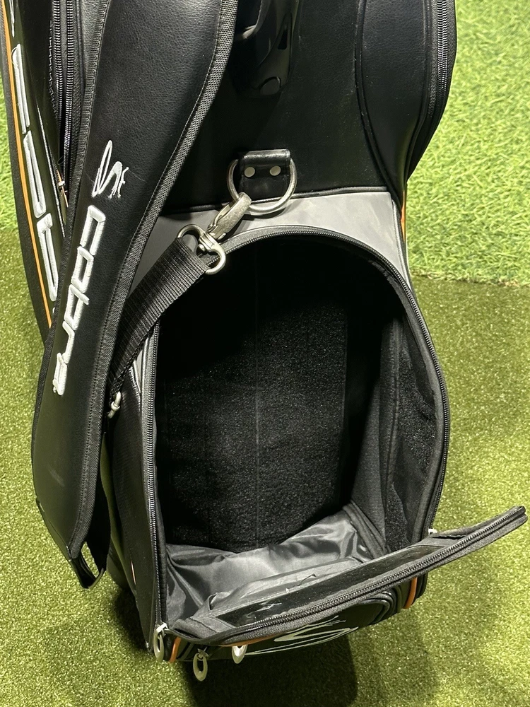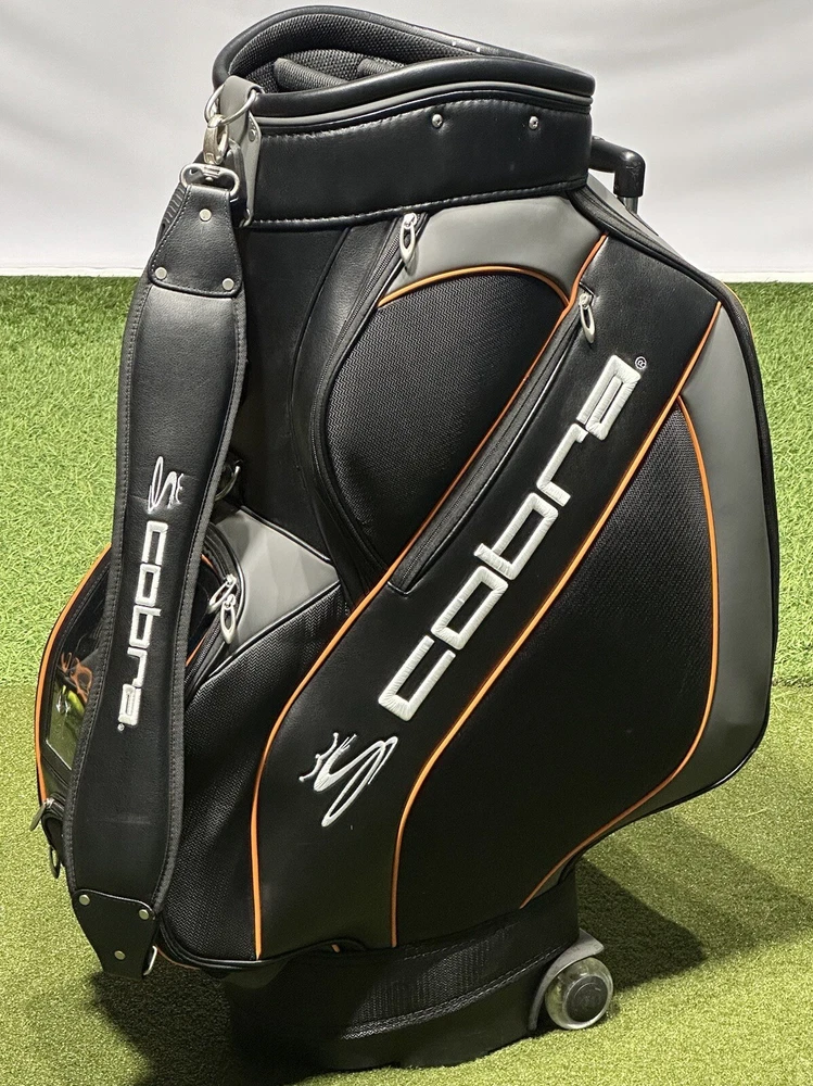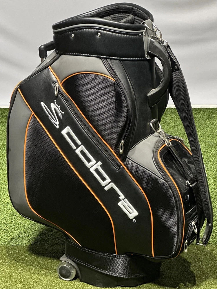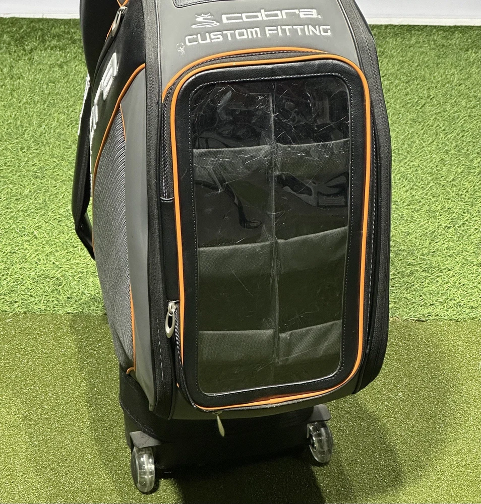 We are a reputable golf company that has been in business in St. Louis, Missouri since 1975. We have been doing this for 40 years because we do things right the first time. WE HAVE THE FASTEST SHIPPING ON EBAY! Don't believe us? Check out our Feedback. If you have questions, please feel free to ask. As always, thank you for looking. Cobra Custom Fitting Wheeled Golf Bag COLOR: Black/White/Orange/Gray STYLE: Wheeled Staff Bag DIVIDERS: 5-Way Divider CONDITION: Near-MINT - Never used on course (9.0/10) This RARE custom fitting bag can hold iron heads on one side and driver, fairway wood, and hybrid heads on the other. The top of the bag is 10" x 12" If you have questions, please let us know!