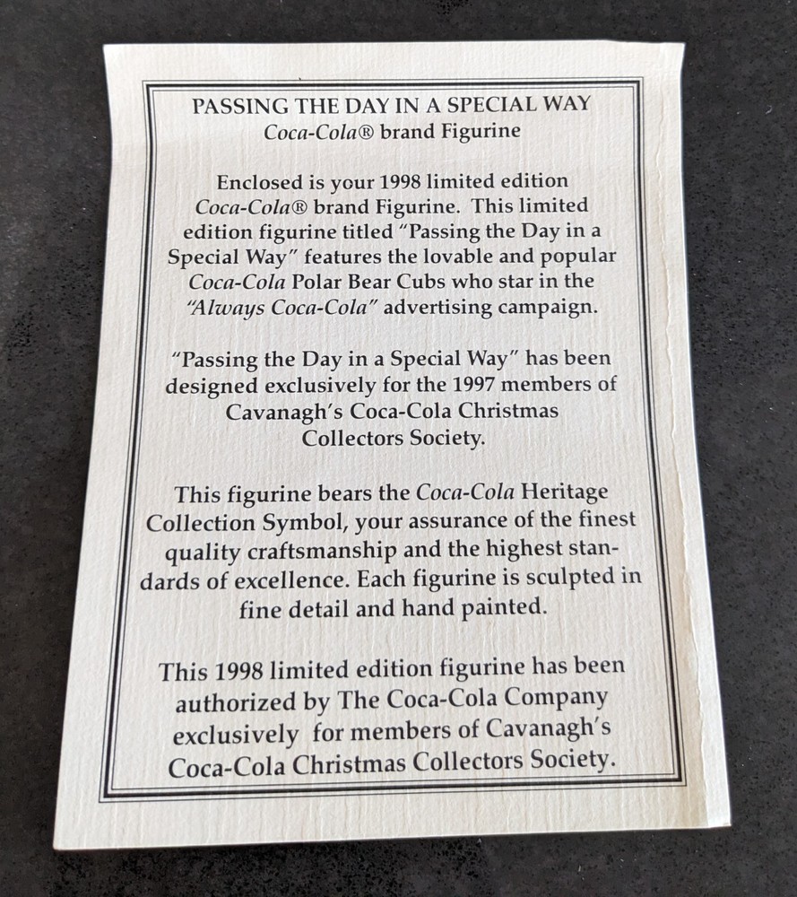 Coca Cola Heritage Collections- PASSING THE DAY IN A SPECIAL WAY- Members LE Designed exclusively fo the 1997 members of Cavanagh's Coca- Cola Christmas Collectors Society. Item is in excellent condition. Please review all photos as they are part of the description of the items. Check out our many other items, we are happy to combine shipping!