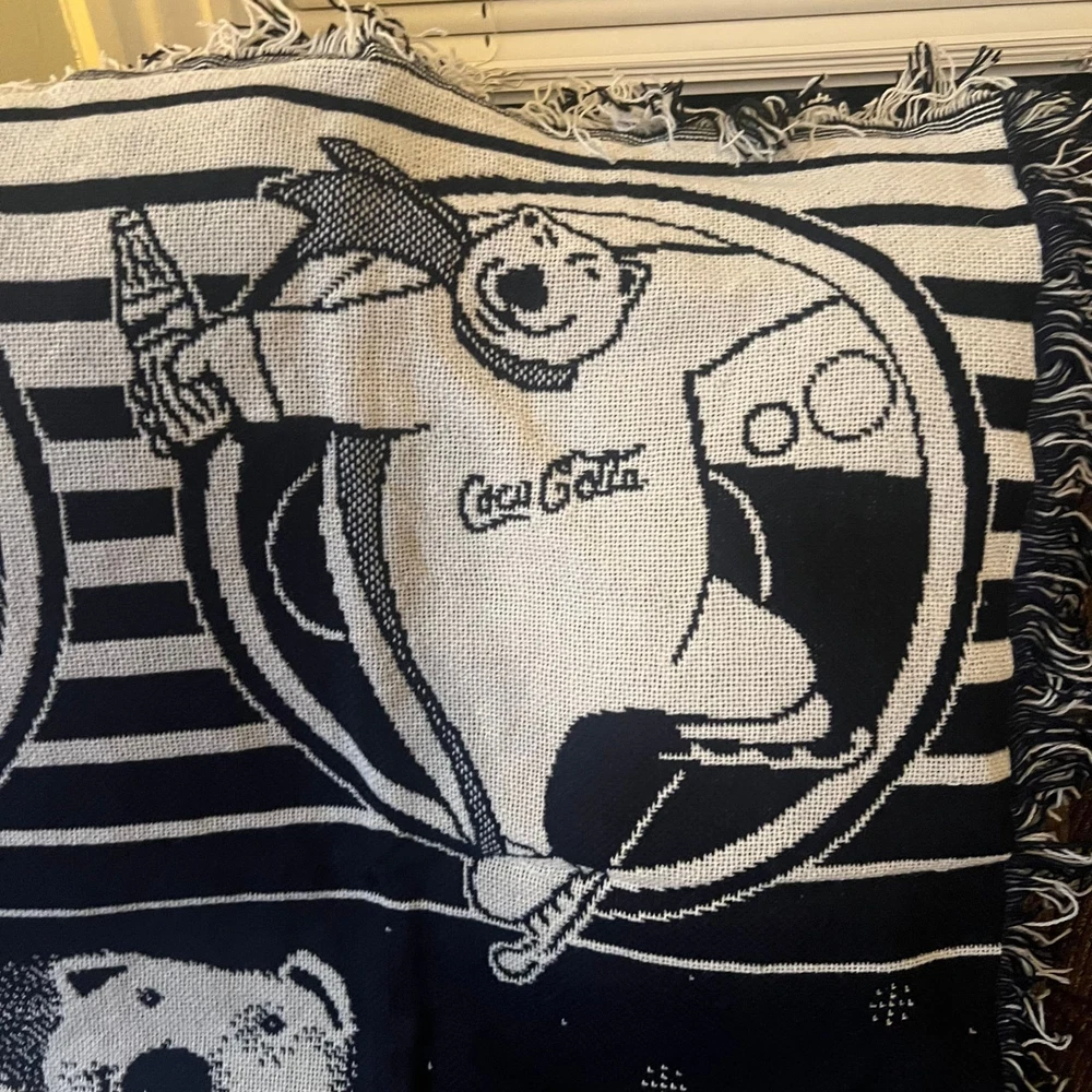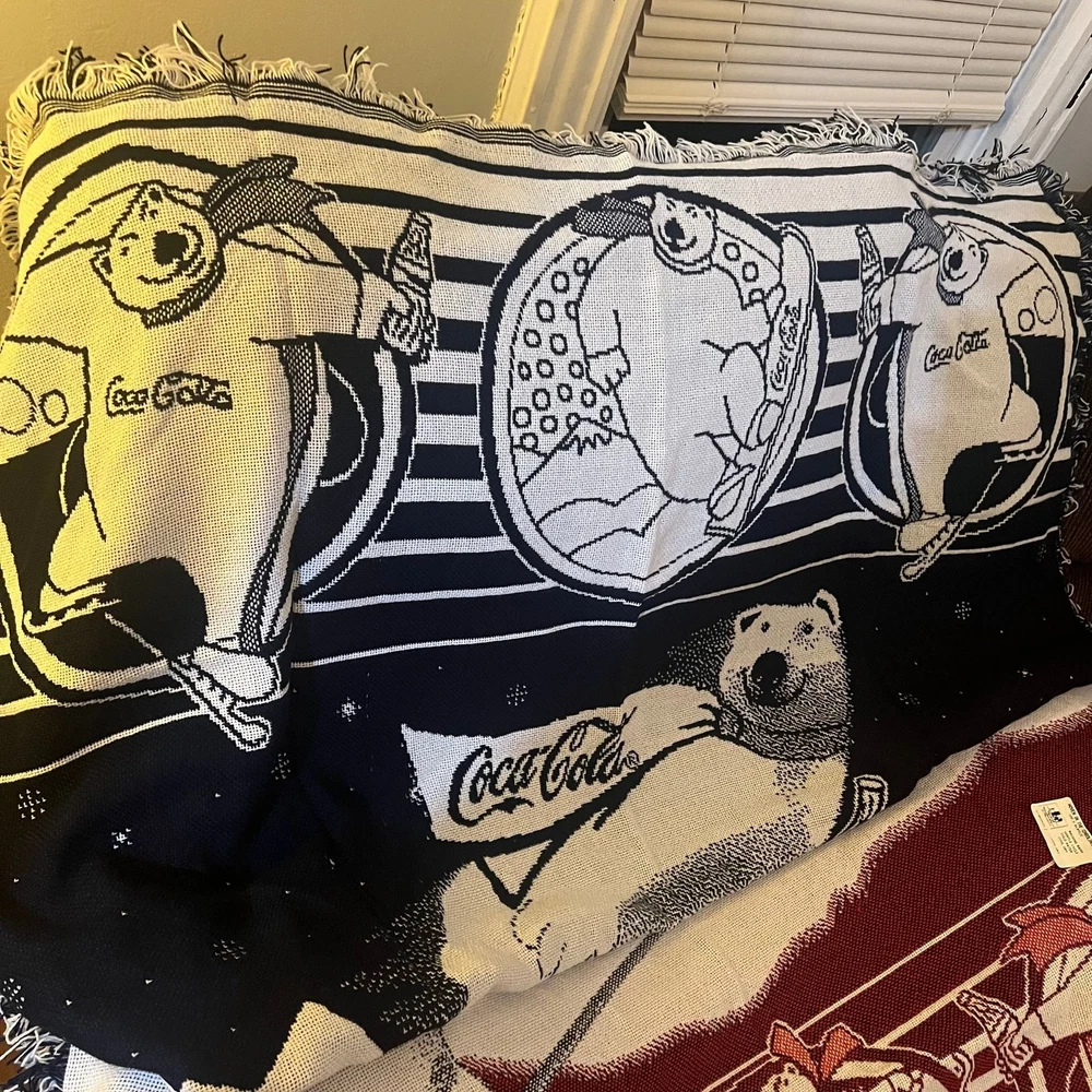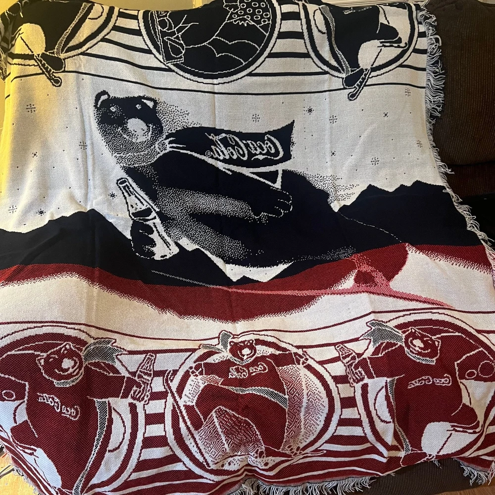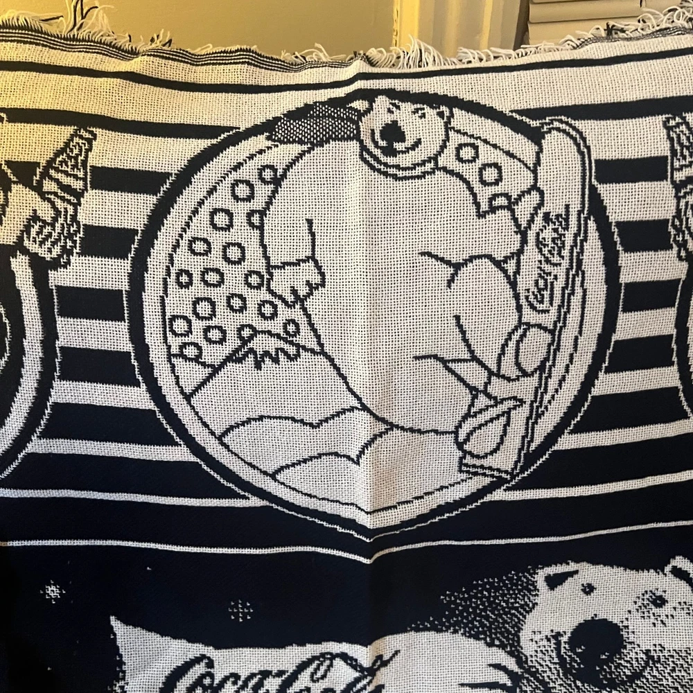 Vintage Coca-Cola Polar Bear knit tapestry, new with tags (NWT). 1994 Y’all !!!!! This charming throw blanket features iconic Coca-Cola polar bear designs, perfect for collectors or adding a nostalgic touch to your home decor. Crafted from 100% acrylic and woven in the Carolinas, it's an authorized Coca-Cola product from 1994, marketed by Manual Woodworkers & Weavers. Ideal for a cozy throw or a decorative wall hanging. Measures approximately 50x60 inches.