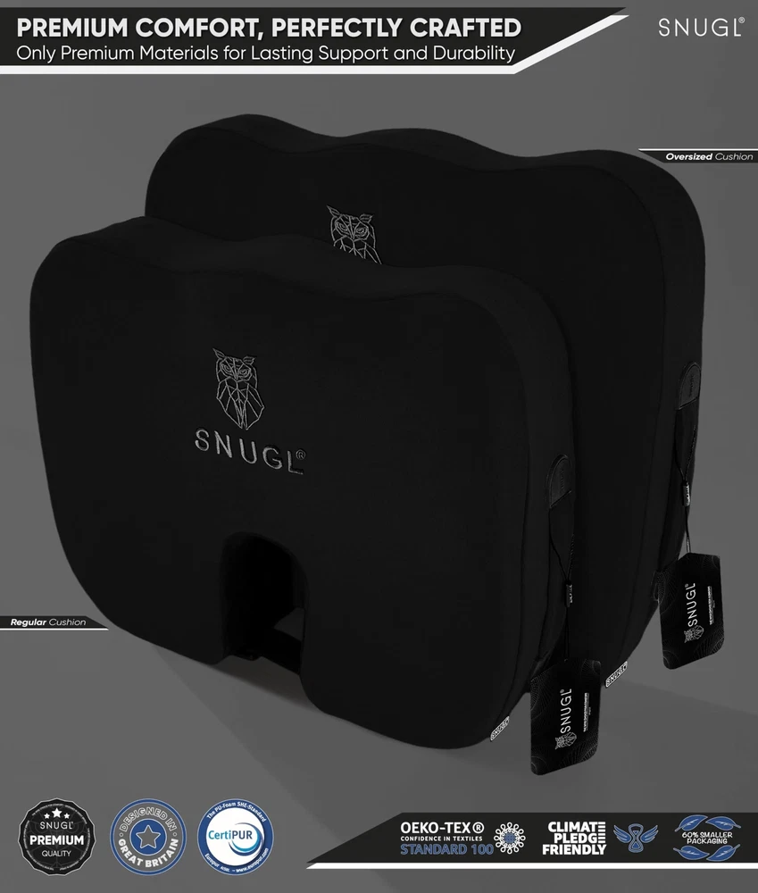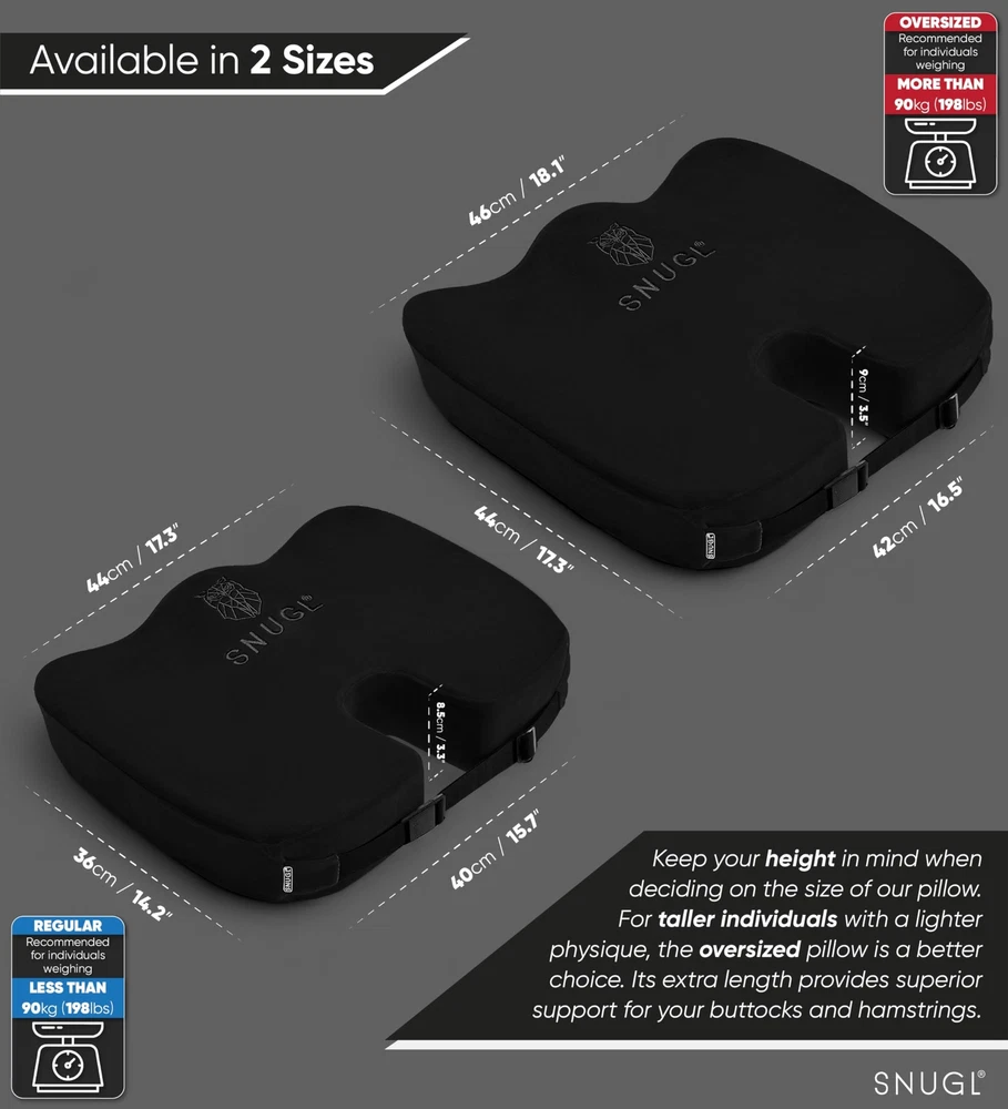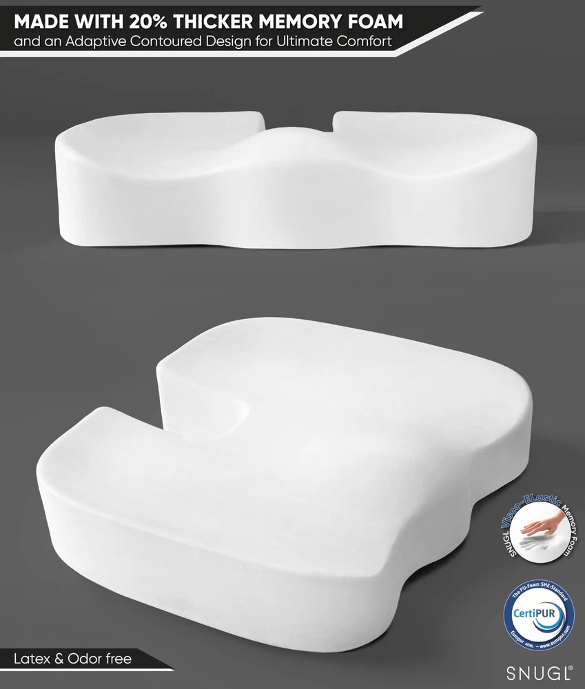 THE WISE CHOICE FOR COMFORT - At , we prioritize lasting comfort, support, and pain relief. Transform any chair into a luxury seat with our ergonomic coccyx cushion, ideal for long sitting at home, in the office, or while driving. Perfect as a lumbar support pillow for office chairs, car seats, or gaming chairs. THICKER MEMORY FOAM FOR SUPERIOR SUPPORT - Our cushion is 20% thicker than standard seat cushions, featuring premium Visco-Elastic memory foam for enhanced comfort and pressure relief. Enjoy cloud-like softness that supports your lower back, hips, and tailbone, making it perfect for sciatica and coccyx pain relief. ERGONOMIC U-SHAPE DESIGN - Designed to promote healthy posture and improve circulation, our orthopedic cushion alleviates pain from sciatica, lower back pain, and post-surgery recovery. Itβs the perfect chair pad for office workers, truck drivers, wheelchair users, and anyone needing added comfort during long hours of sitting. DURABLE, NON-SLIP, & PORTABLE - Built to last, our cushion maintains its shape with daily use, thanks to high-quality, slow-rebounding memory foam. The non-slip silicone base and dual adjustable straps ensure it stays in place on any chair or seat. Includes a side handle for easy portability, making it great for travel. HYPOALLERGENIC & EASY TO CLEAN - The soft velour cover is hypoallergenic, breathable, and machine washable, with a hidden zipper for easy removal. Available in multiple colors, it fits seamlessly into any decor, whether youβre using it at home, in the office, or on the road. Ideal for those seeking comfort and pain relief with style.
