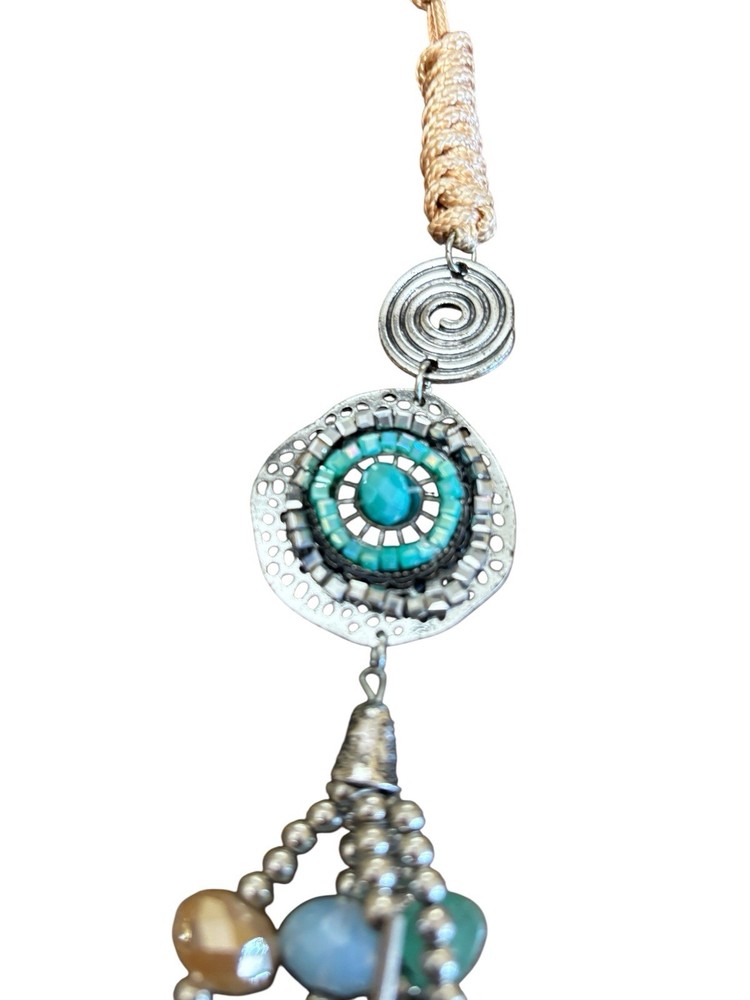 The Coco Necklace is a statement piece with a unique color combination of green, blue, tan, turquoise, and silver. This beaded necklace features a lobster closure and a necklace length of 22 inches with an extension , making it a versatile accessory for various occasions such as Mother's Day, weddings, anniversaries, birthdays, and Valentine's Day. With its beauty and fashion-forward design, this boutique piece is sure to add a pop of color and style to any outfit. This necklace was purchased at a boutique and worn a couple times.