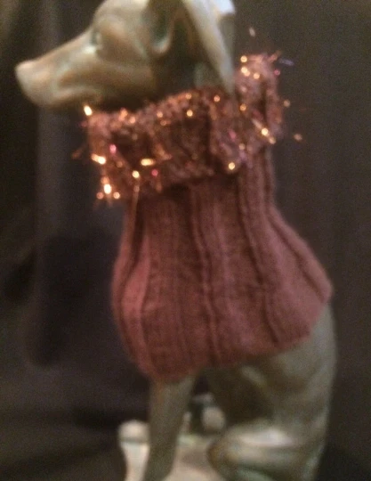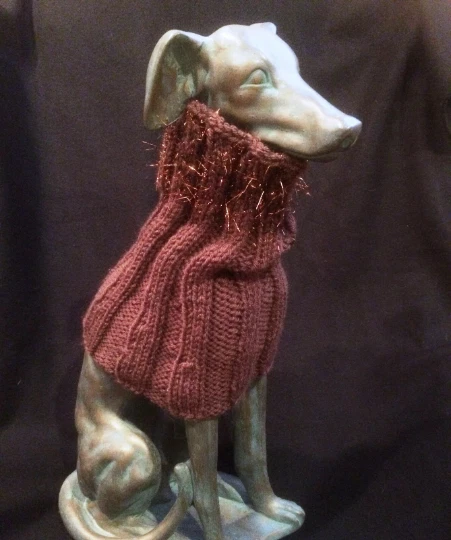 Cocoa Color with Copper Fringe Greyhound Dog Snood **100% donation to GREYlong to find a cure for canine cancer** T his is a simply fun snood, hand knitted in a cocoa colored acrylic yarn with a wispy copper fringe. The first picture is the most accurate copy of the cocoa color, but the 2/3 pictures show what it would look like on your dog. It is used to cover your pups ears from weather or food. It slides over your dog's head to cover those ears when they are walking in frigid weather. Our greyhounds use their knitted snood with their coats. Our poodle, beagle, and basset friends wear them when they eat. Keeps those ears out of the dog dish. Details for the snood that you are bidding on as shown above: hand knitted in a single ply yarn ; length: approx. 11 inches; neck opens 13 - 16 inches; body stretches to 15 - 22 inches; 100% washable, cool temp - air dry; measurements are provided so that you can determine if this will fit your dog. Can be "turtle necked" as shown in the last picture If you have any questions, please contact me. GREYlong We established a not for profit group called GREYlong to find a cure for canine cancer. All money from this sale is donated to GREYlong. Federal tax id is 03-0609843. I can only do it with your help! May you and yours GREYlong! GreyhoundJazzy donates to adoption programs and animal health studies. Ordering Information Paypal is accepted. If you will be out of town, let me know, as I am happy to hold your order. Payment within 3 days of invoice is requested!