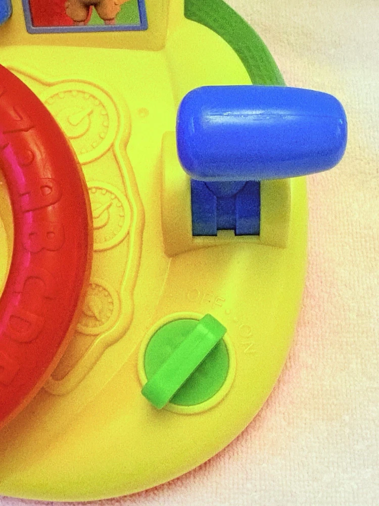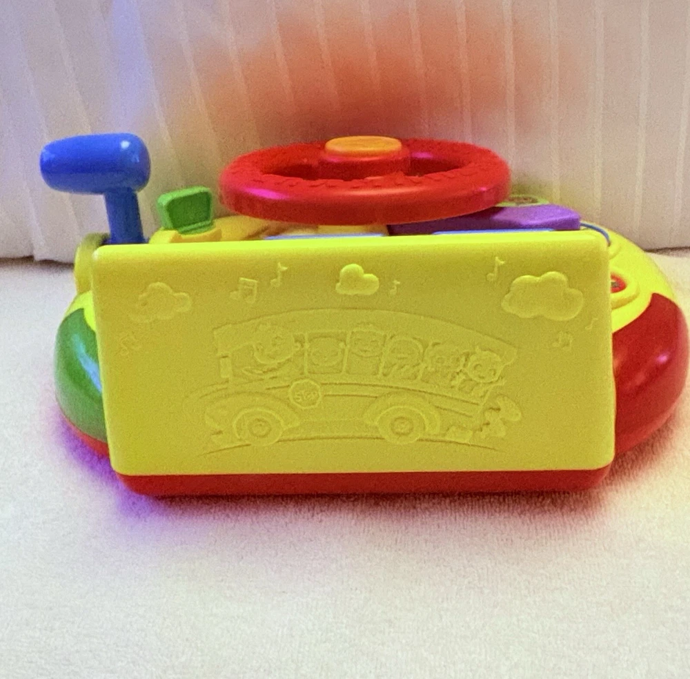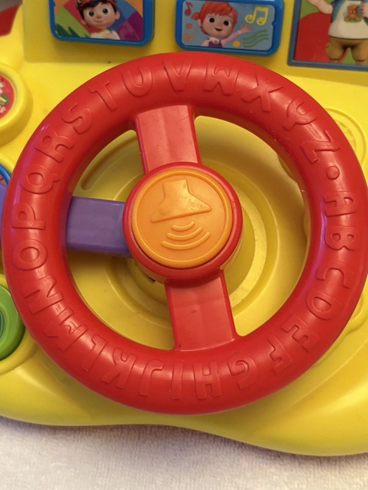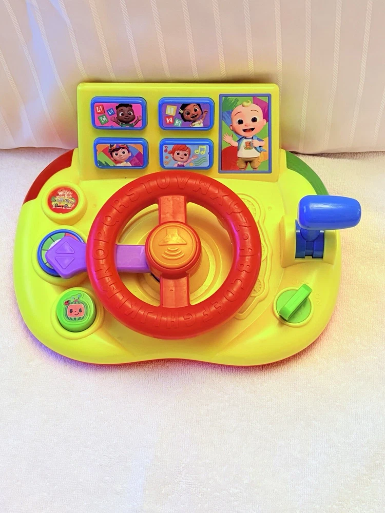 The Cocomelon Wheels On The Bus Learning Steering Wheel Interactive Toy by Just Play is a yellow interactive toy designed to help babies develop hand-eye coordination, language skills, and motor skills. With 60 phrases, this unisex toy provides an engaging learning experience. Made in China.