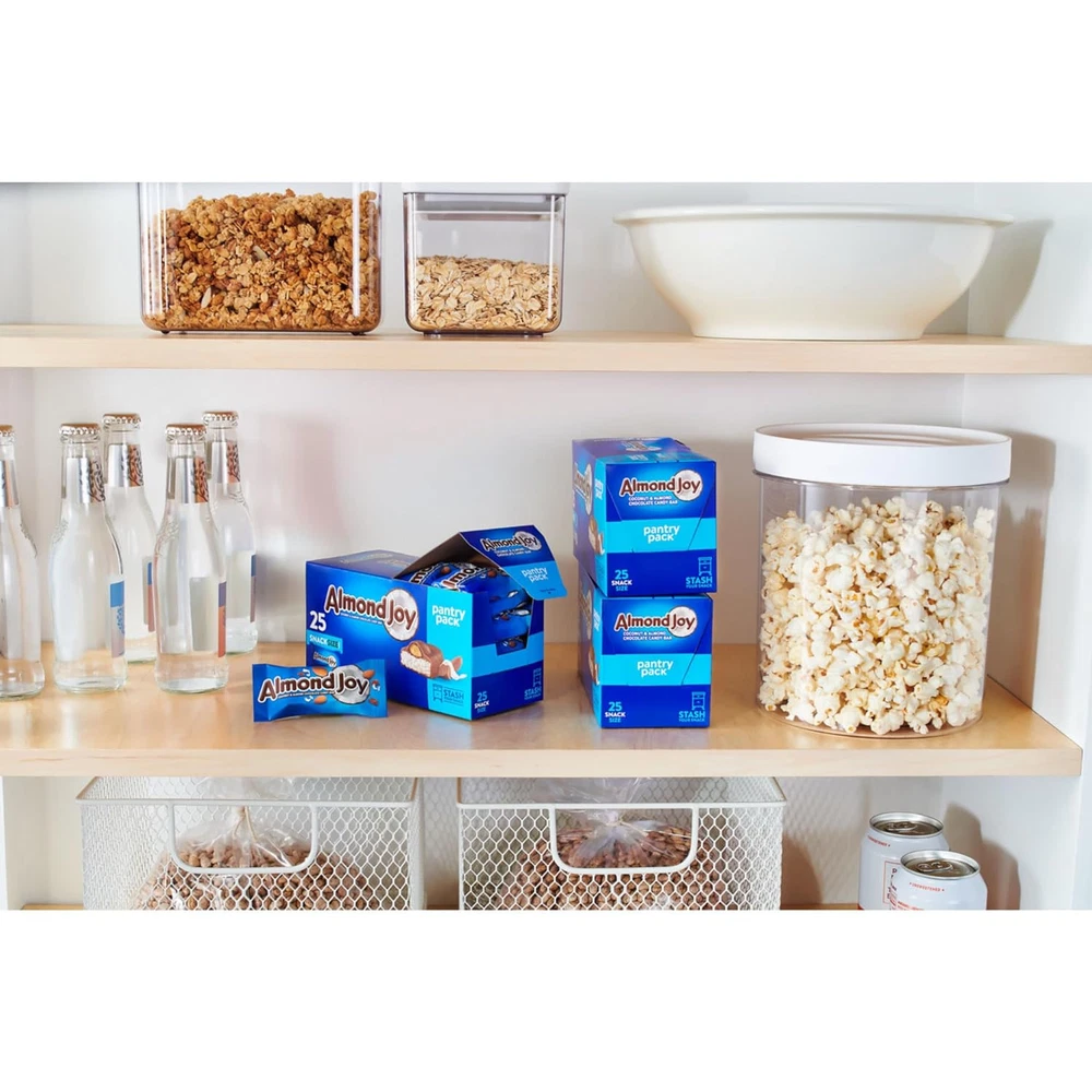Contains twenty-five (25) 0.6-ounce ALMOND JOY Coconut and Almond Chocolate Snack Size Candy Bars in a 15-ounce pantry pack Keep your favorite chocolate candy and almond duo neat and organized with a ALMOND JOY candy box that you can store in the pantry or fridge Includes 25 individually wrapped kosher and gluten free ALMOND JOY coconut candies in a re-closeable and stackable box to protect your snack size candy treats Use an ALMOND JOY pantry pack during relaxing moments alone, movie nights or for snacking at your desk anytime you need a sweet chocolate candy snack Chill and enjoy these coconut sweets as back-to-school snacks, family sharing moments and midday treats whenever the moment strikes Island time is all the time when you take a bite of a snack size ALMOND JOY chocolate candy bar. When you need a break from the weekday craze, escape into a paradise of bliss when you bite into a delicious fusion of creamy chocolate, sweet coconut and whole almonds. It's the perfect treat to eat wherever life takes you. No doubt, it's an ALMOND JOY candy bar! Indulging in this sweet combination is the perfect way to relax during the workplace craze or throughout an eventful weekend.