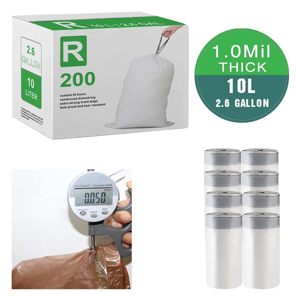 Custom Fit Drawstring Trash Bags with Code R White Drawstring Garbage Liners Advantages of Trash Bags: - DRAWSTRING BAGS : White trash bag with grey drawstring closure for easy tying and carrying; - PERFECT FIT : with Code R trash cans; - HEAVY DUTY : Tear Resistant 1.2 Mil Thickness. Strong enough to tolerate all residential household garbage and commercial waste. - STRONG DRAWSTRING HANDLES : Reliable handles easily help lift, tie & carry trash bags without a tear. - Wide Application : This plastic trash bags not only used for kitchen trash can, but also for office, bedroom, living romm, bath room and car. Also other books, clothing items, organizers of holiday decorations. Note π[CODE R] Code R trash cans. Seamless Fit for 2.6 Gallon / 10 Liter; π[DRAWSTRING BAGS] 200 count (Pack of 1) trash bags included.White trash bag with grey drawstring closure for easy tying and carrying. π[HEAVY DUTY] Tear Resistant 1.2 Mil Thickness. Extra strong to tolerate all residential household garbage and commercial waste. π[STRONG DRAWSTRING HANDLES] Reliable handles easily help lift, tie & carry trash bags without a tear. Quick-dispense pack lets you grab liners by without the hassle of hard-to-find perforations or messy unraveling. π[Wide Application] This plastic trash bags not only used for kitchen trash can, but also for office, bedroom, living romm, bath room and car. Also other books, clothing items, organizers of holiday decorations.