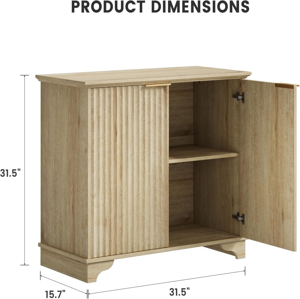 Product Description About this item • 【Spacious Storage】 This storage cabinet boasts generous dimensions of 15.7" D x 31.5" W x 31.5" H, providing ample space for various items. The spacious top surface offers a convenient area to display or access your belongings, while two bottom cabinets each feature adjustable shelves, cleverly accommodating cups, extra dinnerware, and other essentials • 【Multifunctional Cabinet】Whether you're seeking for a farmhouse sideboard to keep tableware organized, an extra storage cabinet to tuck away all your odds and ends, a coffee bar to serve your leisure time, or a TV stand to hold the CD player, it's an essential furniture piece that any kitchen, dinning room, entryway or living room would love • 【Modern Farmhouse Charm】Combining impressive fluted wood grain with a sleek white finish, this storage cabinet seamlessly blends farmhouse aesthetics with classic modern design. The gold metal handles add a touch of luxury, making it easy to integrate into various interior styles, from rustic cottages to contemporary and traditional decors • 【Durable & Safe】Constructed from high-quality MDF with a sleek laminate finish, this buffet cabinet is both durable and easy to clean. The water-resistant and stain-resistant surface ensures long-lasting use. An anti-tip kit is included for added safety, making it ideal for homes with children or pets • 【Easy Assembly】The farmhouse storage cabinet comes with step-by-step instructions and labeled parts for easy assembly. We are committed to providing excellent service. If you have any pre-sale and after-sale questions, please contact us without any hesitation, we will respond in less than 24 hours Coffee Bar Cabinet, Modern Farmhouse Kitchen Storage Cabinet with Fluted Doors, Sideboard Buffet Cabinet with Adjustable Shelves, for Kitchen, Dining Room, Living Room, Oak On Aug 12, 2025 at 00:31:20 PDT, seller added the following information:
