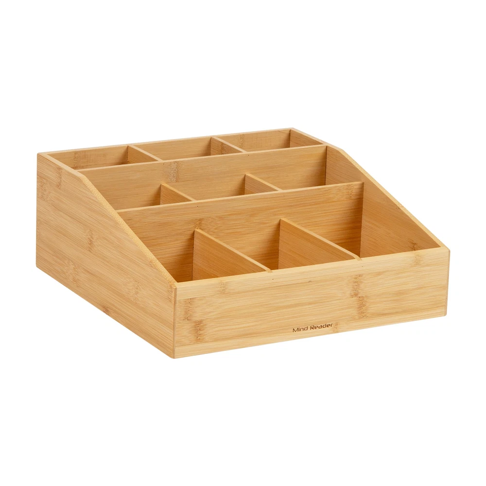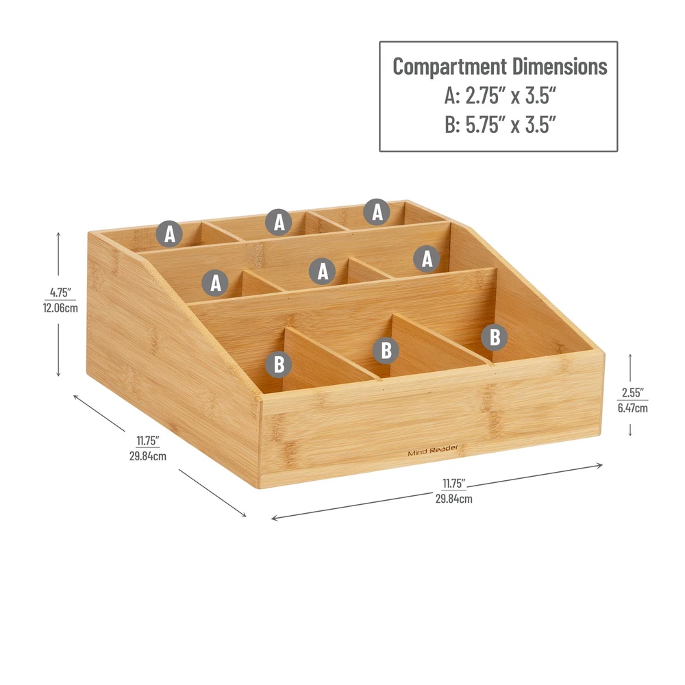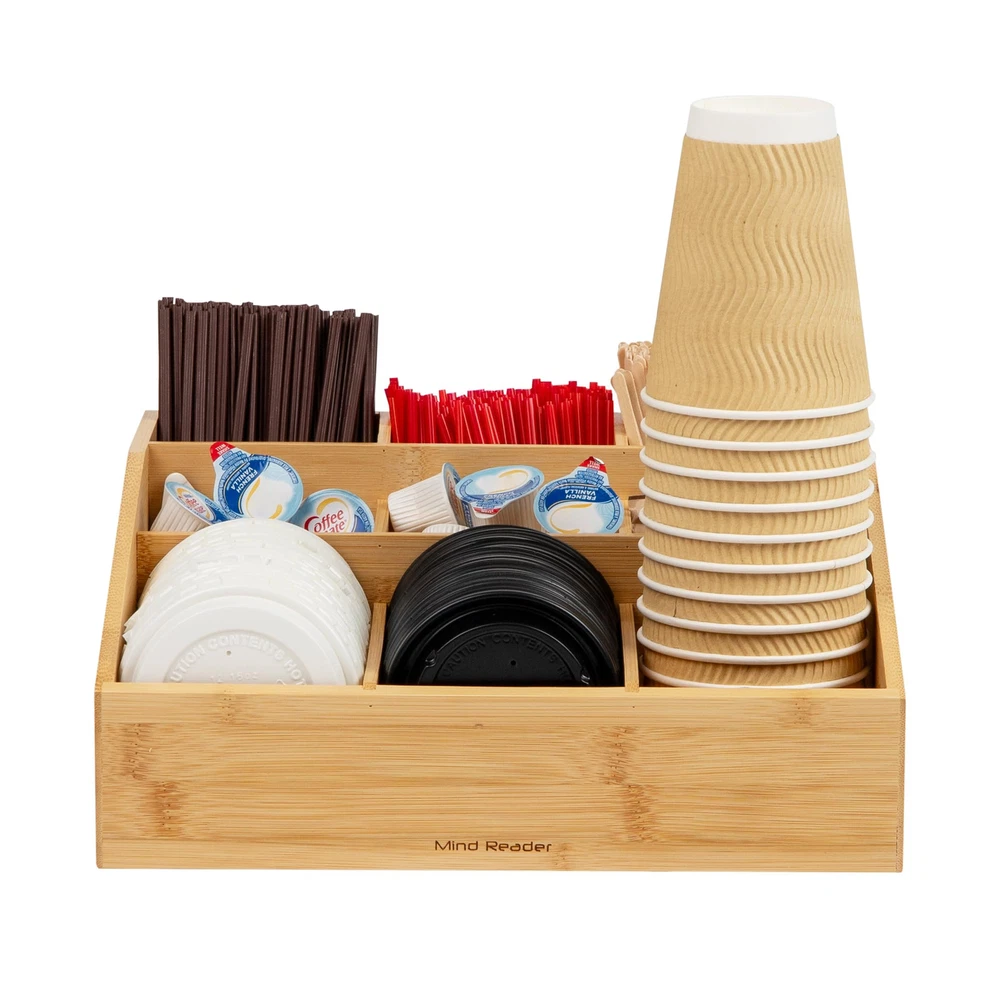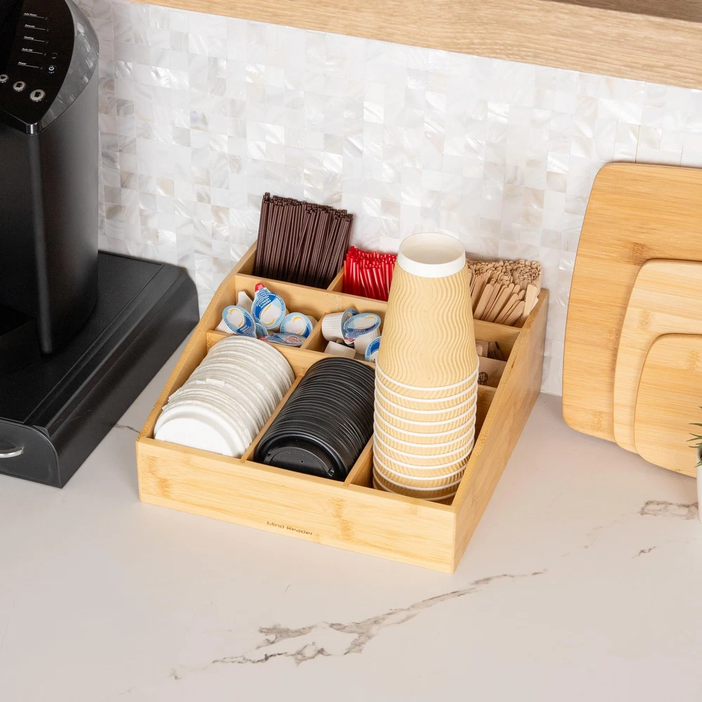 Enhance your coffee experience with this condiment and snack organizer, perfect for any home, office, lobby, breakroom, or waiting room. This space-saving organizer is designed to efficiently and arrange a variety of coffee essentials. ECO-FRIENDLY - Made of for an eco-friendly look and feel to your break room. NINE COMPARTMENTS - Perfect for storing creamer,sugar, sweetener, stirrers, K-cups, coffee lids, forks, spoons, napkins and much more. STURDY - Bottom rubber grippers to keep unit in place and avoid slippage. EASY ACCESS - Open storage calls for easily accessible condiments and coffee items. Everything you want and need right at your fingertips within arms reach. DIMENSIONS - 12 in. L x 12 in. W x 5.5 in. H