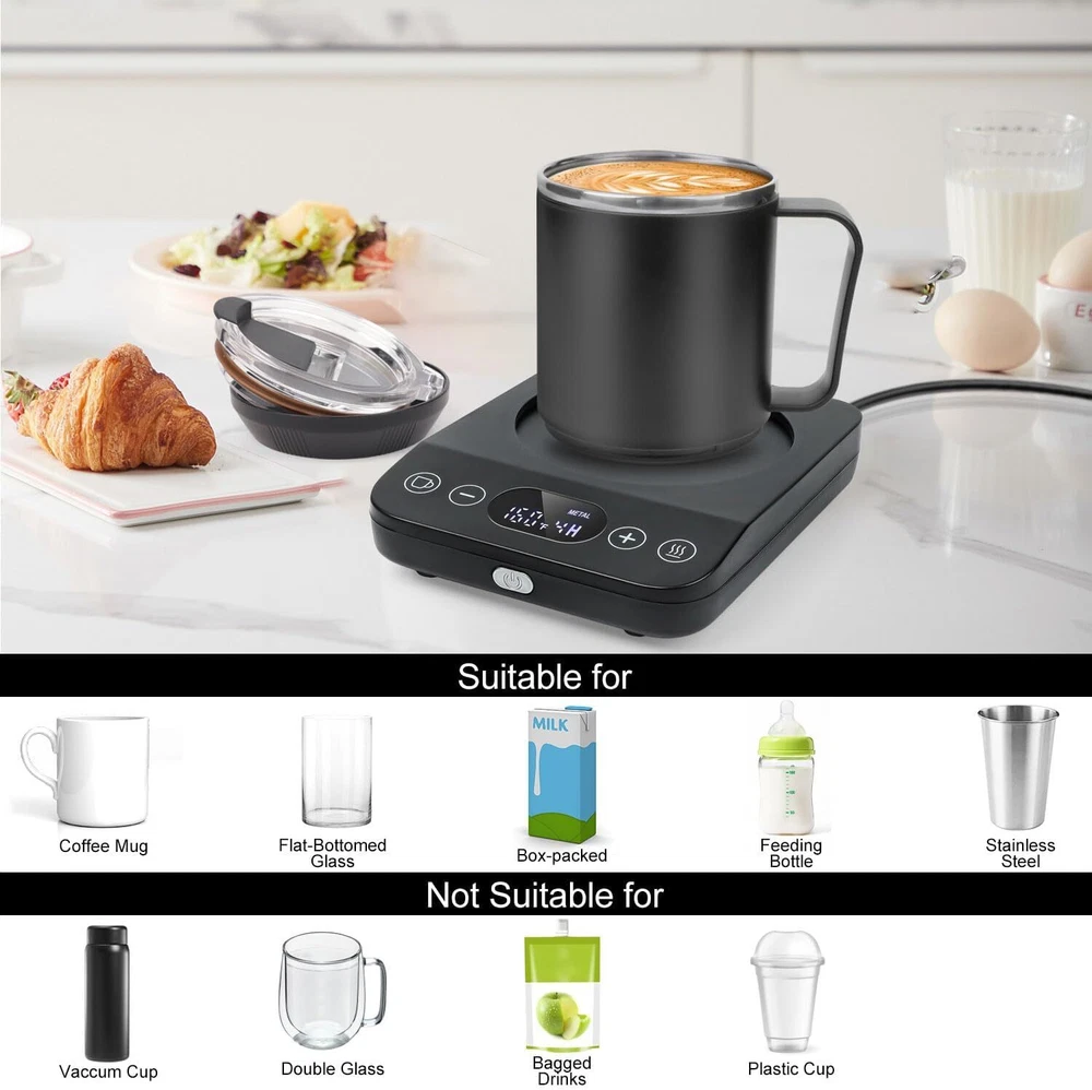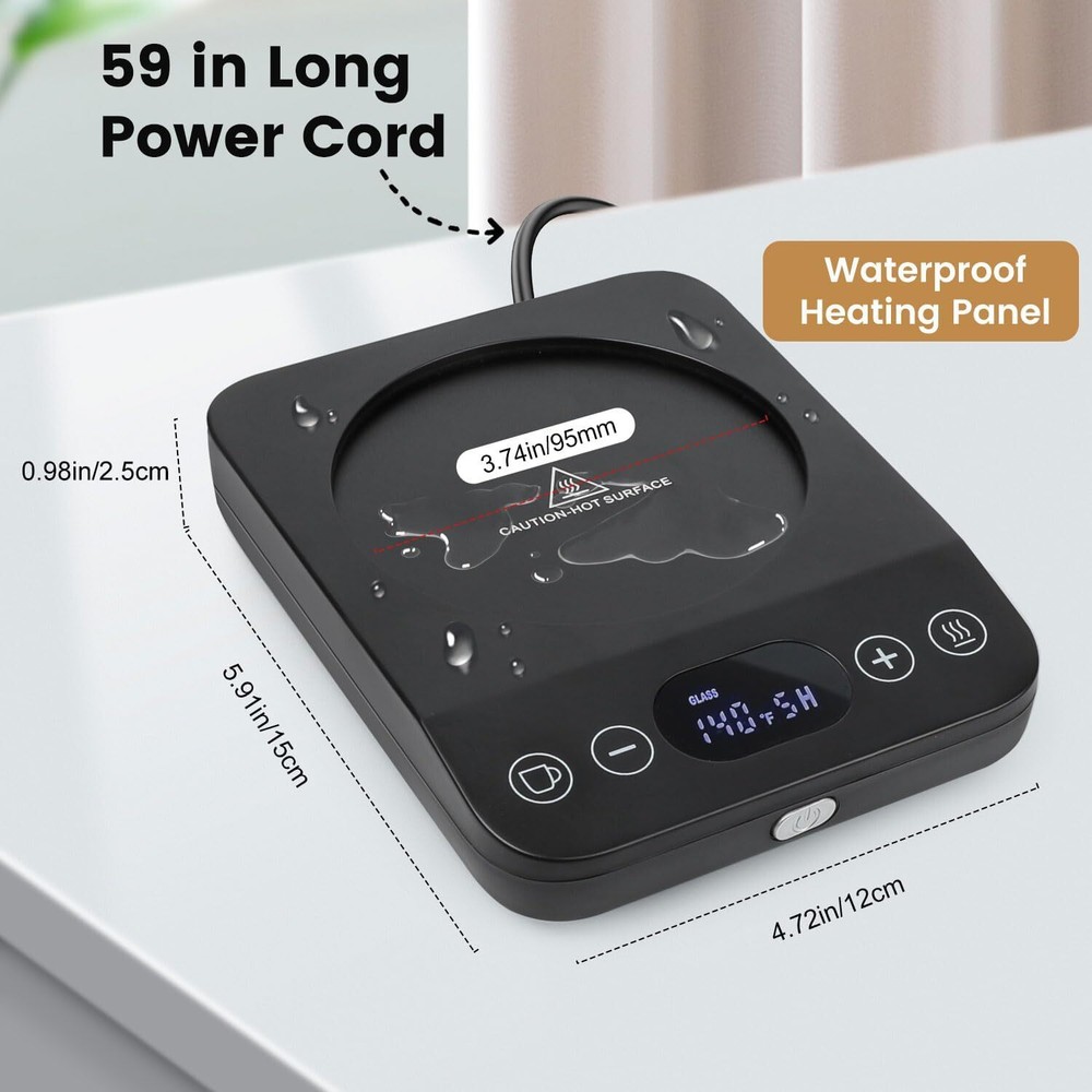 [Heating Quickly]: coffee mug warmer set comes with 15.5oz stainless steel cup, whose plastic base is detachable. The coffee mug warmer can heat up fast than other warmers, reduce waiting time. Liquid temperature can reach the highest temp to 180°F, not only warm but hot (Note: There is no any noise when it is working) [Exquisite Mug]: The inner lining of the mug is made of food grade 304 Stainless Steel, which is high temperature resistant without odor, easy to clean. The mug outer layer is thickened PP, whose heat insulation effect is excellent to protect your hands. The cup with leak proof lid and detachable base can retains heat effectively, slow down the cooling speed of hot beverages. The cup will keep your drink about 10 degrees higher than in iregular ceramic mug [Customized Temperature]: Our cup warmer with 3 Temp-Mode for your choice, GLASS(140°F,160°F,176°F),CERAMIC(130°F,150°F,170°F),METAL(145°F,165°F,180°F). Just a tap of your finger to change the temperature [1 to 9 Hrs Auto Shut Off]: Upgrade the delay timer setting from 1 to 9 hours, ensuring the best coffee taste you need. Maintain the perfect temperature of drink, ensuring that you can savor the warmth and aroma of your beverages from the first sip to the last [Safety Is The Priority]: The smart coffee heater Defaultly Auto shuts off after 4 hours of continuous use, preventing the risk of overheating or fire. Built-in gravity induction switch, no need to turn it off manually when you take the cup away. If you don't need the gravity sensing function, you can turn it off with this switch. Tip: The minimum weight for sensing is 200g [Easy to Use]: The coffee warmer for desk with high quality ABS and aluminum alloy material and upgrade metal heating plate, which not only heating faster but also waterproof. In addition, the heater would remember the last temperature and time settings [Multi-Functional Warmer]: The mug heater has large heating area ( Diameter 3.74"/95mm), can fits most cups (ceramic, glass, stainless steel and etc). Great for heating beverages, coffee, candles, tea, soups, chocolate and milk. This mug warmer is definitely a great gift for coffee lovers