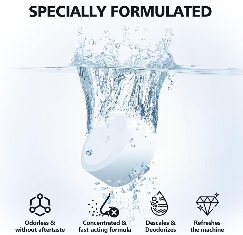 Bulk Coffee Maker Cleaner Tablet: 34 Tablets work out to two year supply or more.Compared to other products like powder, sachet and packets, there is no messy spilled liquid or powder. Choose USKICH coffee machine descaler to keeping your machine clean longer! Enjoy Better Tasting Coffee: The espresso machine cleaning tablet maximum efficiency removing hard water buildup, calcium, limescale, grime and oil in coffee machine, deeply cleans all internal parts and deodorizes.Taste your coffee, not the nasty buildups in your machine. Ingredients Safe: Our Coffee maker cleaner tablet Ingredients PEG 6000, Sodium carbonate, Citric Acid Anhydrous, Sulfamic acid, Starch. A gentle formula to clean and descale your machine. Easy to Use: Drop one coffee machine cleaner tablet into coffee machine, Run Brewing or clean cycle, discard treated water and run a cycle With fresh water. Then enjoy fresh coffee! Using our coffee pot cleaner and descaler tablets regularly to keep your coffee maker running like new Works on All Brands:Compatible with all brands including Breville, Kuerig, Nespresso Vertuo, Philips, Urnex, Moccamaster, Affresh, Kurig, Zojirushi, Verismo, Cuisinart, Oxo, De Longhi, biocaf, Kitchen aid and more