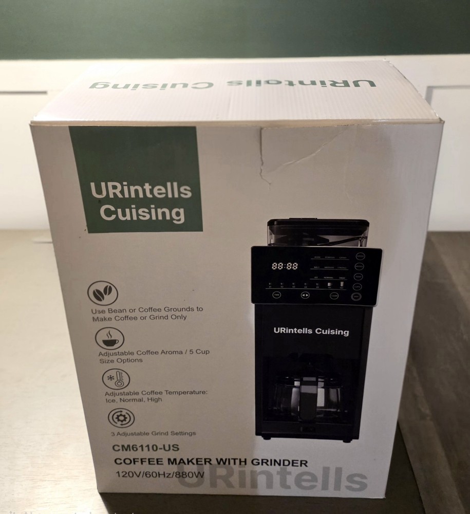 This Coffee Maker w/ Grinder is like new. Used one time and cleaned thoroughly. Looks like new. Works as it should. Makes hot or iced coffee. In original box w/ instructions. Brand is URintells Cuising Model is CM6110-US The product is a programmable hot and cold coffee maker that comes with a grinder, carafe, filter, grinder conical burr, brush, and powder funnel included. It can make 22 oz of coffee and is designed for everyday use in various settings like home and office. The coffee maker is a modern style with a matte finish and has automatic shutoff for safety. The programmable feature allows for convenient scheduling, and the touch control method makes it easy to use. Made of plastic and glass, this coffee maker is a sleek and functional addition to any kitchen or workspace.
