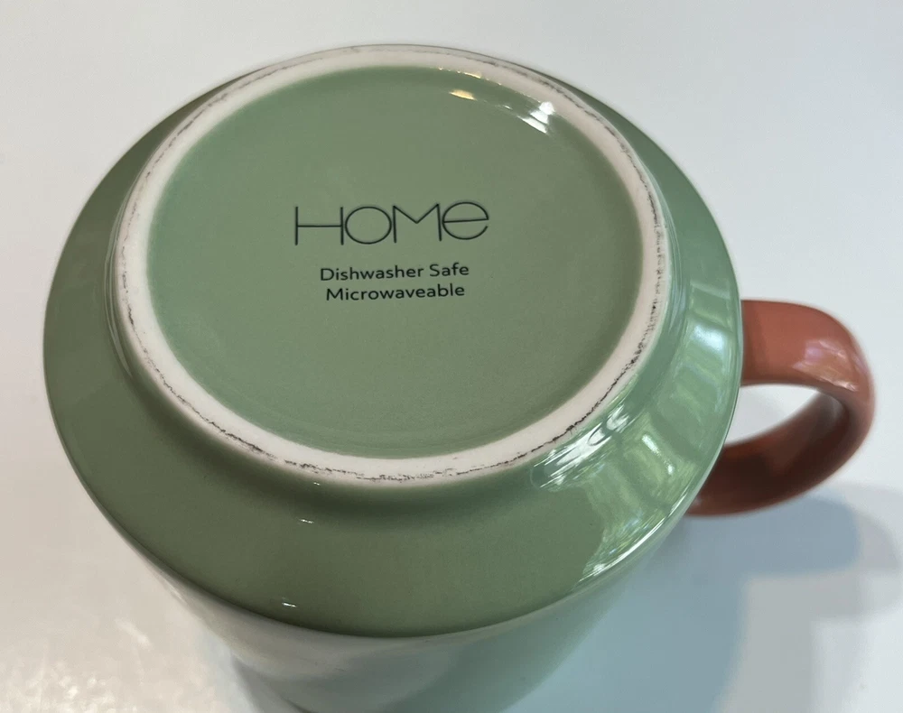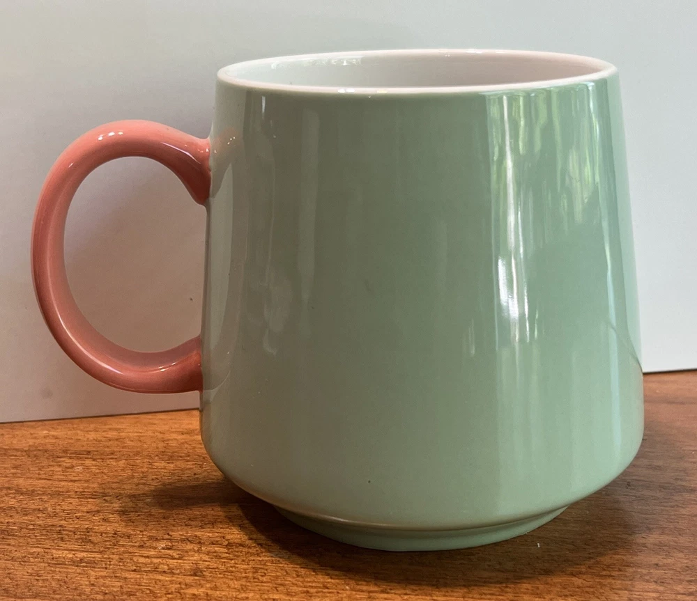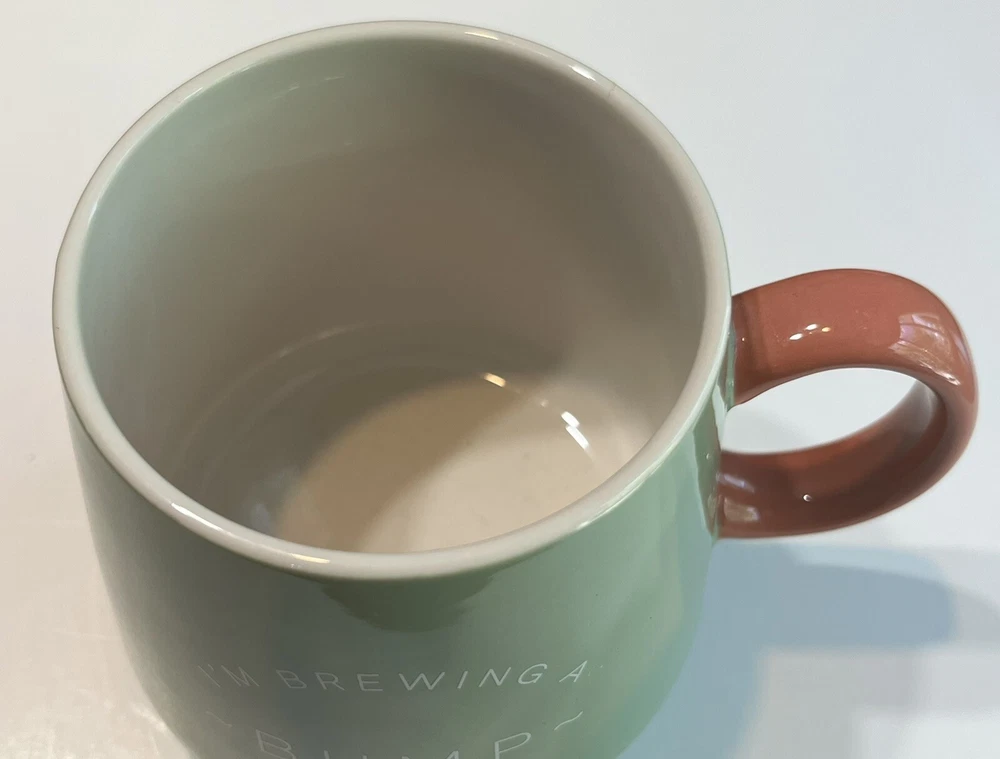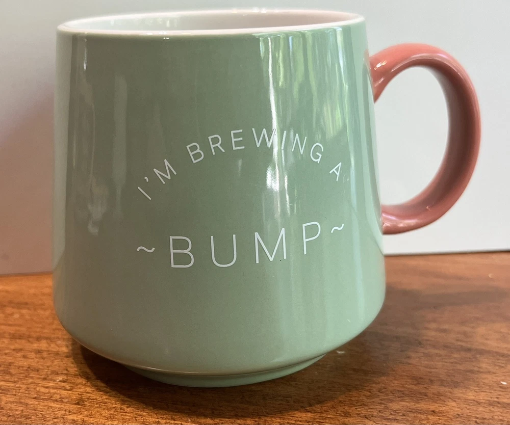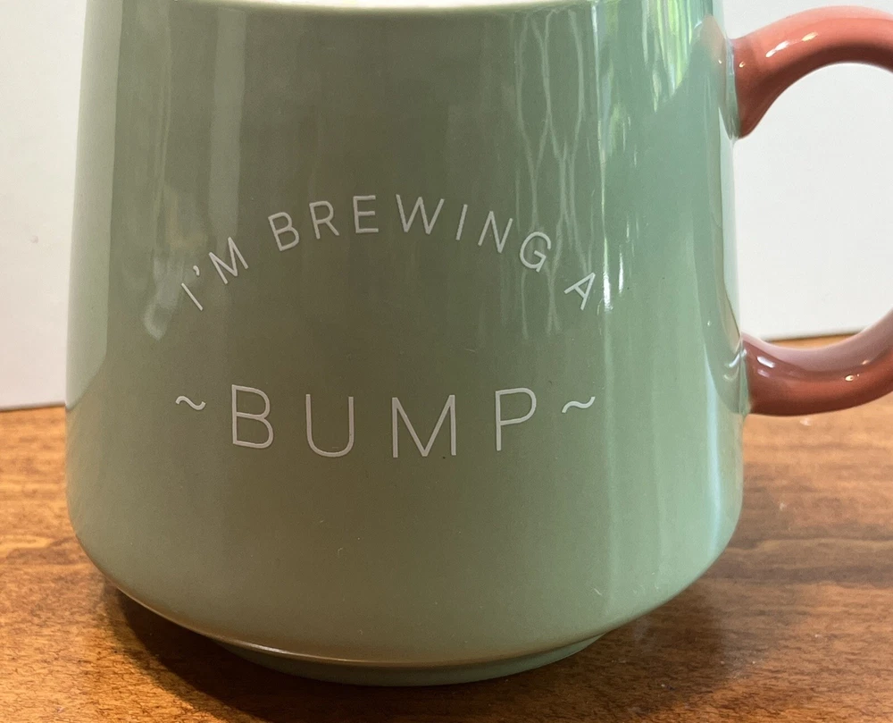cute oversized coffee mug with the saying “brewing a bump”. Light green outside with pink/salmon colored handle.