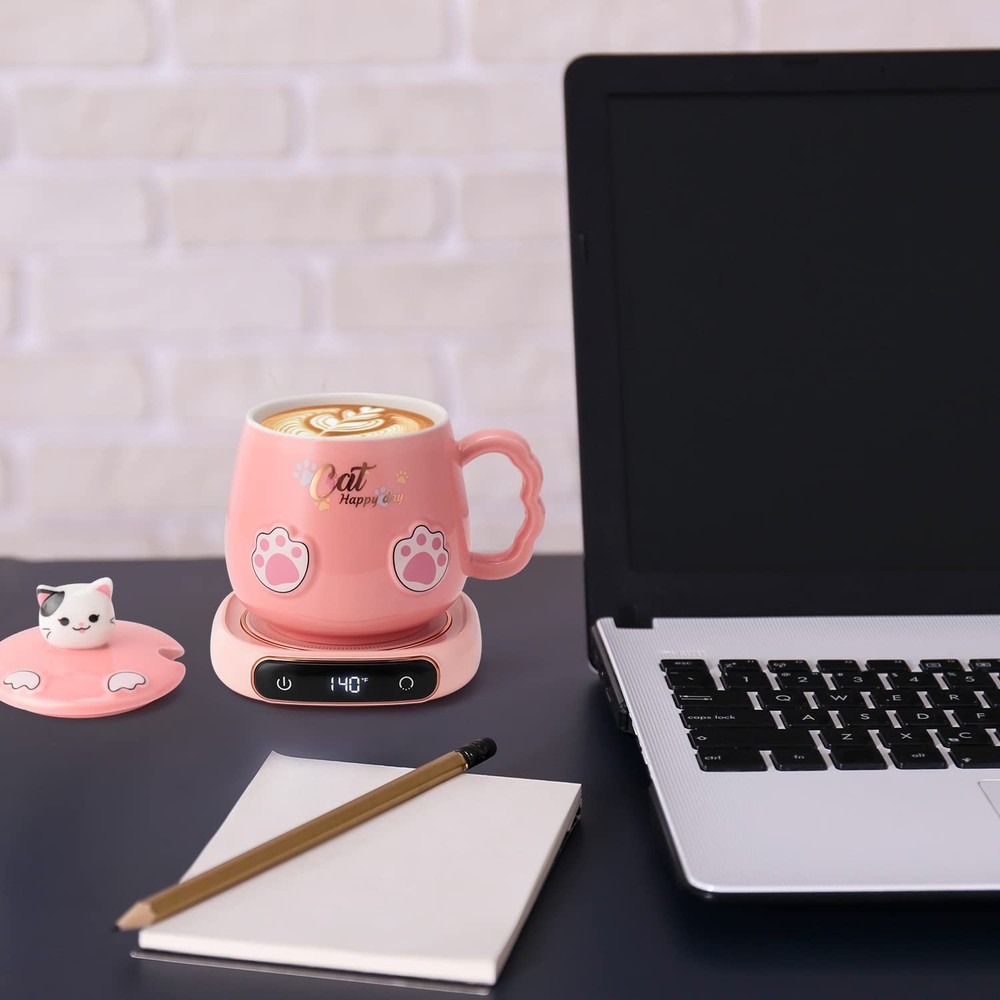 Mug warmer Ultra-compact Mug Warmer : Mini Smart Coffee Mug Warmer for Coffee and Tea, Portable Cup Warmer for Travel, Office Desks, and Home, Easy to tote and take anywhere. 110 V 230 V dual voltage with US plug can be use all over the world Special Flat Bottom Cat Mug : Cute Cat Mugs with flat bottom, Which makes the bottom fully fit the warmer heating plate, so this mug would stay hot to warm up the beverage inside,100% ceramic material 3-Temperature Setting: Coffee cup warmer will keep your coffee at a perfect drinking temperature, keeping beverage up to 113 ° F/131 ° F/140 ° F by touching the Temperature Setting Button. You can enjoy your hot coffee any time 8-Hour Auto Shut-Off : This coffee warmer will automatically shuts off after 8 hours of continuous operation. So you don't have to stress if you forget to turn it off, there is no safety hazard Safe and solid : With high-tech materials make the coffee warmer heat-resistant and fire-resistant. 53" long length ETL power cord is more convenient and safer than other brands. Product-safety with standard ETL Intertek5009505 certification. Back with 100% satisfaction service Best Present Choice : Stylish and Cute design, keep the beverages warm all day, this mug warmer and cat cup set is a best gift for coffee lovers and families. Tea warmer will be your best gift choice to show your care to your loved friends on Mother's Day, Christmas, Valentine's Day, Thanksgiving, Birthday or other special occasions