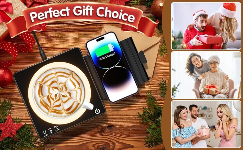 Coffee Mug Warmer, Smart Mug Warmer 15W Wireless Charging for Desk/Home, 3 Heat Settings Temperature Controlled, 8H Auto Off, Candle Warmer, Safe for Heating Coffee, Beverage, Milk, Tea About this item 🔥WHOLEV Coffee Mug Warmer: Elevate Your Beverage Experience 🔥 👋 Say goodbye to lukewarm drinks with our state-of-the-art Mug Warmer! Designed for coffee aficionados and tea enthusiasts, WHOLEV innovative device ensures your beverage remains at the ideal drinking temperature. 🌡️【Smart & Temperature Controlled】Enjoy your drinks at the perfect warmth! With three heat settings, ranging from a cozy 113°F, 131°F to a toasty 149°F (45-65℃), this mug warmer keeps your coffee, tea, milk, or any beverage at your desired temperature, all with the touch of a button. 💡【Effortless Operation & Intuitive Design】Changing temperatures is as easy as a touch. Our electric coffee cup warmer features a sensitive-touch button for effortless on/off operation and temperature adjustments. The sleek LED strip light makes night-time use a breeze. ⏲️【Safety & Convenience】No more worries about leaving it on! With an 8-hour auto-shut-off function, our mug warmer ensures safety and peace of mind. The single-touch button and user-friendly design make it perfect for both home and office use, with an extra-long cord for added flexibility. 📱【Phone Charging & Candles Warmer】Stay connected while enjoying your favorite drink! You can charging your phone which have wireless function for your makes multitasking effortless. Beyond coffee and tea, this warmer is perfect for heating various beverages or even candles. It's safe, efficient, and designed to complement your lifestyle without compromising safety. 🥃【Compatibility & Care】For optimal performance, use thin-walled or flat-bottomed mugs. Please don't use double-layer insulation cups. For your safety, please do not use heat-labile containers such as paper and plastic cups. Coffee warmer is waterproof and easy to clean, which has rubber non-slip foot pad, stable and not easy to slip off. 🎁【Perfect for Gifting】Whether for yourself or a loved one, the WHOLEV Coffee Mug Warmer makes for an ideal gift for Christmas, Birthdays, Valentine's day and more. Experience the joy of perfectly heated beverages and the convenience of wireless charging. Product Description WHOLEV Coffee Mug Warmer with 15W Wireless Charging Pad, A Warm Mug, A Cozy Moment! Where every sip stays at your perfect temperature! Enjoy the luxury of three heat settings, an 8-hour auto-off function, and seamless phone wireless charging. Whether it's your morning coffee, evening tea, or a cozy cup of cocoa, relish every sip at just the right warmth. Elevate your beverage experience at home or work with our smart and safe mug warmer. Get yours today and savor warmth in every sip! All in One. 15W wireless charging pad service Your Phone, Three temperature setting Warm Your Drink. You Will Get: 1x Milk warmer 1x 3A power supply 1x manual Whether you're at work, studying, or relaxing at home, our Mug Warmer ensures your coffee, tea, or hot cocoa stays at the perfect temperature until the last sip. Your Drink, Your Ideal Temperature. Features: Instant Heat: Keep your favorite beverages warm at your preferred temperature. Easy to Use: Simply plug in and place your mug for a toasty drink within minutes. Sleek Design: A chic addition to any desk or coffee table. Use a thin-walled, flat, or slightly concave-bottomed mug for best results. Please don't use double-layer insulation cups. For your safety, please do not use heat-labile containers such as paper and plastic cups. Perfect for: Homebodies Busy Professionals Students Coffee & Tea Enthusiasts Start Using Plug the 3A power supply, press the power icon. The LED circle light up. And the wireless work, too. First Gear Heating Double press the power icon, the first gear heating function start. Second Gear Heating Another double press the power icon, Second gear heating function start. Third Gear Heating & Closure One more double press the power icon. The third gear heating function starts. Then single press the power icon the heating function close. Transform your space into a cozy haven with the Candle Warmer! Experience the magic of gentle, consistent warmth that brings your favorite scents to life. Our versatile coffee mug warmer isn't just for coffee – it's also candle warmer. With its safe and efficient design, indulge in a calming atmosphere without worrying about open flames. 15W Fast Wireless Charging Station Compatible with iPhone 15 14 13 12 Pro XS 8 Plus Samsung Galaxy S23 S22 S21 Note 20 Google etc