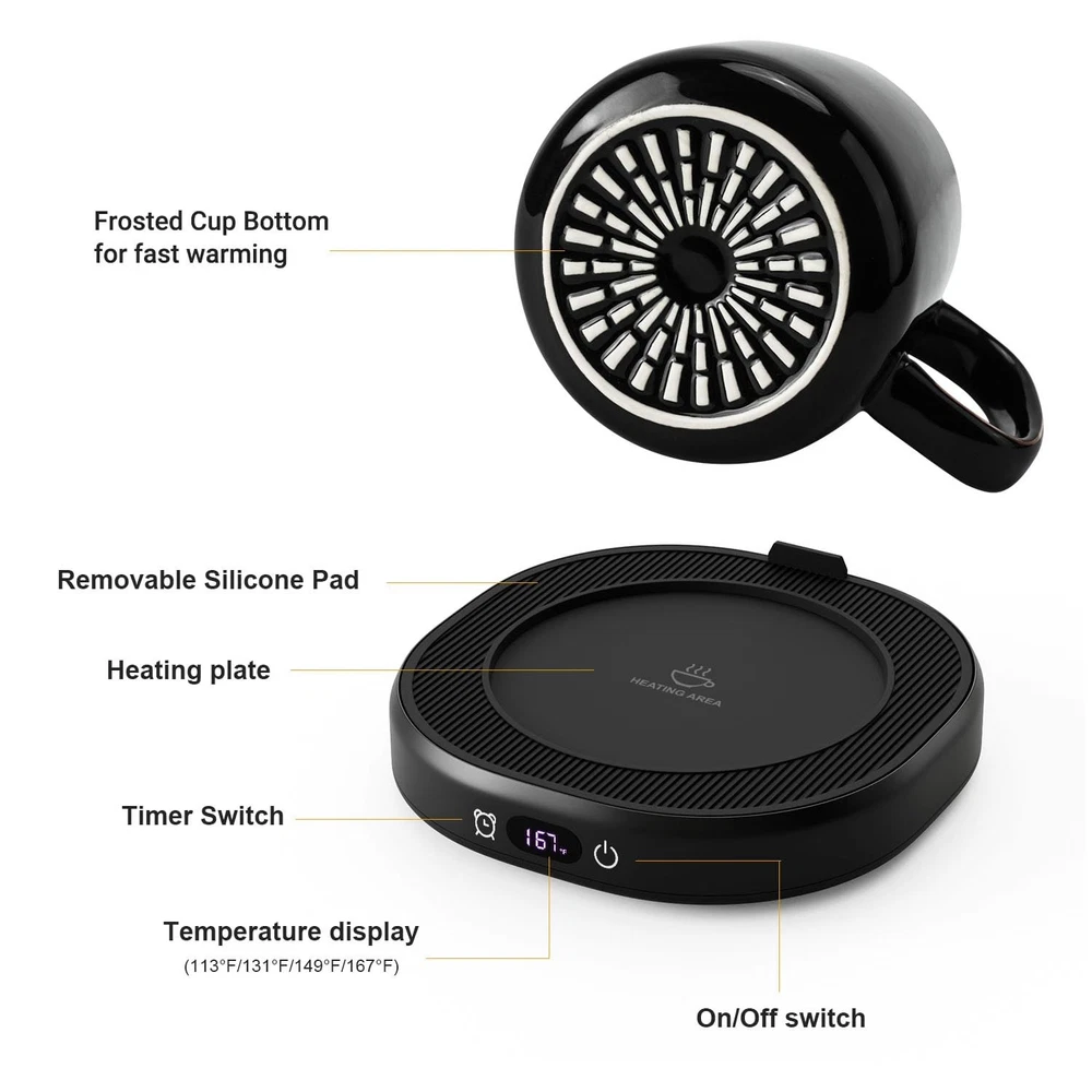 Smart Coffee Mug Warmer & Mug Set, Beverage Cup Warmer for Desk Home Office, Candle Warmer Plate for Milk Tea Water with Two Temperature Setting(Up To 140℉/ 60℃), 8 Hour Auto Shut Off Adjustable 4-Temperature Setting: Coffee warmer will keep your coffee at a perfect drinking temperature. You can control the temperature by tapping the button, keeping your coffee, tea or milk up to 113°F/131°F/149°F/167°F Intelligent Timed Design: Coffee cup warmer will auto shut off 8 hours after the last operation by default. We also set up 4 options of 2 H/4 H/6 H/8H according to different use conditions of users. You can set the automatic shutdown time according to your own needs. Warm drink available at your wanted time. Safe and energy efficient. No worries about forgetting turn mug warmer off Compatible with Most Cups: The heating plate adopts sealed-insulation technology to prevent splashing water, 4.5 inch heating plate is also fits for other glass cup, stainless steel cup, porcelain cup etc. NOT suitable for plastic cups and double insulation mugs. When using a small sized cup, the silicone rubber ring design on the top of the cup cushion can not only reduce heat dissipation, but also protect your hands from scalding Fast-Heating 14 oz Mug: 14 oz(400 ML) capacity can meet your daily needs and lid to cover the mug will also help retain heat. This ceramic mug is designed with special frosted cup bottom for fast heating, no more wait, just enjoy your hot coffee at any time Best present Choice: Cup Warmer with mug set comes in a novel and cute packaging. the mug has been carefully printed with ''Sometimes You Forget YOU ARE AWESOME, so this is your reminder'', this great tea warmer is ideal choice for present on Birthday, Thanksgiving Day and Christmas and so on