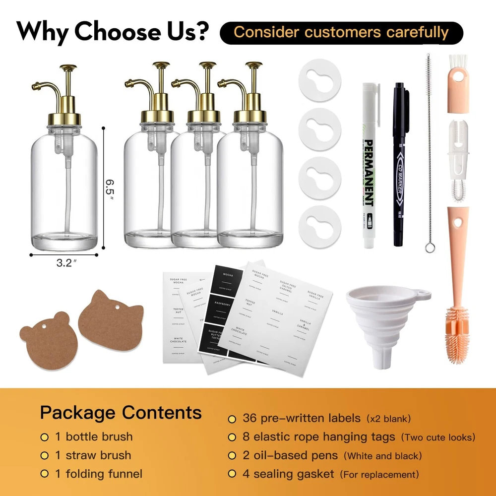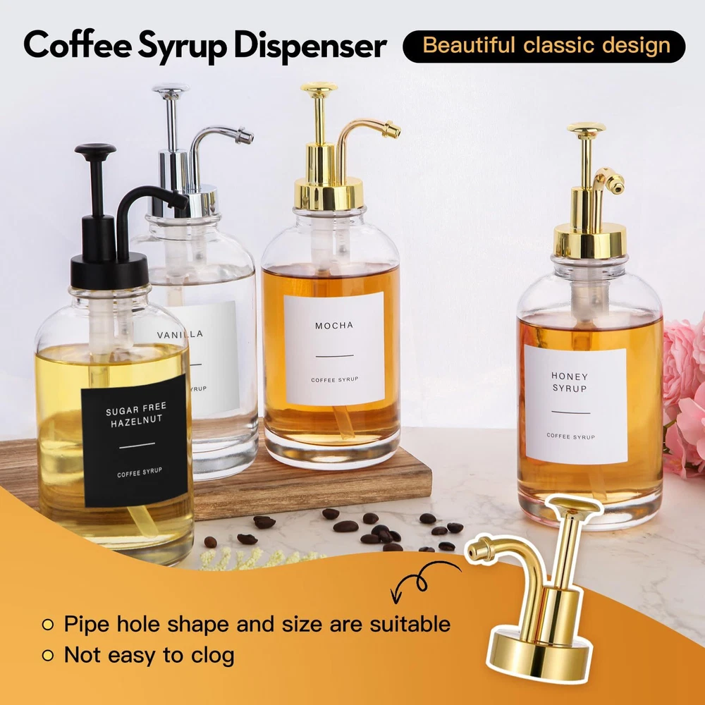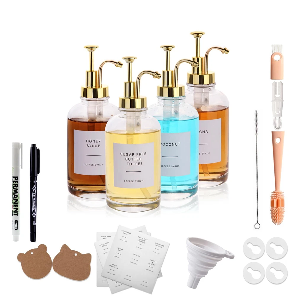 【Dispenser Set Contents】Each set contains 4x16.9 ounce high-quality coffee syrup bottles, 4 metal-style PVC pumps, 36 preset self-adhesive label papers, 8 elastic cord hang tags (cute shapes), 1 Multifunctional bottle brush, 1 straw brush, 2 pens (black and white), 1 folding funnel, 4 sealing gaskets (for ) 【Multi-purpose Use】This multi-function dispenser is perfect as a coffee syrup dispenser. It can also be used in a variety of condiments and liquids, including cooking oil, ketchup, mustard, salad dressing, soy sauce, shampoo, shower , hand soap, mouthwash, dish soap, etc. 【Usage Scenario】This liquid dispenser with pump is of minimalist style, classic and practical, looks beautiful and luxurious, it is suitable for use in cafes, homes, bars, kitchens, restaurants, hotels, coffee carts and other places, and can be used in any place. These places look more stylish and elegant. 【High Quality Product】Our glass syrup dispenser is made of high quality glass, with a thick bottom design that is not easy to pour. It has a good seal and will not leak easily, and can preserve your food well. 【Ideal Gift Choice】Our coffee syrup dispensers are perfect housewarming gifts, holiday gifts for family or friends, especially for coffee lovers or anyone who likes a well-equipped coffee bar, each set of dispensers After careful packaging to ensure safe delivery, if you receive the goods, please us directly if you have any questions, our professional team is always ready to help you solve the problem.