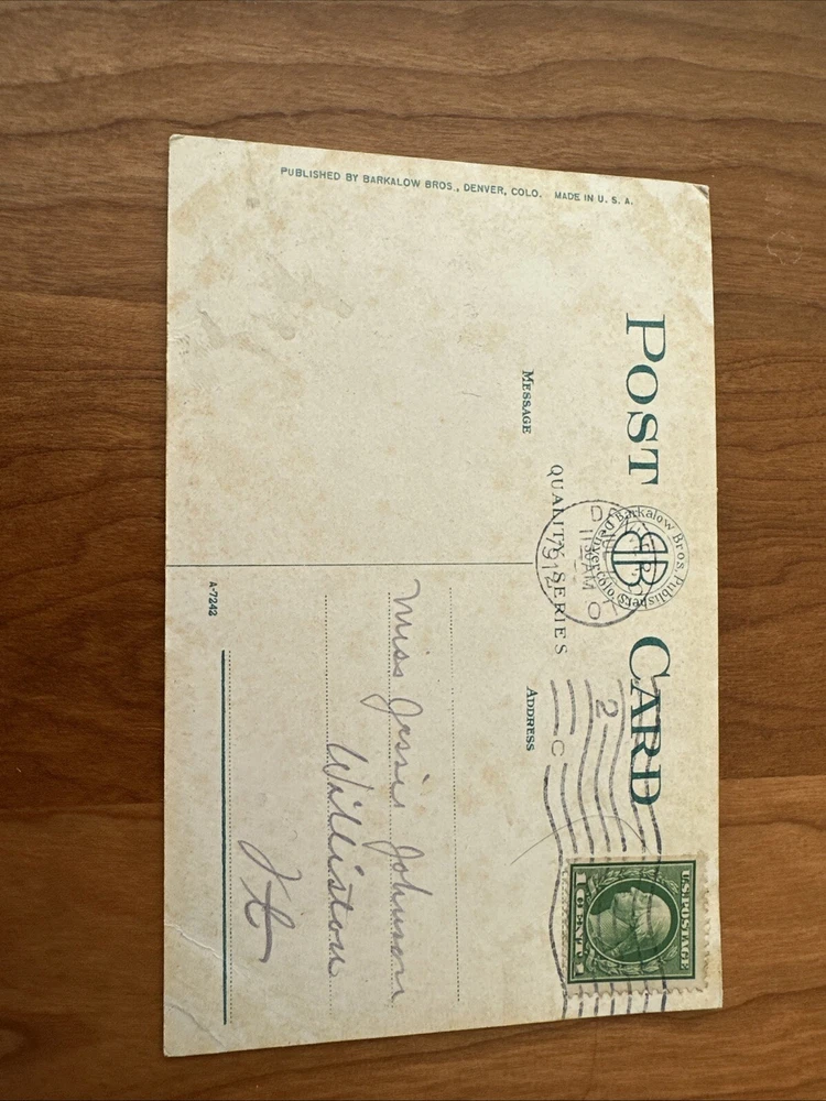 This is a postcard featuring a cog wheel train climbing Pikes Peak in Colorado, USA. The postcard is an original from 1912 and was posted. It is made of paper and showcases a topographical view of the train ascending the iconic mountain. The location is Pikes Peak in Colorado, North America.