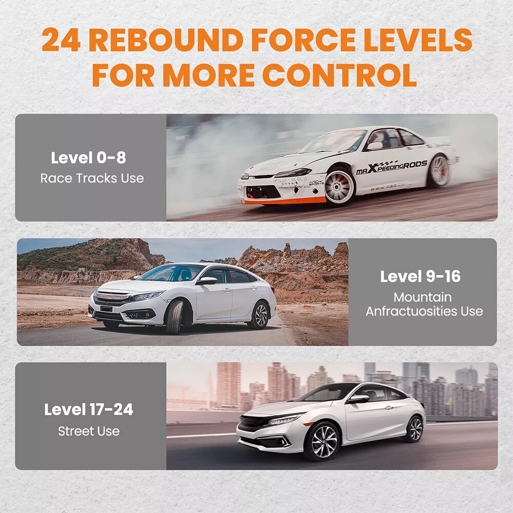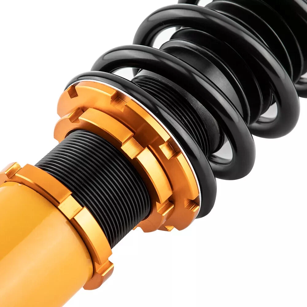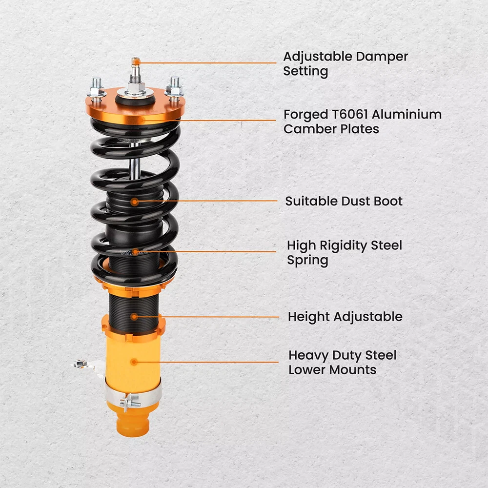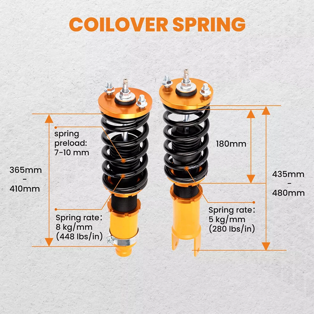 Features - 24 Step to adjust soft / hard adjustment according to your preference - Ride Height Adjustable - Drops From 1 to 3 Inch From Factory Ride Height - 55CrSi high strength durable cold wound steel & heat treated coils - Manufactured from high quality T-6061 billet aluminum with an anodized finish for superior strength and corrosion protection. - Improved Handling and stability without premature tire wear - Improved Vehicle Stability and traction in hard cornering situations - Full threaded absorber tube casing for independent height adjustment - Twin-Tube System for Comfortable Ride on Streets Application For Honda Civic / CRX 1988-1991 EE EF EC For Honda Civic 1992-1995 EJ EG EH fork type For Honda Civic 1996-2000 EK For Acura Integra 1990 -1993 DA DB fork type For Acura Integra 1994-2001 Specifications - Front and Rear top mount: rubber - Damping: 24 levels rebound damping adjustable - Spring rate Front: 8 kg/mm (448 lbs/in) - Spring rate Rear: 5 kg/mm (280 lbs/in) - Spring length Front: 180mm - Spring length Rear: 180mm - Adjustable height: lowering 1-3inch - Coilover overall length Front: 365mm-410mm - Coilover overall length Rear: 435mm-480m - Shock type: Twin tube - Spring Preload: 7-10 mm Package included - Complete 2 Front + 2 Rear coilovers - A pair of wrenches for height adjustment - For some vehicles, you will need sleeves and washers that already included in our package.