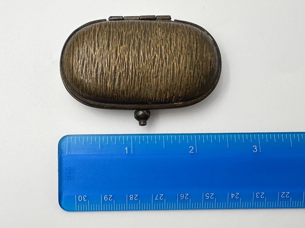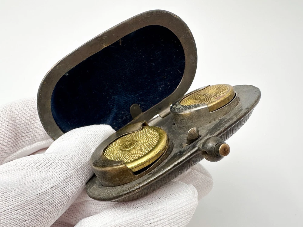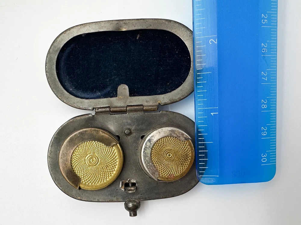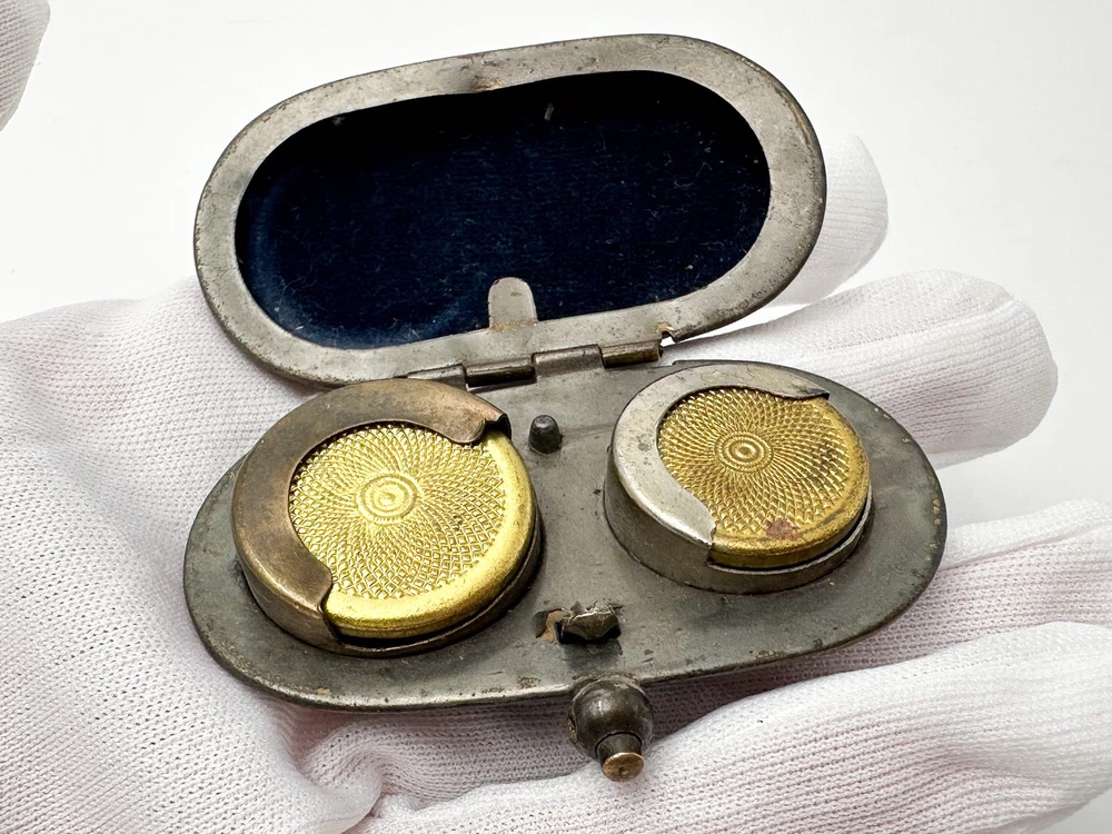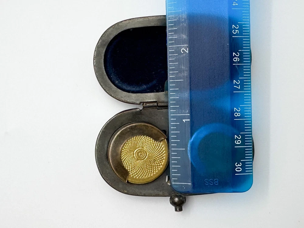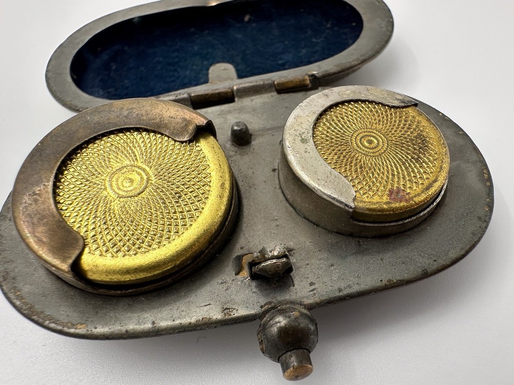 Beautiful vintage metal coin purse (monetnitsa), featuring two brass coin compartments with fine guilloché texture. This elegant and practical small accessory was used for carrying coins, possibly dating from the early to mid-20th century. - Material: Metal body with brass lids - Color: Silver tone with gold-tone brass - Size: Compact - fits comfortably in the palm of the hand - Condition: Good vintage condition with age-related patina and minor wear consistent with age and use - Mechanism: Push-button release, spring-loaded lids for two coin compartments - Elegant vintage craftsmanship - Rare dual-compartment design Great collectible or prop for period displays Could be a great gift for someone you love or can be added to your collection. Contact me if any questions. I do offer combine shipping discount if you buy 2 items or more. I make shipments the next business day after the purchase. Buyer protection is in effect. Please watch the photos carefully as they are important part of description. Thanks for your interest. Have a look at some other lots at our store. 💛💙
