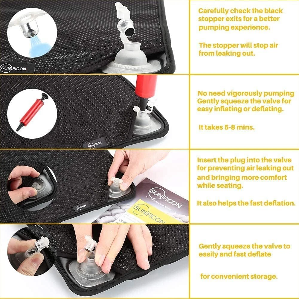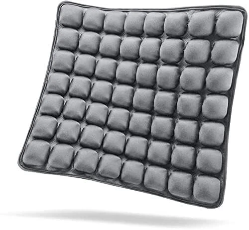 ERGONOMIC DESIGN: Compared to foam support cushions, 's Inflatable Air Seat Cushions is durable and adjustable. It's easy to reach your desired inflation level, 70%, 80% or even fully pumped, it's your comfort and your choice. With hassle free MADE TO LAST: Now for the science part, our high resilience chairs seat pad is covered with comfortable Lycra fabric that is hard wearing and easily washable. The silica grip keeps your seat cushion where you want it to be. To top things off the air pockets are made from eco-friendly TPU materials VERSATILE: Support up to 275 lbs with this chairs seat cushion wherever you need it. Got a long journey ahead? We got you covered! Deadline at the office? No problem! Working on that thesis? Take a seat on this! Maximize your productivity and comfort FRESH AND DRY: Our design maximizes air circulation, when cell is compressed the air flows to other cells around it. Therefore reducing heat transfer and that uncomfortable office chair feeling, all whilst supporting your posture; preventing sede LONG LASTING COMFORT: Specially designed to provide extra support for your hip and back with 56 plump 3D air cells covered with breathable Lycra fabric. This air inflatable seat cushion provides excellent lumbar support which can help to disperse pressure from sitting up to 30% which is proven to reduce aches and pains