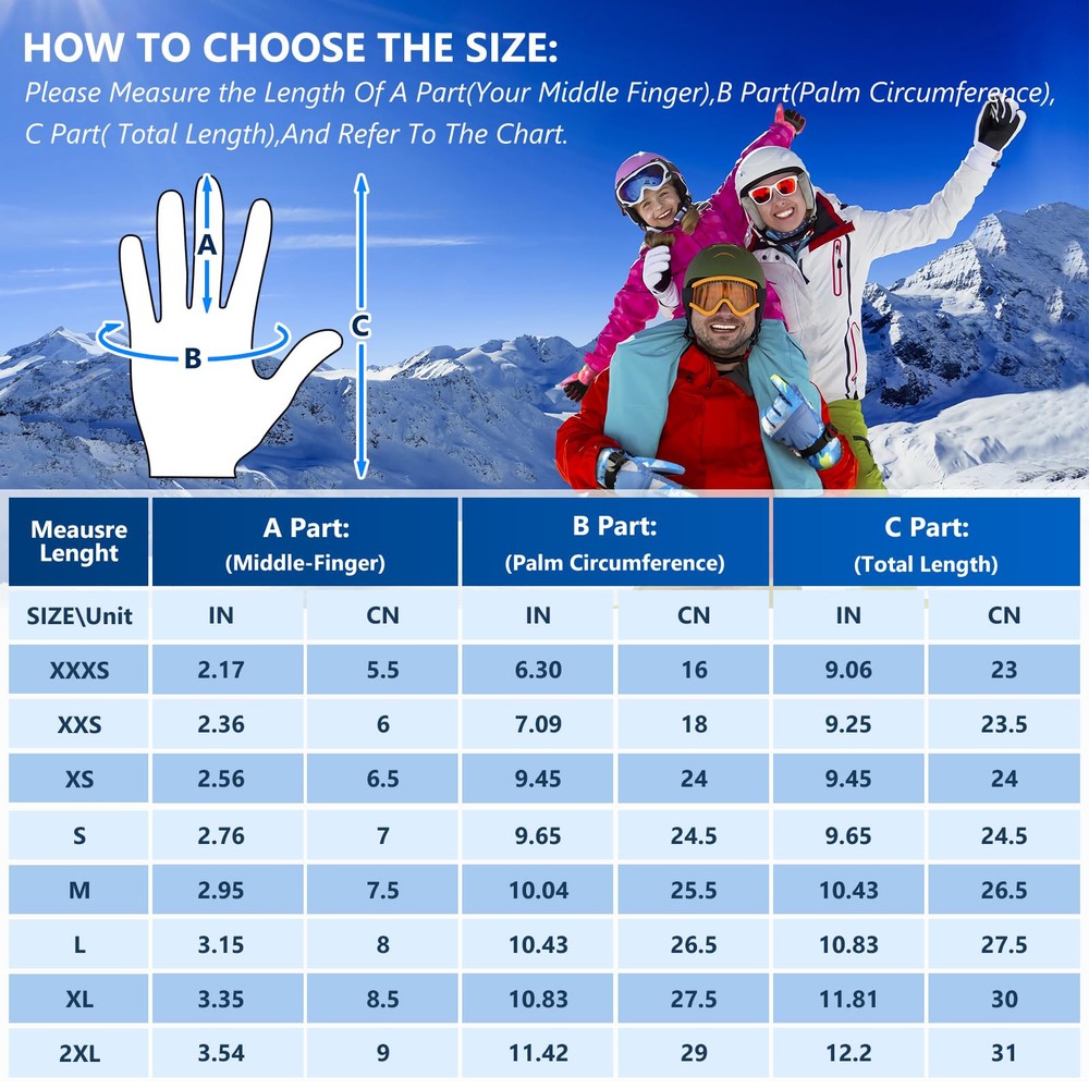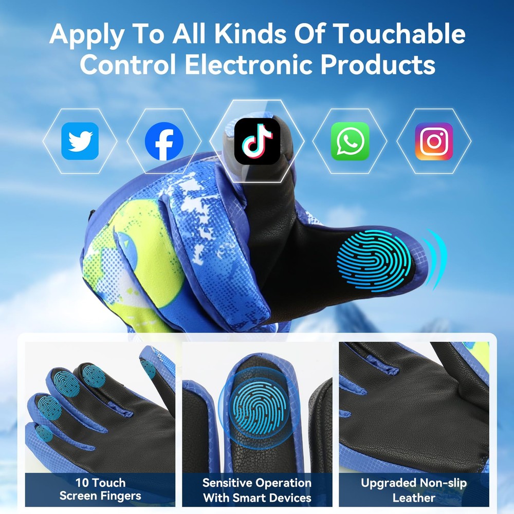 【3M Thinsulate Insulation】The Ski gloves are insulated with warm and lightweight thinsulate 3M,which is thick enough to keep hands warmth in cold chilly weather in skiing, snowboarding, winter riding, hiking and other snowsports. 【Touchscreen Fingertips】Our winter ski gloves are designed with touchscreen-compatible materials on the fingertips, allowing you to use your smartphone or other devices without removing the snow gloves. You do not need to take off the ski gloves when skiing or doing some other winter sports. 【Waterproof and Windproof 】The Snow Gloves composite three-layers softshell prevents cold wind and snows outside in riding and skiing. The insert waterproof TPU membrane provides entirely guards to keep hands dry in long time snowsports at outdoors. It's better to air dry for a while if sweats a lot. 【Zipper Pocket and Custom Fit】The pocket is easy to carry keys, ID cards or little cash as well as smaller size gloves warmers. The adjustable buckle wrist strap and the drawstring closure is effectively prevents against cold air outside.Flexible Design Children Gloves,ergonomic pre-Curved fit and removable wrist leash for flexible stretching of your hands. 【WARMER and DURABLE MATERIAL】: Snow gloves are made of double thicken locking thermal fleece, waterproof TPU and Splashproof outer materia, which are moisture-wicking, superior breathablity, warmth and comfortable. Resist the temperate under -22°F TO -4°F.