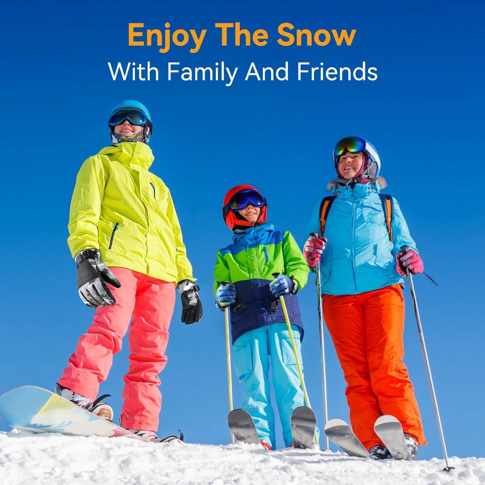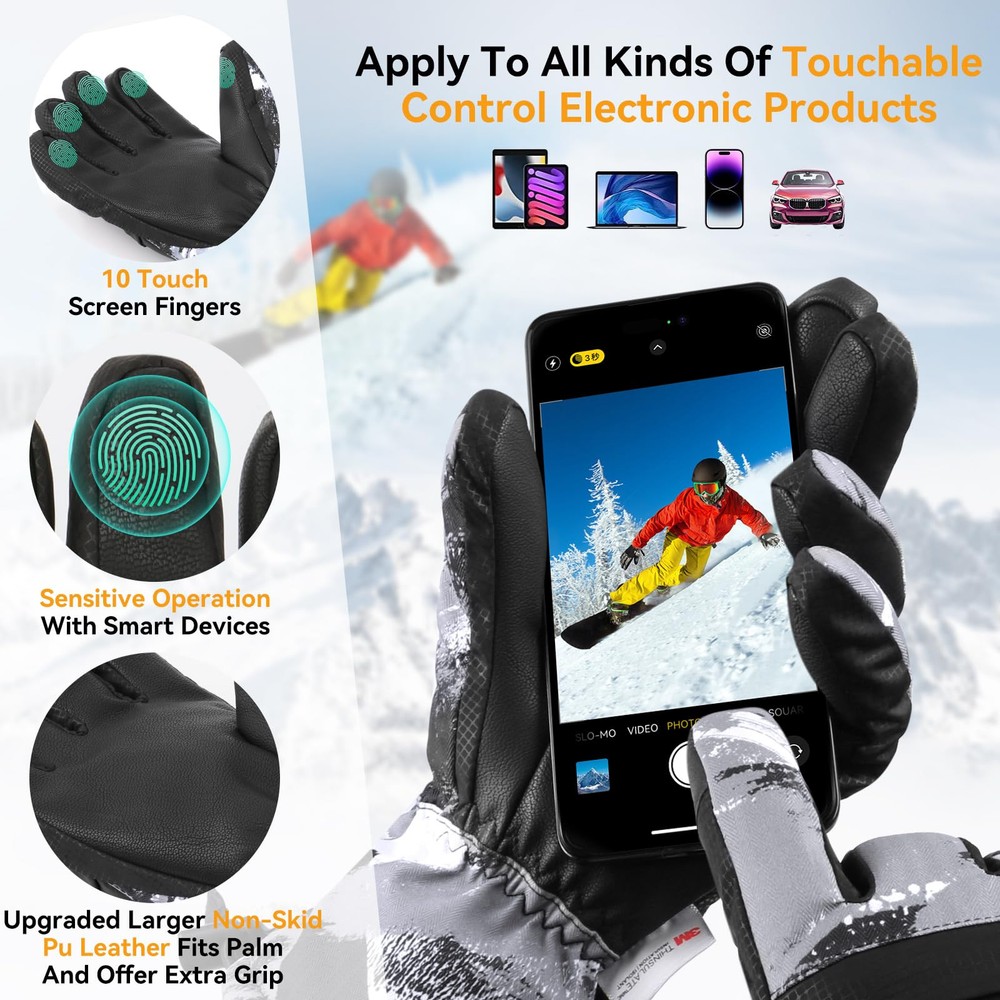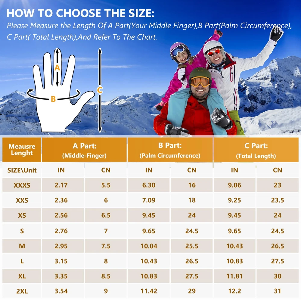 【Waterproof and Windproof 】The Snow Gloves composite three-layers softshell prevents cold wind and snows outside in riding and skiing. The insert waterproof TPU membrane provides entirely guards to keep hands dry in long time snowsports at outdoors. It's better to air dry for a while if sweats a lot. 【3M Thinsulate Insulation】The Ski gloves are insulated with warm and lightweight thinsulate 3M,which is thick enough to keep hands warmth in cold chilly weather in skiing, snowboarding, winter riding, hiking and other snowsports. 【Zipper Pocket and Custom Fit】The pocket is easy to carry keys, ID cards or little cash as well as smaller size gloves warmers. The adjustable buckle wrist strap and the drawstring closure is effectively prevents against cold air outside.Flexible Design Children Gloves,ergonomic pre-Curved fit and removable wrist leash for flexible stretching of your hands. 【Touchscreen Fingertips】Our winter ski gloves are designed with touchscreen-compatible materials on the fingertips, allowing you to use your smartphone or other devices without removing the snow gloves. You do not need to take off the ski gloves when skiing or doing some other winter sports. 【WARMER and DURABLE MATERIAL】: Snow gloves are made of double thicken locking thermal fleece, waterproof TPU and Splashproof outer materia, which are moisture-wicking, superior breathablity, warmth and comfortable. Resist the temperate under -22°F TO -4°F.