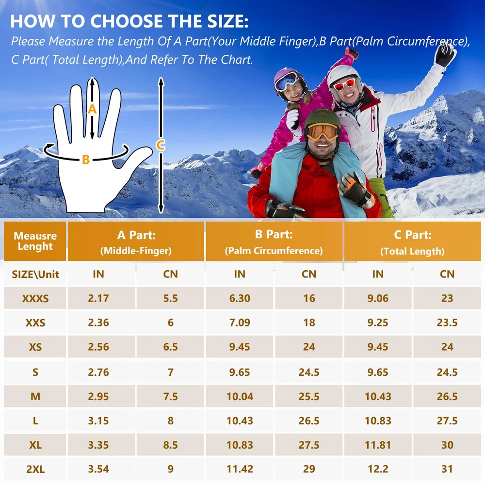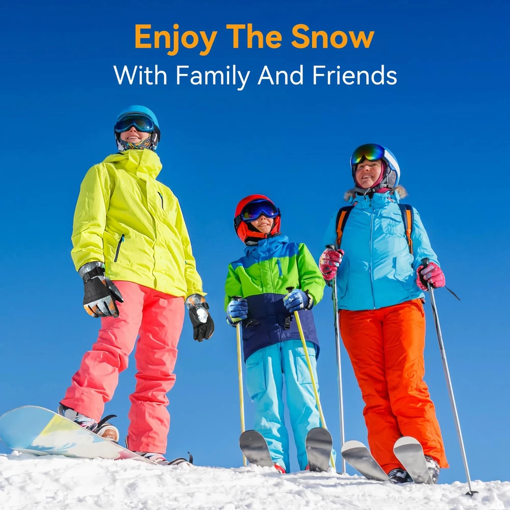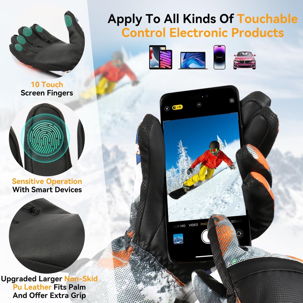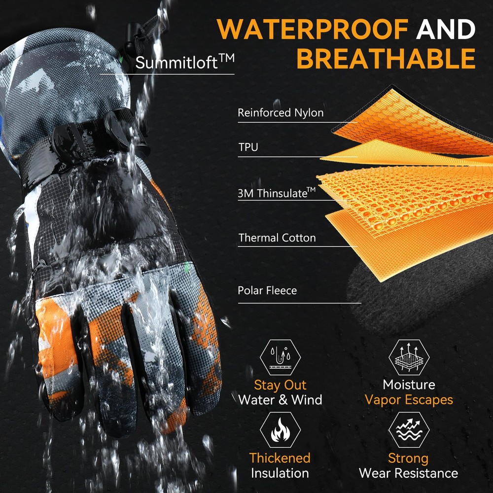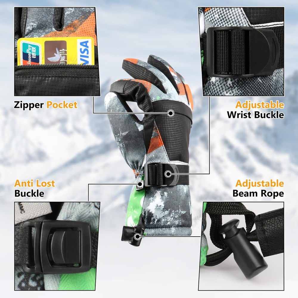 【Waterproof and Windproof 】The Snow Gloves composite three-layers softshell prevents cold wind and snows outside in riding and skiing. The insert waterproof TPU membrane provides entirely guards to keep hands dry in long time snowsports at outdoors. It's better to air dry for a while if sweats a lot. 【3M Thinsulate Insulation】The Ski gloves are insulated with warm and lightweight thinsulate 3M,which is thick enough to keep hands warmth in cold chilly weather in skiing, snowboarding, winter riding, hiking and other snowsports. 【Zipper Pocket and Custom Fit】The pocket is easy to carry keys, ID cards or little cash as well as smaller size gloves warmers. The adjustable buckle wrist strap and the drawstring closure is effectively prevents against cold air outside.Flexible Design Children Gloves,ergonomic pre-Curved fit and removable wrist leash for flexible stretching of your hands. 【Touchscreen Fingertips】Our winter ski gloves are designed with touchscreen-compatible materials on the fingertips, allowing you to use your smartphone or other devices without removing the snow gloves. You do not need to take off the ski gloves when skiing or doing some other winter sports. 【WARMER and DURABLE MATERIAL】: Snow gloves are made of double thicken locking thermal fleece, waterproof TPU and Splashproof outer materia, which are moisture-wicking, superior breathablity, warmth and comfortable. Resist the temperate under -22°F TO -4°F.