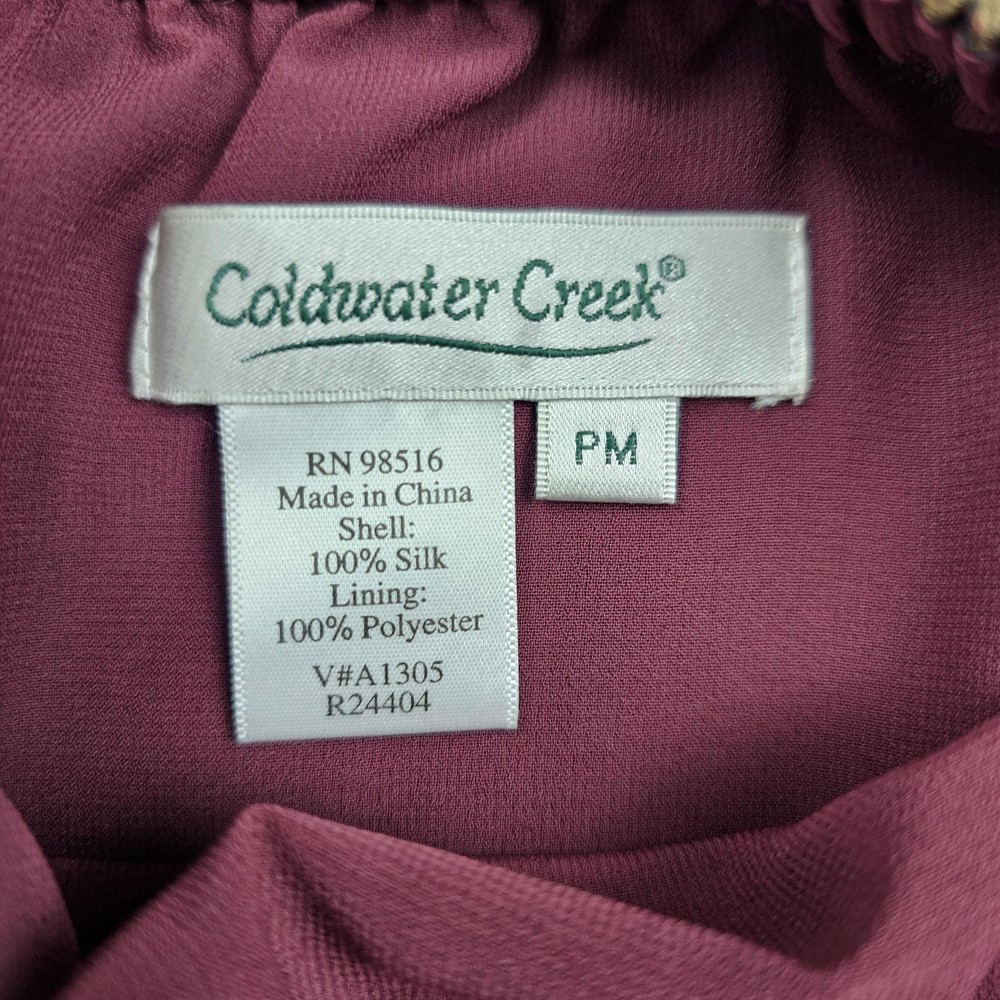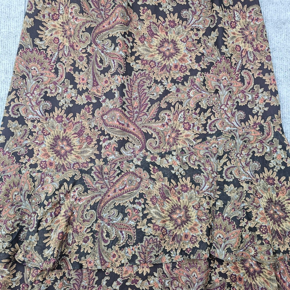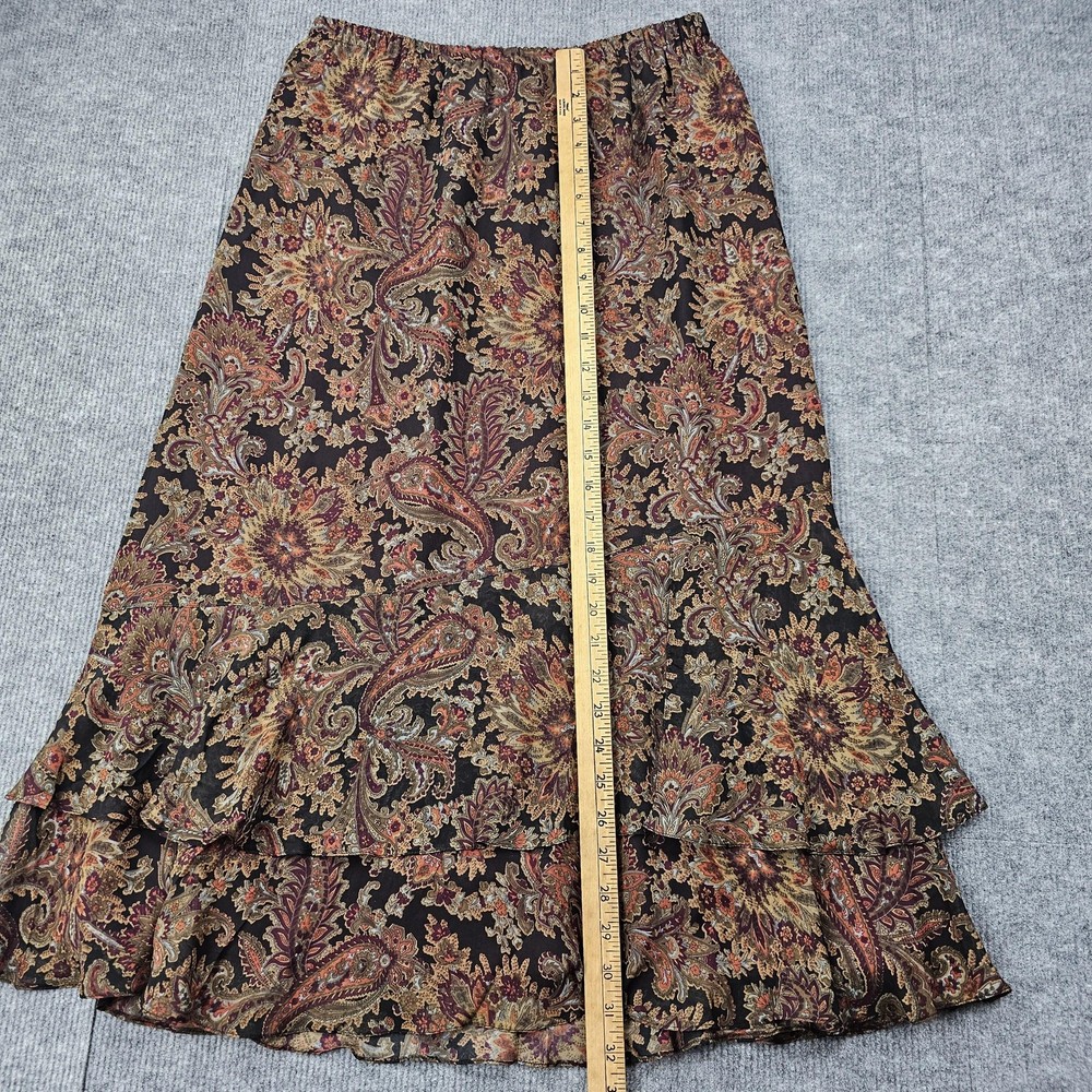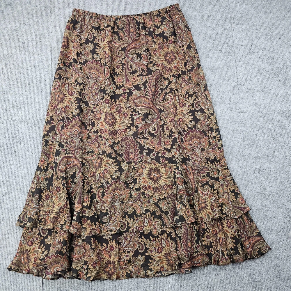 Coldwater Creek Skirt Womens Petite Medium Brown Paisley Floral Silk Lined Boho Condition: Gently worn, no visible flaws, excellent used condition Shell: 100% silk; Lining: 100% polyester Features allover paisley and floral print in warm brown, gold, and burgundy tones Flounced tiered ruffle hem for movement and a bohemian look Pull-on style with elastic waistband for comfort Brand: Coldwater Creek Tag size: Petite Medium (PM) Approximate flat measurements visible in photos for length and waist Made in China