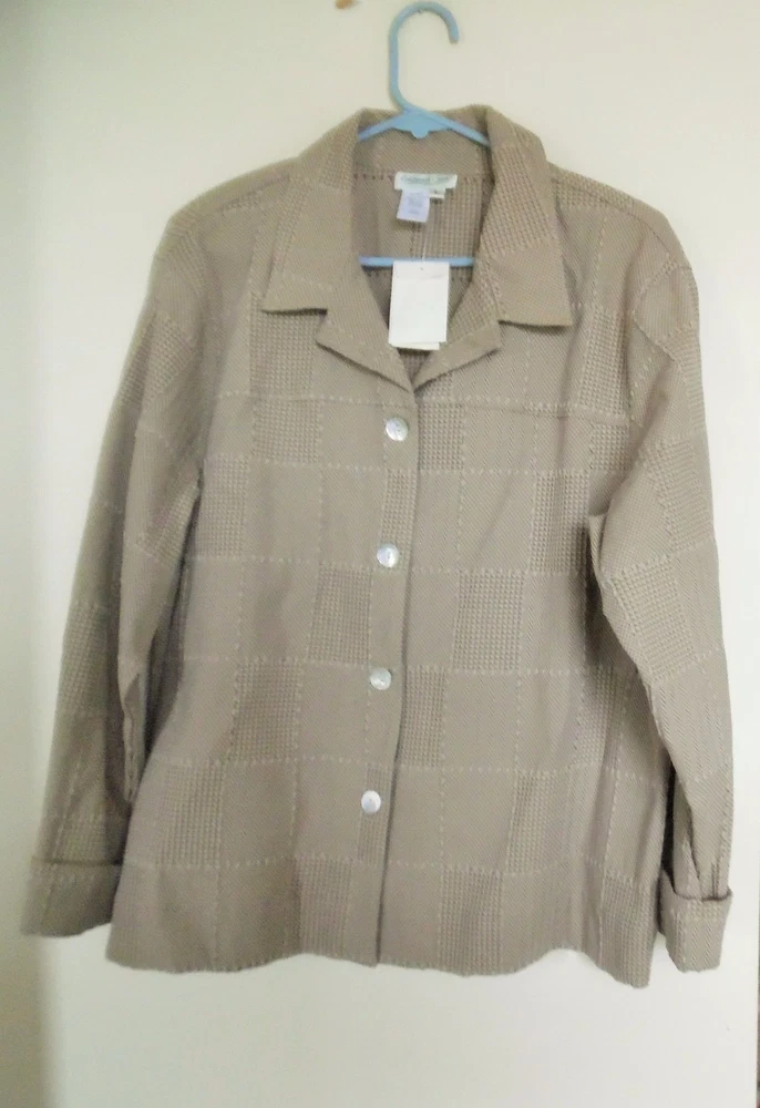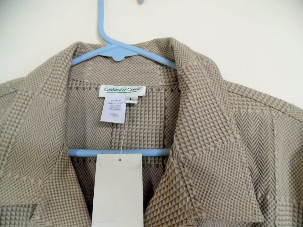 Coldwater Creek Sz L Patch Work Pattern Beige Jacket NWT Armpit-armpit: 23" Sleeve Length 22" Length: 27" AT Combined Shipment: USA : Highest item shipping cost + $3.00. for each subsequent item.Or, you can purchase as many items as you choose and pay the flat rate of $18.75 for your Priority Mail Large Flat Rate Box which covers your entire order. Please read the disclaimer below. INTERNATIONAL SHIPMENTS: Highest item shipping cost + $5. for each subsequent item. Please read the disclaimer below. DISCLAIMER on Shipping Costs: Our intention is to keep our shipping costs as low as possible. However, depending on the item purchased (weight) and the destination, shipping rates can vary; especially 30 Day?s No Questions Asked Returns Policy: Your satisfaction is very important to us. We have a 30 days NO QUESTIONS ASKED returns policy. The item must be returned in the condition in which it was purchased. If there are labels/tags they should not be removed. If they are, the item will be sent back to you. ANY SHIPPING COSTS WILL NOT BE REFUNDED. BOTH WAYS, receiving and any returns. Please contact us for the return shipping address and authorization. ALL COMMUNICATIONS MUST BE IN WRITING & TAKE PLACE THROUGH THE EBAY SITE ONLY. No private direct email correspondence. A customer care rep. will respond to you within 24 hrs (Mon-Fri). Once we have received the merchandise and inspected it, please allow 72 hours for a refund to be issued. NO See my other listings for more great items! We accept PAYPAL. Also we have a virtual terminal with PayPal through which we can accept Visa, MasterCard, Amex, and Discover. If you do not have a PayPal account, it takes virtually minutes to open International shipments: PLEASE DO NOT PAY until we determine your shipping costs. Most of our items also have an International Flat-Rate. Although, if due to the destination or the weight we are unable to honor the rate mentioned in the item?s listing, we will cancel your order and leave you positive feedback. Usually we use the US Postal Service. The best international rate for an international shipment is First Class (up to 4 lbs.)If your items exceed 4 lbs. we may pack them into two separate packages (and notify you of this).You still are eligible to take advantage of the combined shipping rates, even if we have packed them into two separate packages. The fees for packaging, shipping, insurance, Customs Duty Charges on international shipments are all the responsibility of the Buyer and are not included in the purchase price. If the item(s) are gifts, we could indicate ?GIFT? on the customs form so you would avoid paying more on duty. Add a map to your own listings. FREE Trial!