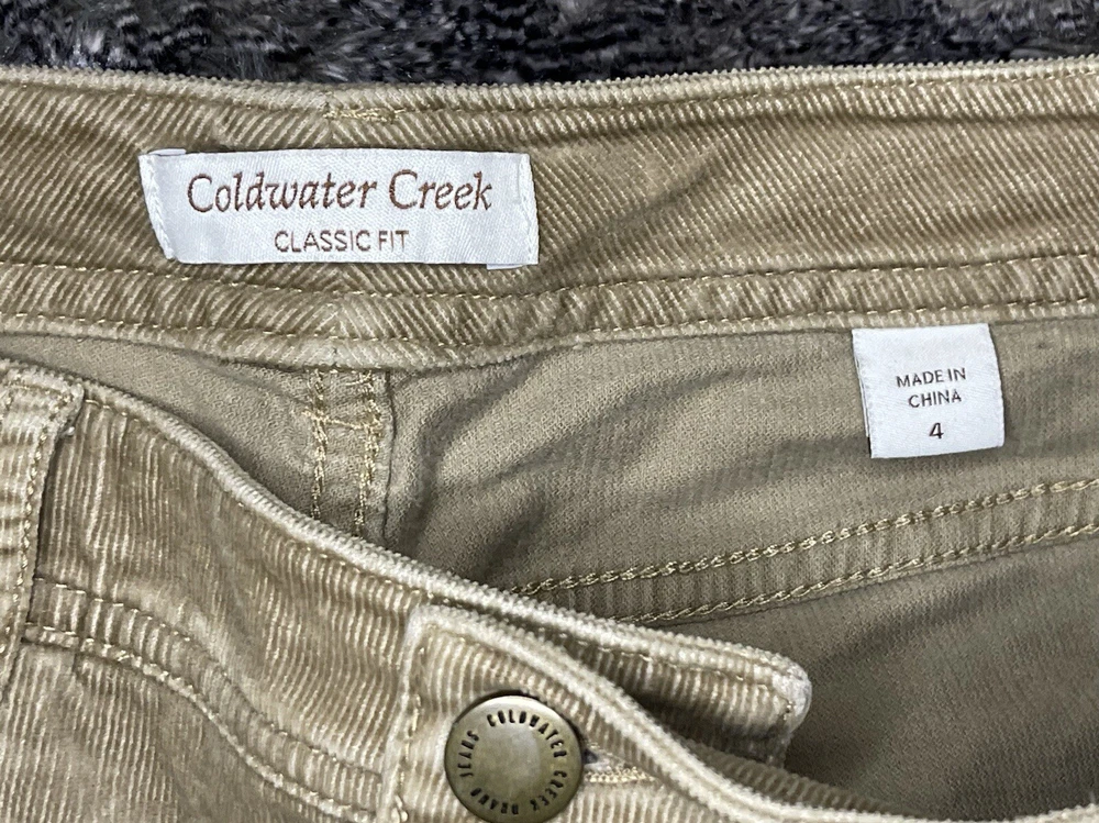 Elevate your wardrobe with these stylish and comfortable Coldwater Creek Whisper Corduroy Trouser Pants. These pants feature a flat front and a bootcut leg opening, with a high rise of greater than 10.5 inches. The pants are made of a spandex and cotton blend fabric, which provides a comfortable and stretchy fit. The pants come in a beautiful beige color and have five-pocket accents with button and zipper closures. The pants are perfect for any occasion, whether it be for travel, workwear, or a casual day out. The pants also have belt loops for easy styling. Add these pants to your collection for a classic and preppy look.