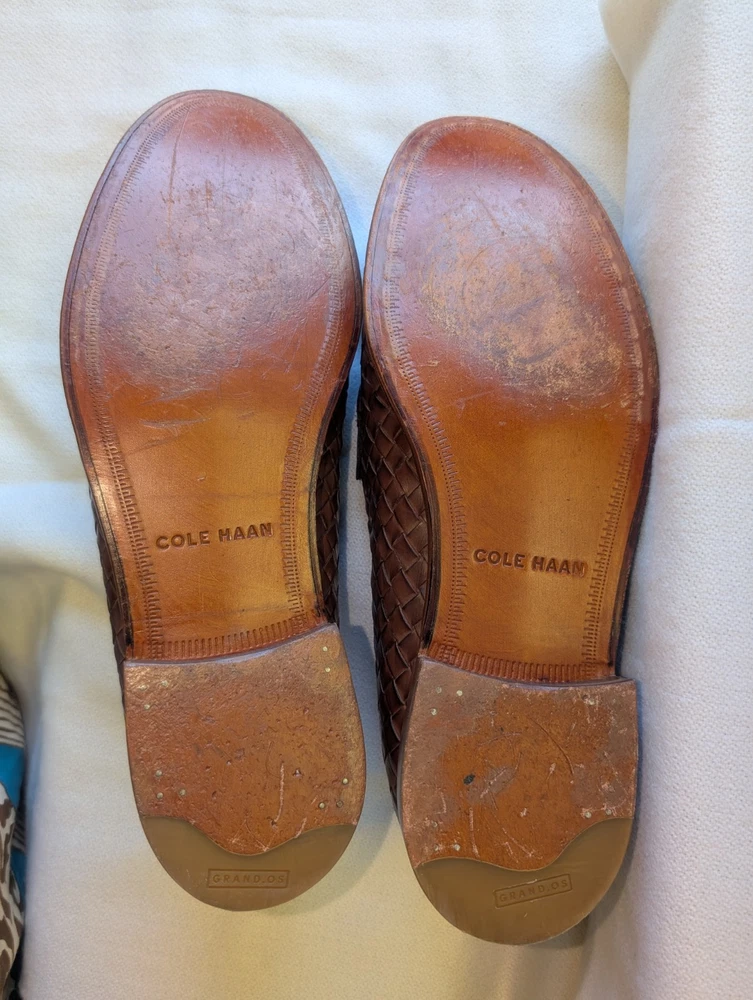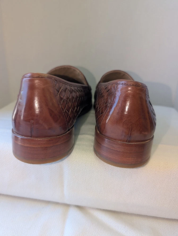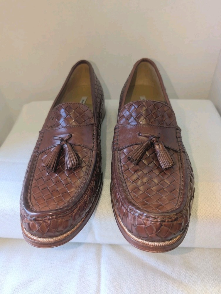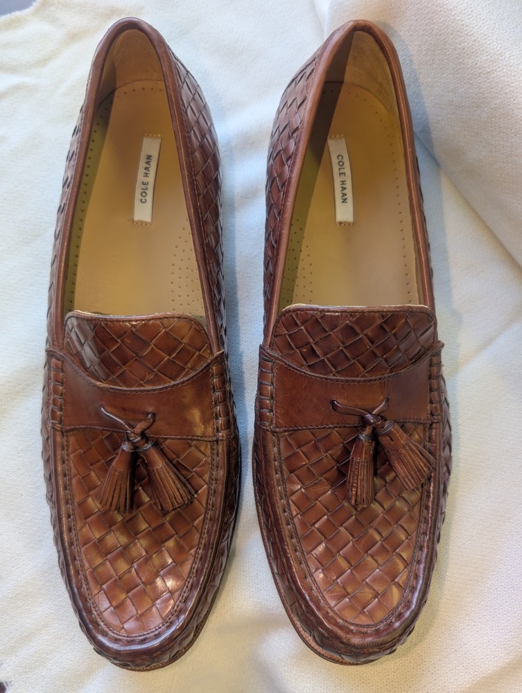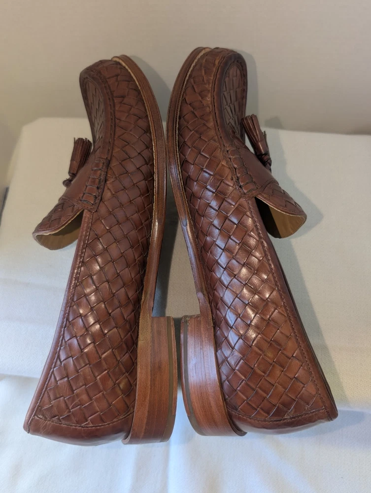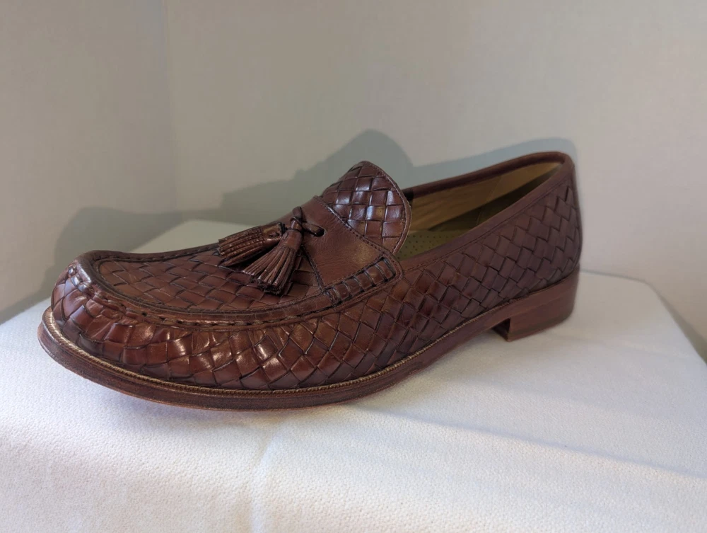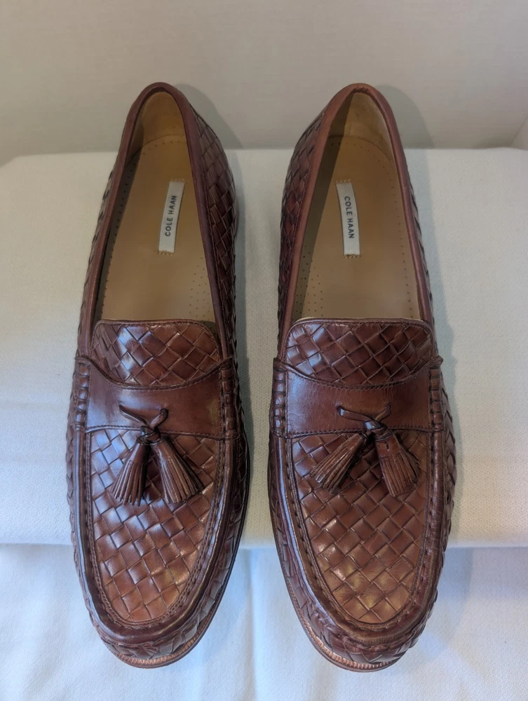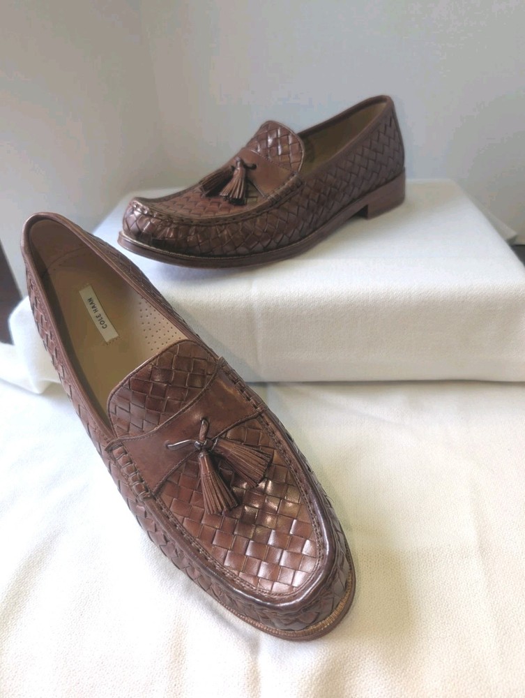 EXCELLENT CONDITION, WORN ONLY 1 X. The Cole Haan Basket weave Tassel Loafers in size 12 are stylish and comfortable dress shoes perfect for various occasions. Made with high-quality leather and featuring a slip-on closure, these loafers have a classic round toe shape with tasseled accents for a touch of sophistication. With a cushioned and breathable insole, these loafers are designed for all-day wear and can be worn in all seasons. The solid brown color and leather lining make them versatile for both casual and formal outfits, making them a great addition to any man's shoe collection.