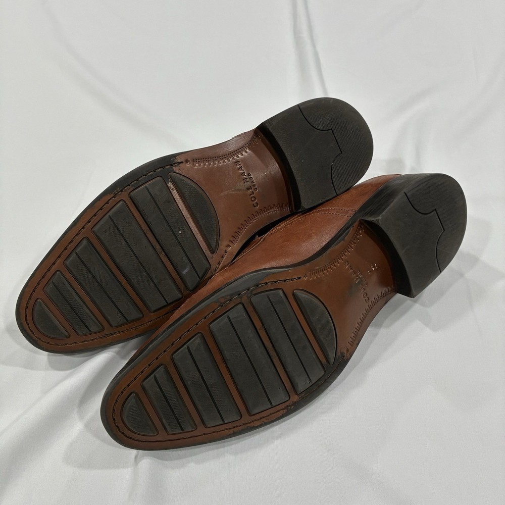The Cole Haan Classic Hawthorne Brown Penny Loafers in size 11 for men are a stylish and versatile choice for dressy occasions. Made from 100% leather, these solid brown loafers feature a cushioned insole for added comfort. The timeless penny loafer style is perfect for the seasons of summer, fall, and spring, making them a classic addition to any man's wardrobe.