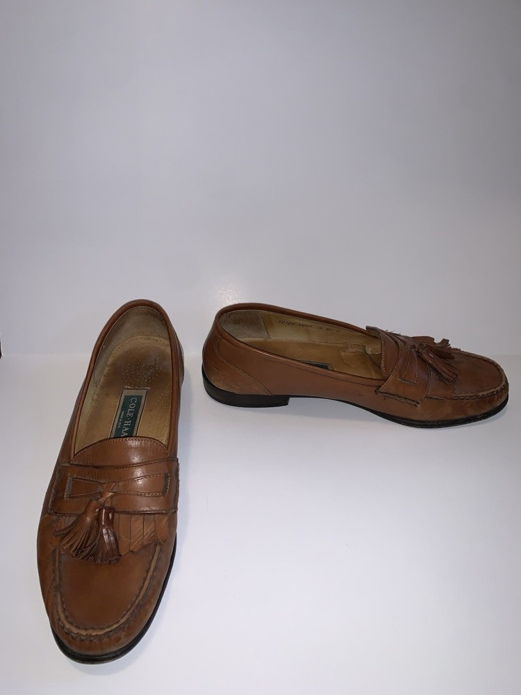The Cole Haan Men's Brown Leather Kiltie Tassel Loafers are a stylish and classic slip-on option for men. Made in the USA with genuine leather, these loafers feature a round toe shape and tasseled accents. The vintage design adds a touch of preppy and designer style to your wardrobe, making them a versatile choice for any season. With a solid brown color and a comfortable leather lining and insole, these loafers are perfect for a dressy look or smart-casual outfit.