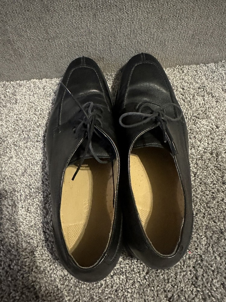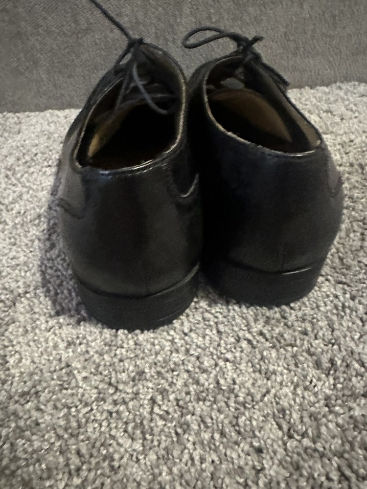 Elevate your formal attire with these Cole Haan black leather oxford dress shoes. Crafted with premium leather, these shoes feature an almond toe shape and lace-up closure for a sleek and polished look. The wingtip design and solid pattern add a touch of sophistication, making them perfect for any dressy occasion. These shoes are available in US size 11 and UK size 10, with a medium shoe width. The rubber outsole provides excellent grip and durability, while the leather lining and insole ensure comfort and breathability. Add these timeless shoes to your collection and step out in style. Preowned Good Condition