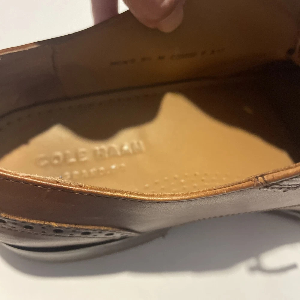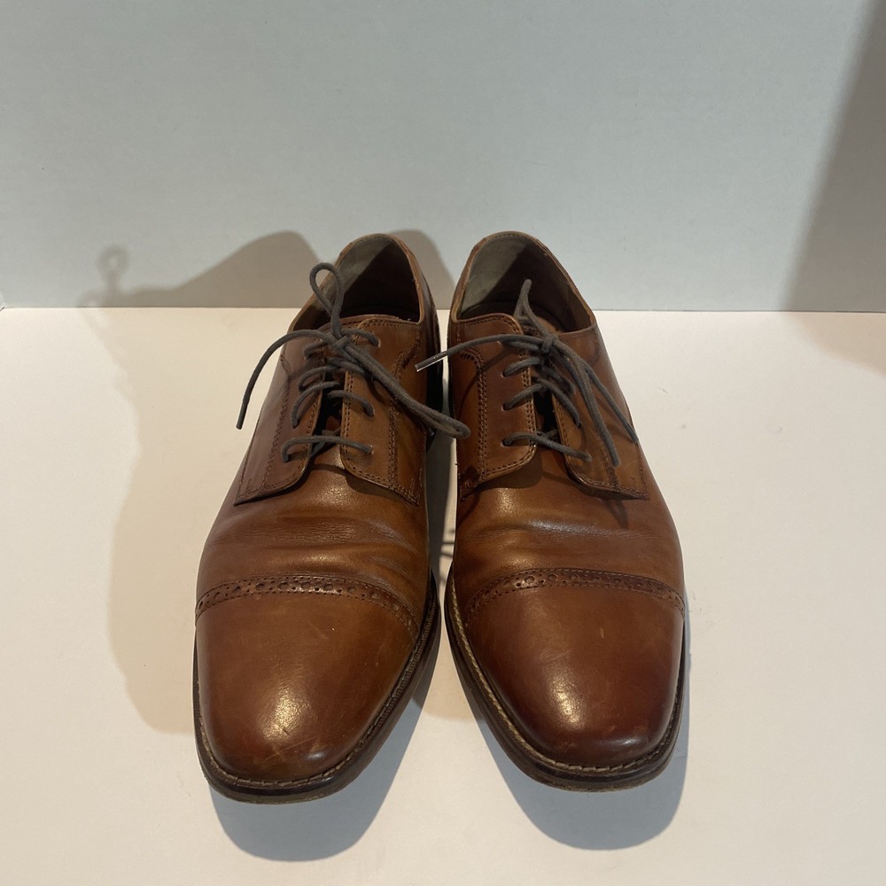 The product is a pair of Cole Haan Men's Brown Leather Oxfords Shoes in size 9.5. These shoes feature an almond toe shape, lace-up closure, and wingtip accents. Made of leather with a leather lining, they are stylish and versatile for any season. The shoes also have a solid brown color with a classic Oxford style, perfect for a city-themed look. The Cole Haan brand is known for quality and sophistication, making these shoes a great addition to any man's wardrobe.