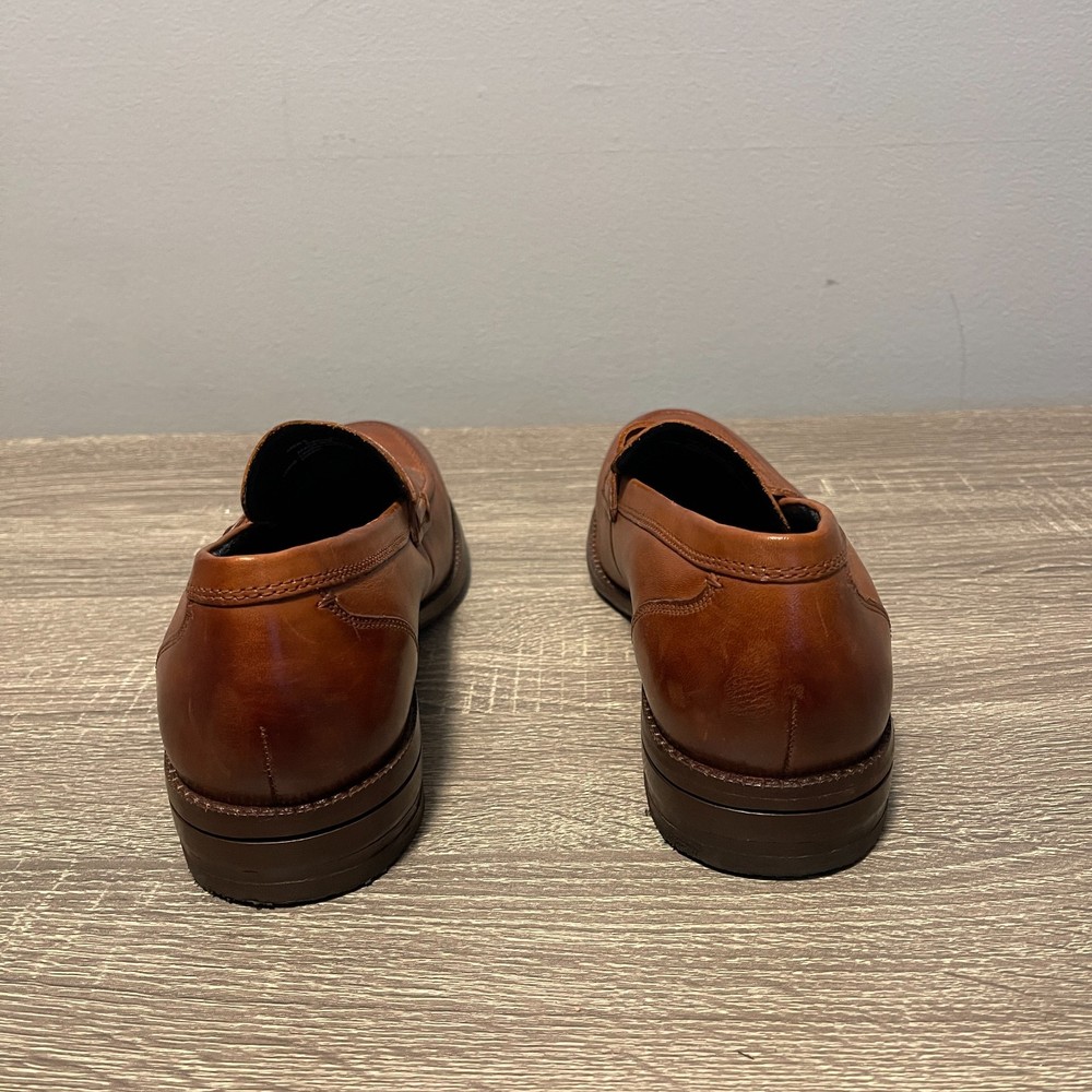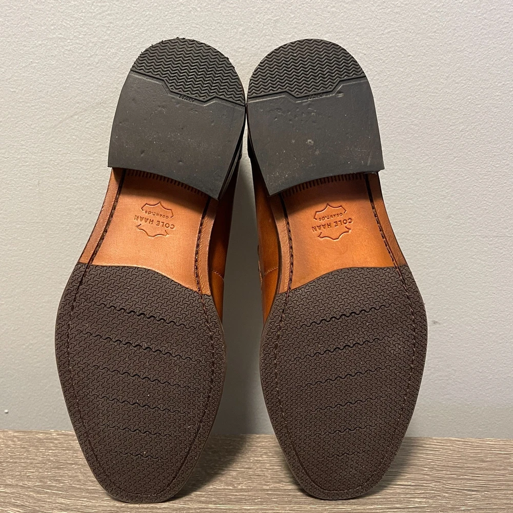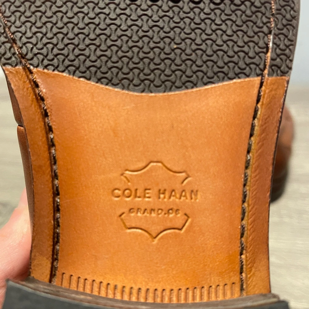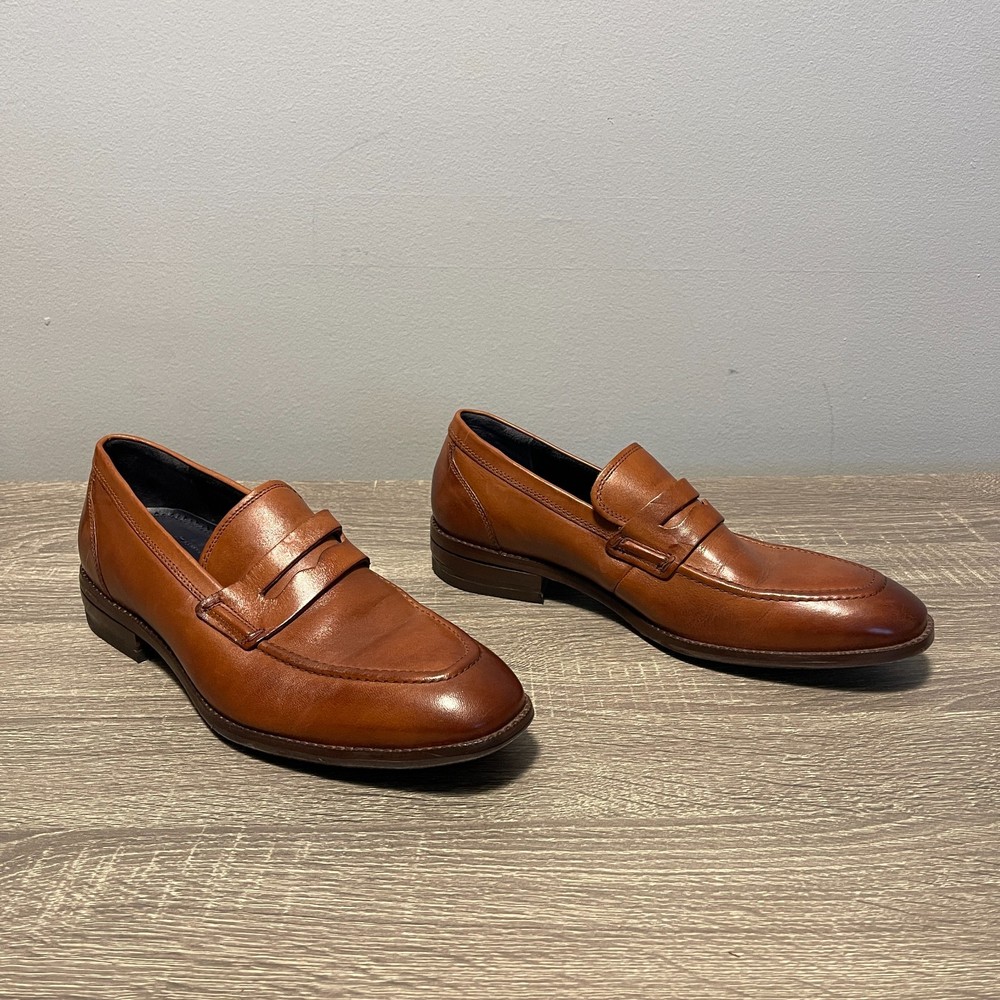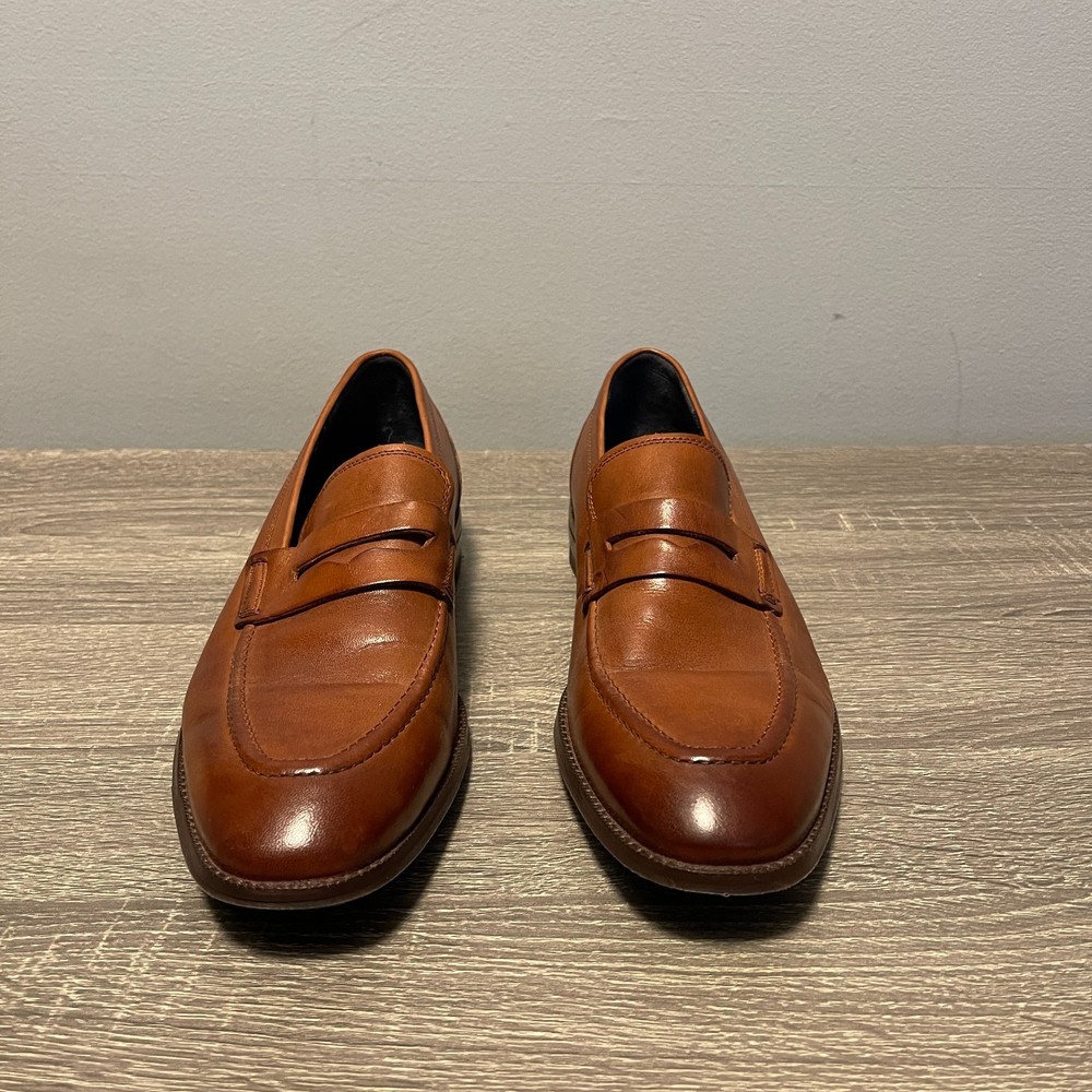 The Cole Haan Men's Grand 360 Warner Grand Penny Loafer in Brown is a stylish and sophisticated dress shoe for men. Featuring an almond toe shape and a slip-on closure, these loafers are crafted with leather lining and outsole material. The classic brown color and leather upper make them versatile for various seasons such as summer, fall, and spring. The Cole Haan Grand product line ensures quality and comfort, making these loafers a great addition to any man's wardrobe.