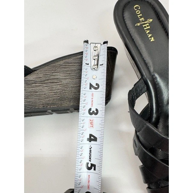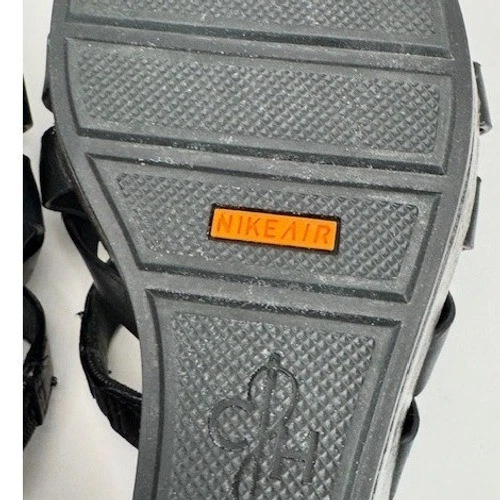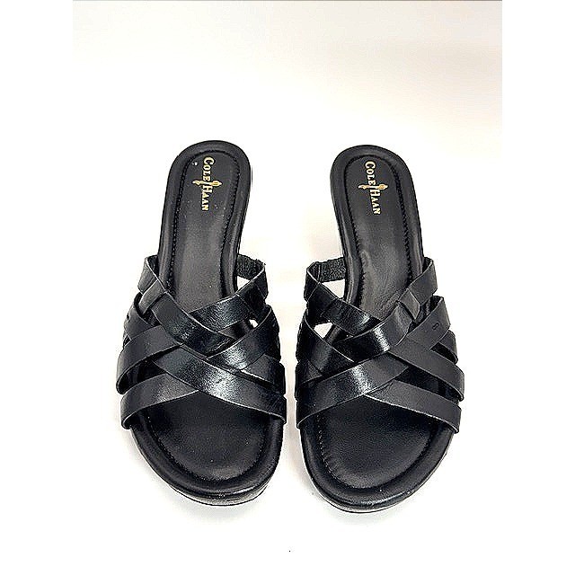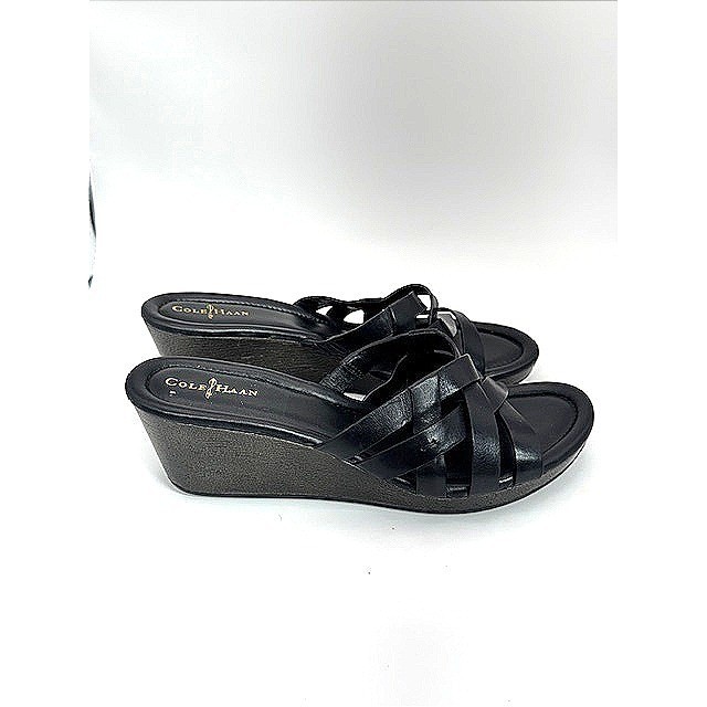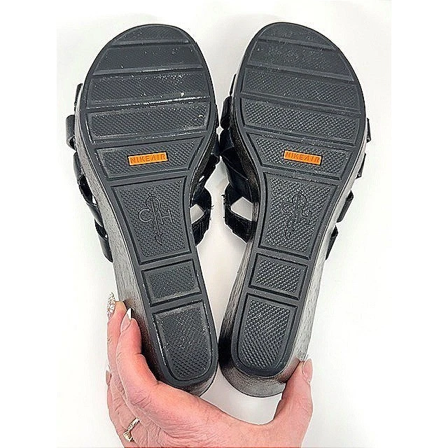 Cole Haan Nike Air wedge sandals combine classic style with athletic-inspired comfort. These black leather slides feature a sophisticated strappy caged upper and a sturdy wedge heel for a boost in height without sacrificing stability. The outsoles are equipped with Nike Air technology for superior cushioning, making them ideal for all-day wear. Finished with a textured rubber sole for reliable traction, these versatile sandals pair perfectly with everything from summer dresses to casual denim.
