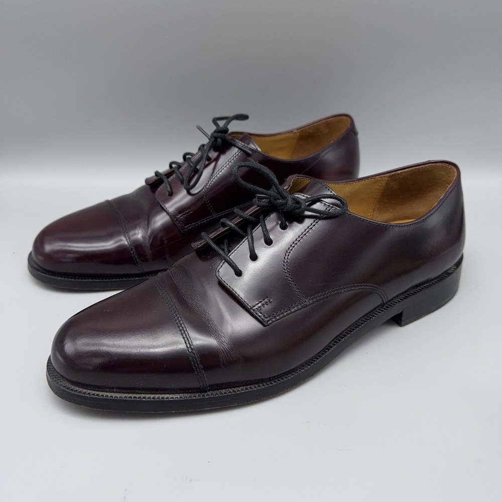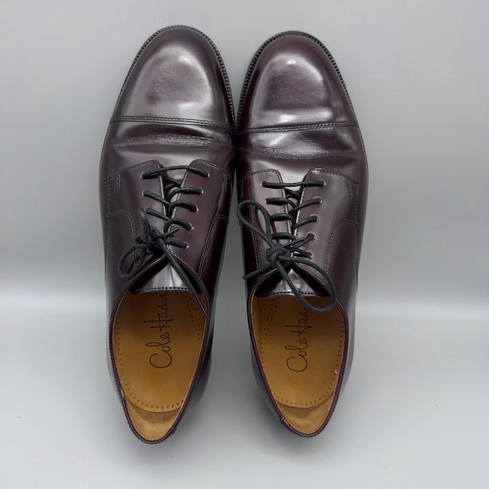 Cole Haan Shoes Mens Size 9 Burgundy Cap Toe Oxford Leather Dress Formal Lace Up Previously worn pair. Leather uppers are clean with light creasing and a few small surface scuffs. Leather soles show moderate wear and darkening at forefoot and heels but remain solid; laces and interiors intact. Brand: Cole Haan Style: Mens cap toe oxford dress shoes with closed lacing and sleek round toe. Color: Burgundy / oxblood. Size: Mens 9D as stamped on interior. Materials: Leather uppers, leather outsoles with rubber heel caps, leather lining and insole. Country of manufacture: Made in India. Style/Model codes printed inside: 08331 ULD and 500640 07 467. Details: Five-eyelet lace-up closure, cap toe design, stacked heel, Cole Haan script logo on insole and outsole. 659 Measurements: - Previous washings may change the sizing written on the tag. - Please refer to the photos above for all measurements. - Please compare our measurements to that of one of your favorite garments. - Please note, item measurements are approximate . All items are bagged and sealed after being photographed, then stored in a smoke free environment to ensure the item is exactly the same as when photographed. All items have been cleaned per eBay standards & policies. I carefully package and ship daily. Feel free to contact me with any questions.