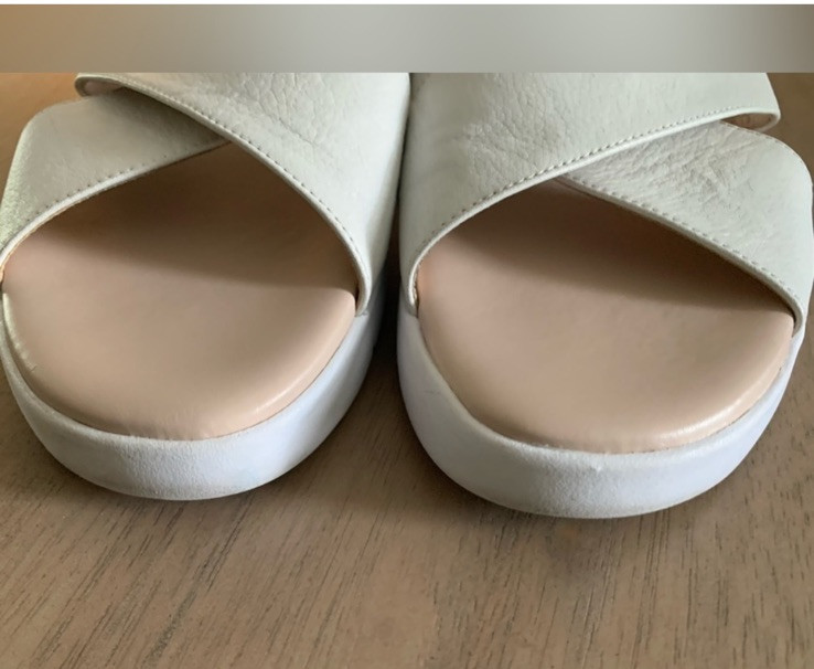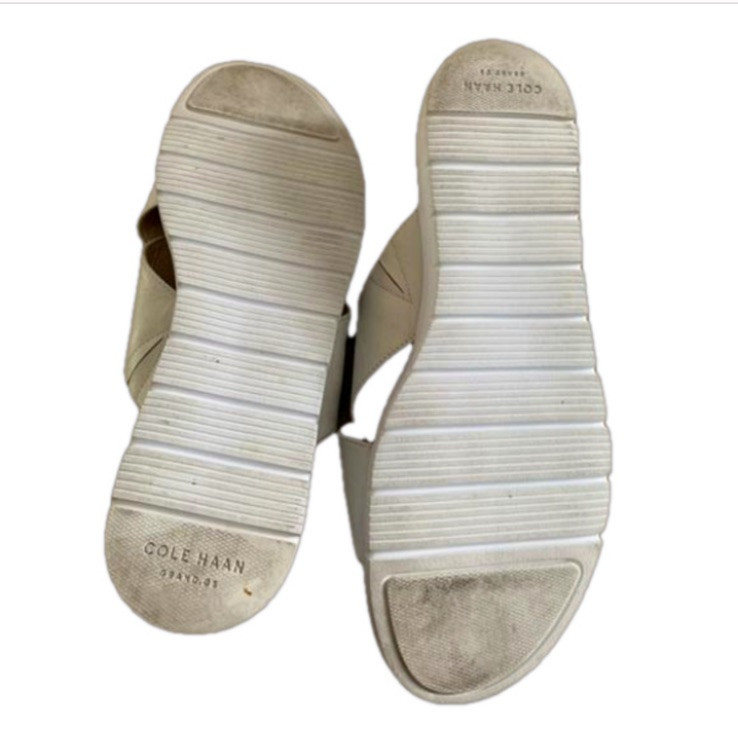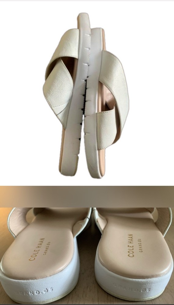 Cole Haan Grandpro Criss Cross slide comfort sandals. Creamy white leather uppers with cushy footbed. #C6