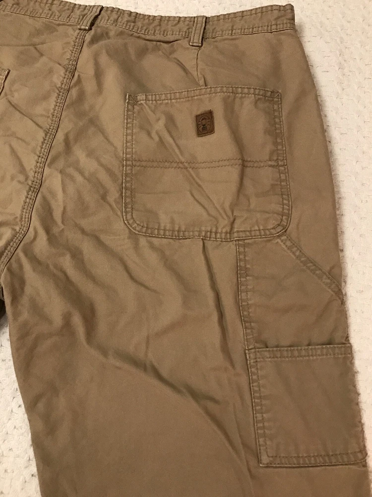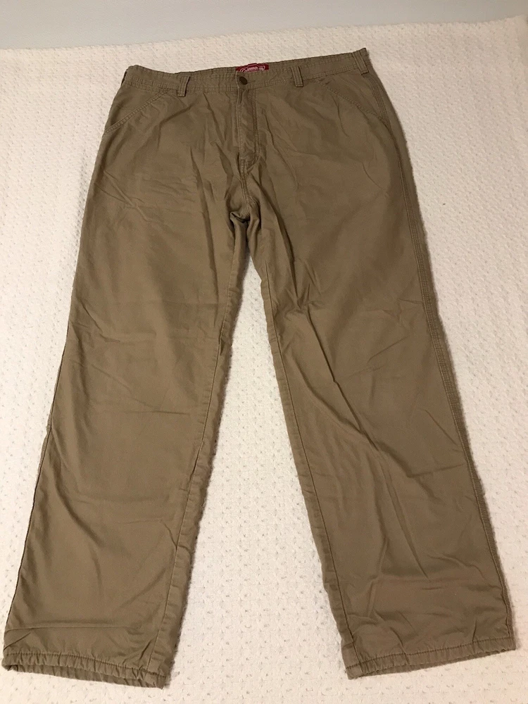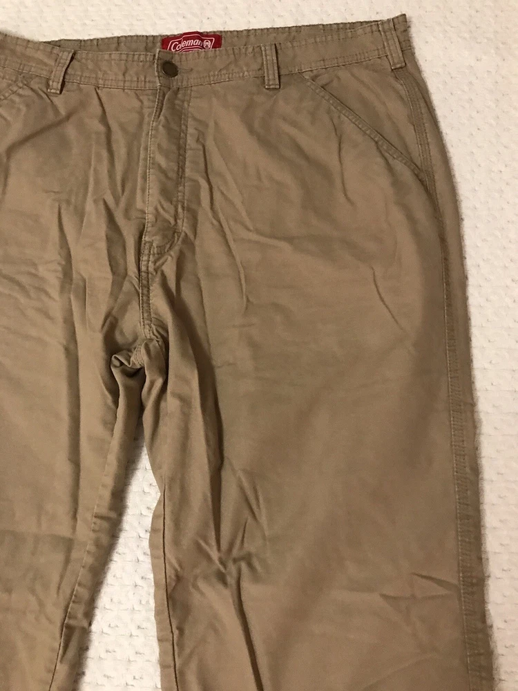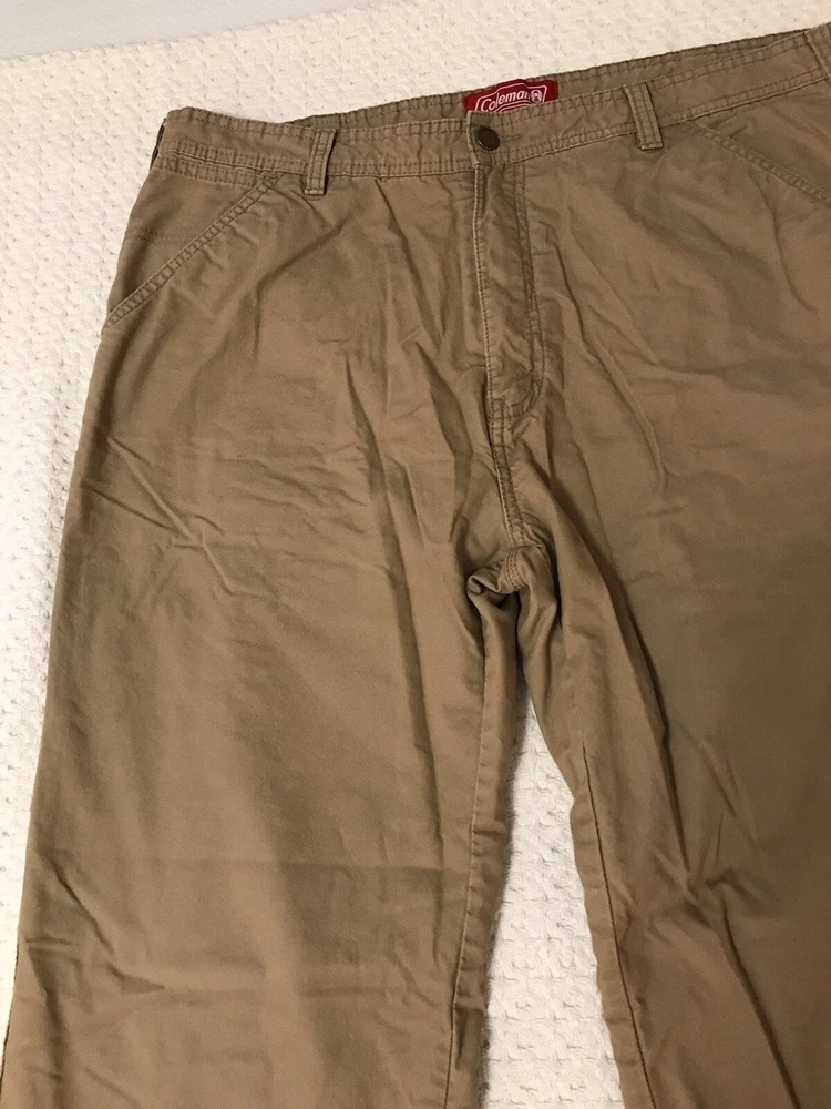 These Coleman work pants are perfect for any outdoor adventure, whether it be hiking, trekking, camping or just enjoying nature. The pants are made of a comfortable and durable polyester-cotton blend with a solid pattern and a fleece lining to keep you warm during the colder seasons. The 5-pocket design provides ample storage for all your belongings and the flat front and straight leg style offer a classic and versatile look. The pants have a zip closure and a waist size of 38 inches, with an inseam of 30 inches. Garment tag shows an inseam of 32 inches, but the measurements show an actual inseam of 30 inches. Rise is 12 inches. They come in a khaki tan color and feature easy care and comfort, making them suitable for travel, casual wear and workwear occasions. This is a great addition to any outdoor enthusiast's wardrobe. In a smoke free home. No tears or holes.