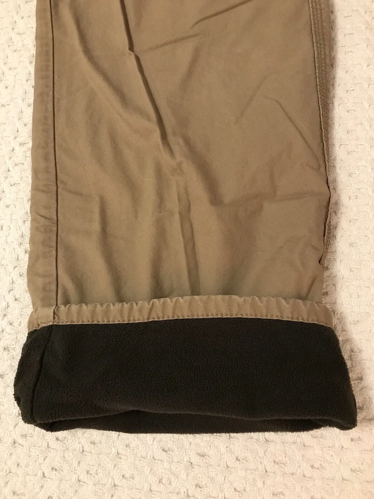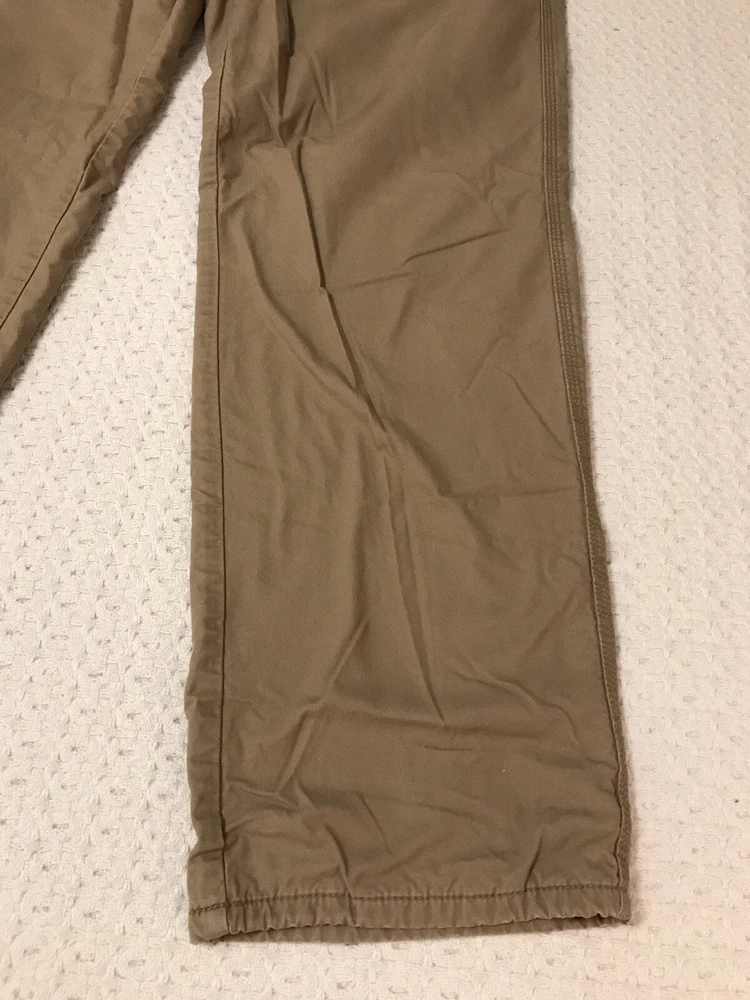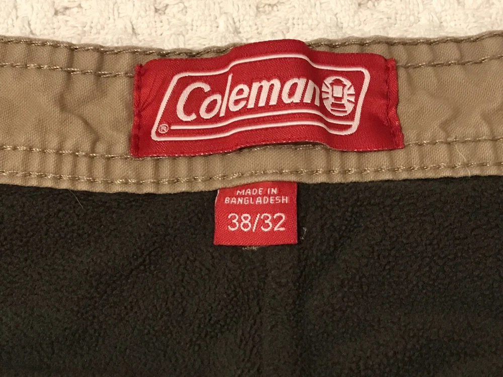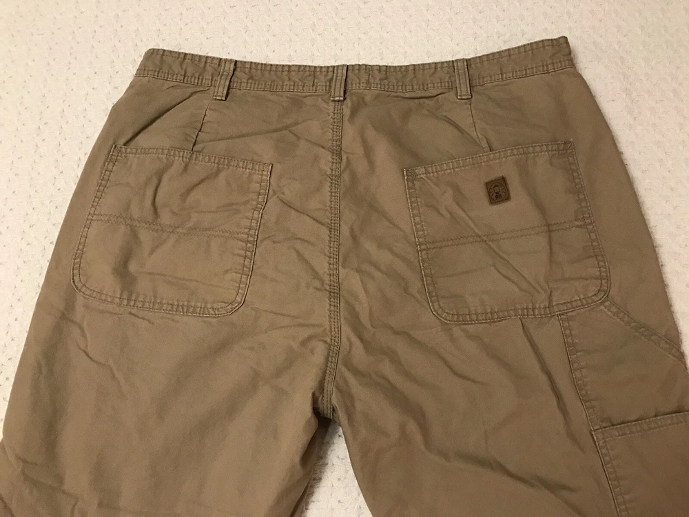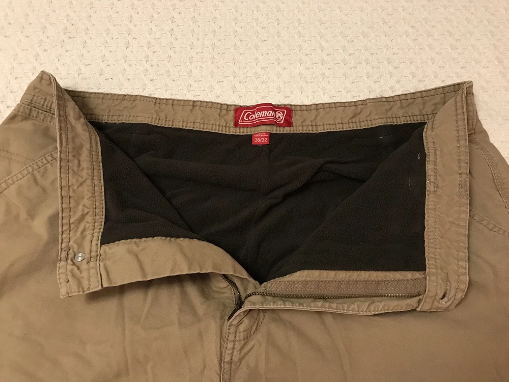 These Coleman work pants are perfect for any outdoor adventure, whether it be hiking, trekking, camping or just enjoying nature. The pants are made of a comfortable and durable polyester-cotton blend with a solid pattern and a fleece lining to keep you warm during the colder seasons. The 5-pocket design provides ample storage for all your belongings and the flat front and straight leg style offer a classic and versatile look. The pants have a zip closure and a waist size of 38 inches, with an inseam of 30 inches. Garment tag shows an inseam of 32 inches, but the measurements show an actual inseam of 30 inches. Rise is 12 inches. They come in a khaki tan color and feature easy care and comfort, making them suitable for travel, casual wear and workwear occasions. This is a great addition to any outdoor enthusiast's wardrobe. In a smoke free home. No tears or holes.