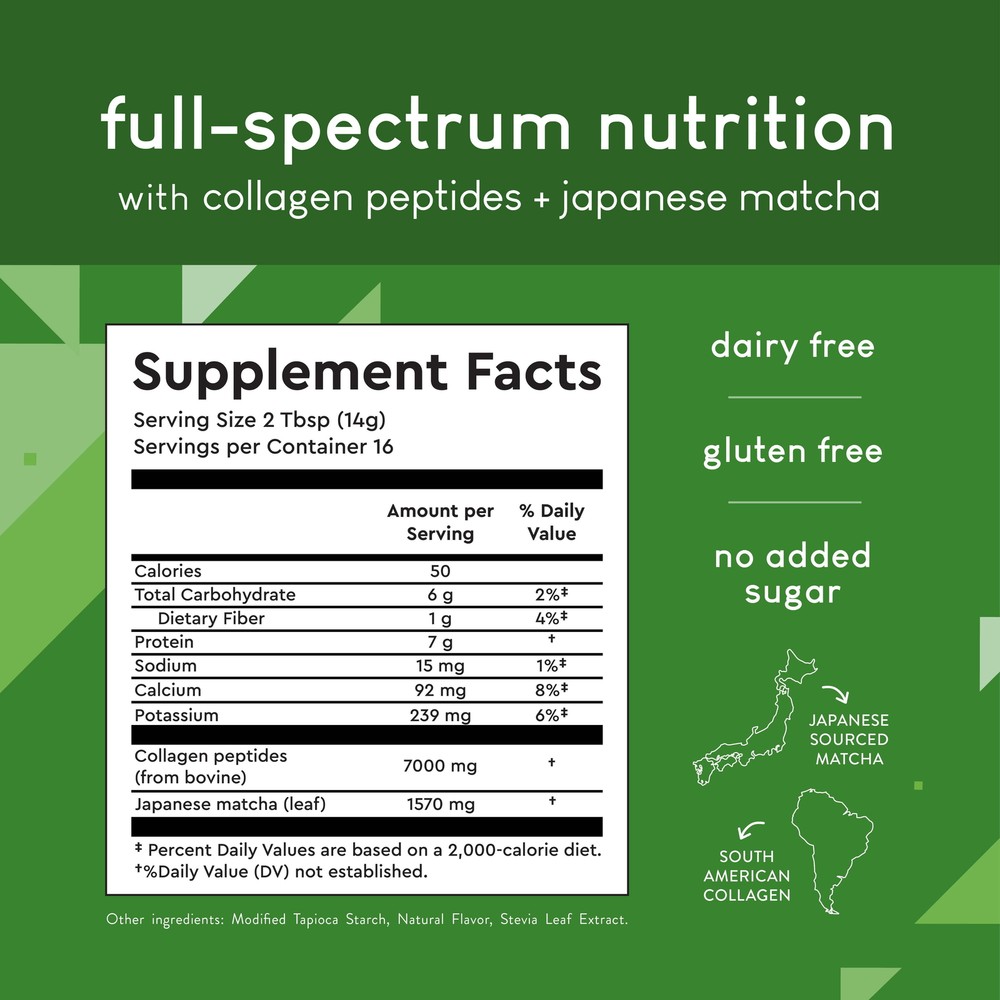 π€― FULL-SPECTRUM NUTRITION: 7,000 mg protein and 20 amino acids per serving. Our hydrolyzed collagen is like a repair serum for your body. β¨ HEALTHY HAIR, SKIN, AND NAILS: Collagen promotes skin elasticity, radiant hair, and strong nails. π΅ JAPANESE MATCHA: Green tea powder provides a relaxed focus without the crash that comes from coffee. Also rich in healthy antioxidants. 10 mg caffeine per serving. π EASY TO USE: This powdered collagen drink mix blends easily into water, milk, juice, lattes, or smoothies. Easily digested for quick absorption into the body. π€― FULL-SPECTRUM NUTRITION: 7,000 mg grass-fed South American collagen per serving, providing natural protein and 20 amino acids. Our hydrolyzed collagen is like a repair serum for your body. β¨ HEALTHY HAIR, SKIN, AND NAILS: Collagen promotes skin elasticity, radiant hair, and strong nails. π΅ PREMIUM JAPANESE MATCHA: Green tea powder provides a relaxed focus without the crash that comes from coffee. Also rich in healthy antioxidants. Approx. 10 mg caffeine per serving. π EASY TO USE: This powdered collagen drink mix blends easily into water, milk, juice, lattes, or smoothies. Easily digested for quick absorption into the body.