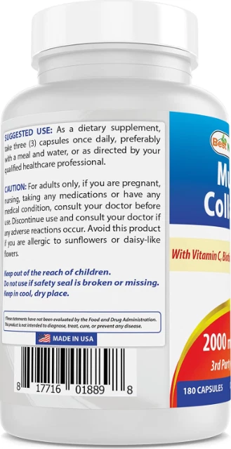 Collagen Peptides Pills 2000mg Hydrolyzed Collagen Capsules (Types I,II,III,V,X) US Warehouse - FREE & FAST Shipping in US Product Description: These statements have not been evaluated by the FDA. This product is not intended to diagnose, treat, cure, or prevent any disease or health condition. 3rd Party Lab Tested for Purity & Quality. Made with Bovine Collagen, Chicken Collagen, Fish Collagen, Eggshell Collagen, Vitamin C, Biotin, Hyaluronic Acid Non-GMO & Gluten Free. Proudly Made in USA, GMP Compliant, FDA Registered Facility. No Artificial Color, Flavor or Sweetener, No Preservatives, No Sugar, No Milk, No Corn, No Soy, No Egg, No Lactose, No Gluten, No Wheat, No Yeast. Sodium Free. Feedback: 1.Any question for your order, please contact us in time, we will reply to you within 24 hours and give you a satisfactory answer. 2.If you are satisfied with our products and services, hope to take up your a little precious time to leave feedback reviews for our products.Thanks! 3.Your satisfaction is our effort. Welcome to order again! Have a great day! Our Policy: 100% Satisfaction Guarantee 20% of restocking fee will be charged for return item