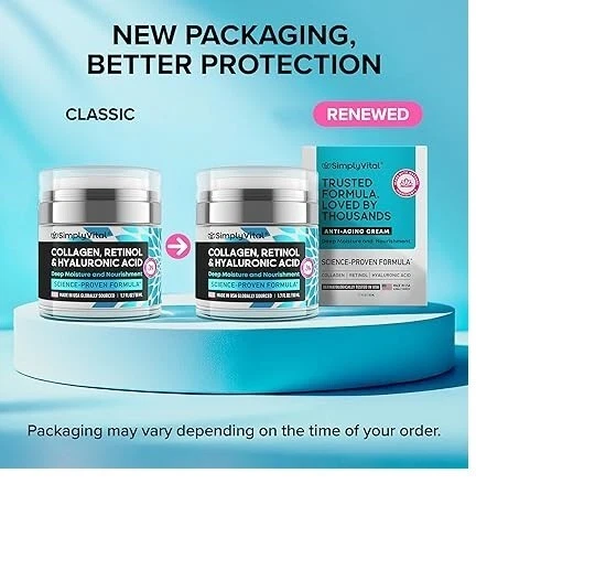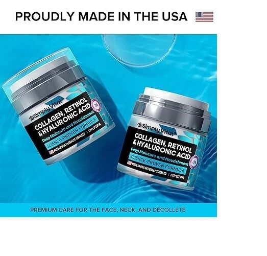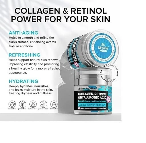 Collagen, Retinol & Hyaluronic Acid Cream - Anti-Aging Face Moisturizer for Face Product Description: Nourishing Face Moisturizer — Enhance your anti-aging skincare routine with this moisturizing face cream, designed to help your skin feel smooth and refreshed. Collagen supports skin's flexibility while promoting a firmer texture for both face and neck. Enjoy a youthful glow with a gentle solution that provides enduring hydration and care. How to Use - Apply a small amount to clean, dry skin, massaging until absorbed. Start 1-2 times a week for sensitive skin, then increase as needed. Use daily for optimal results. Always apply SPF 30+ during the day, as retinol may heighten sun sensitivity. Perform a patch test before initial use. Consult a dermatologist before use. Individual sensitivity to components is possible. Advanced Retinol Face Cream – Formulated with a balanced concentration of retinol, this moisturizer encourages skin renewal for a smoother, refreshed appearance. Hyaluronic acid complements retinol to help maintain hydration, leaving skin feeling soft and nourished without tightness. Perfect for a well-rounded skincare routine. Proudly Made in the USA – Simply Vital guarantees exceptional quality in each jar. We carefully select effective yet gentle components to create potent formulas, ensuring your skin gets the attention it deserves while enhancing your natural elegance. All our products are crafted in the USA, adhering to the highest manufacturing standards.